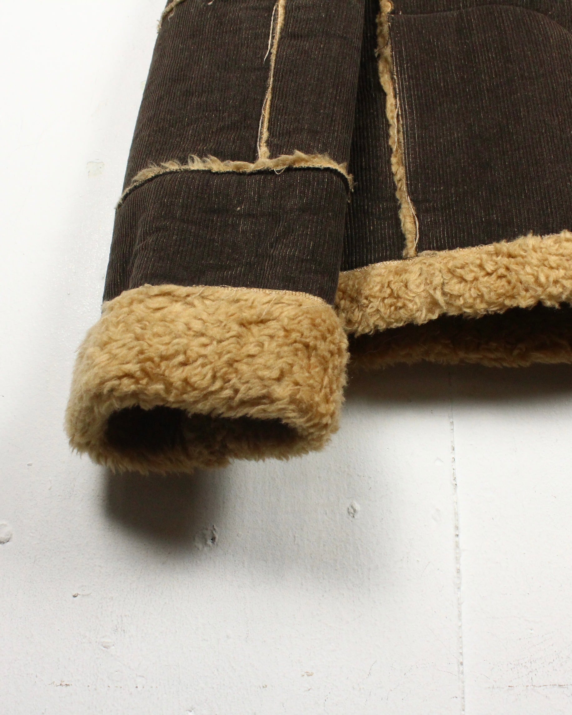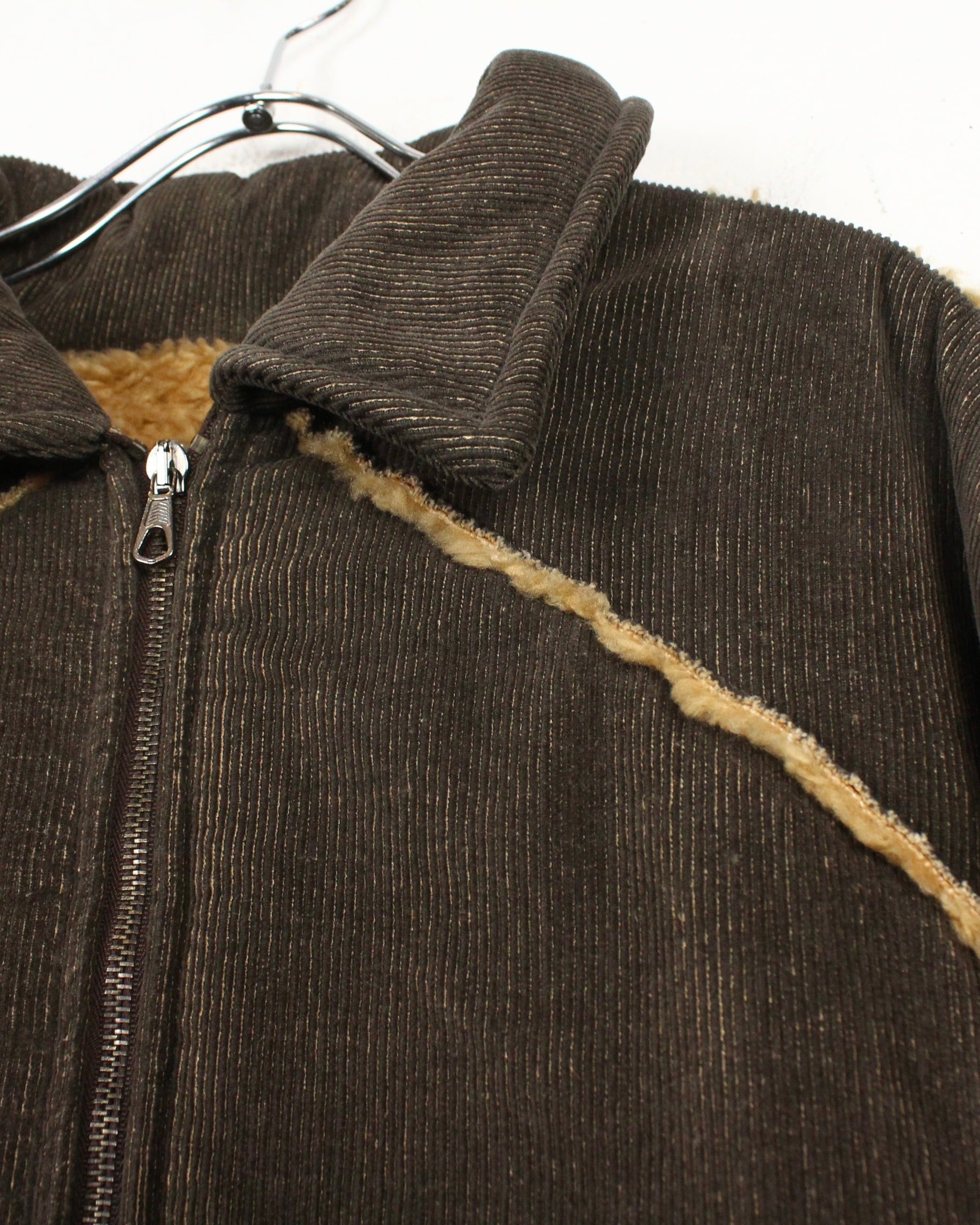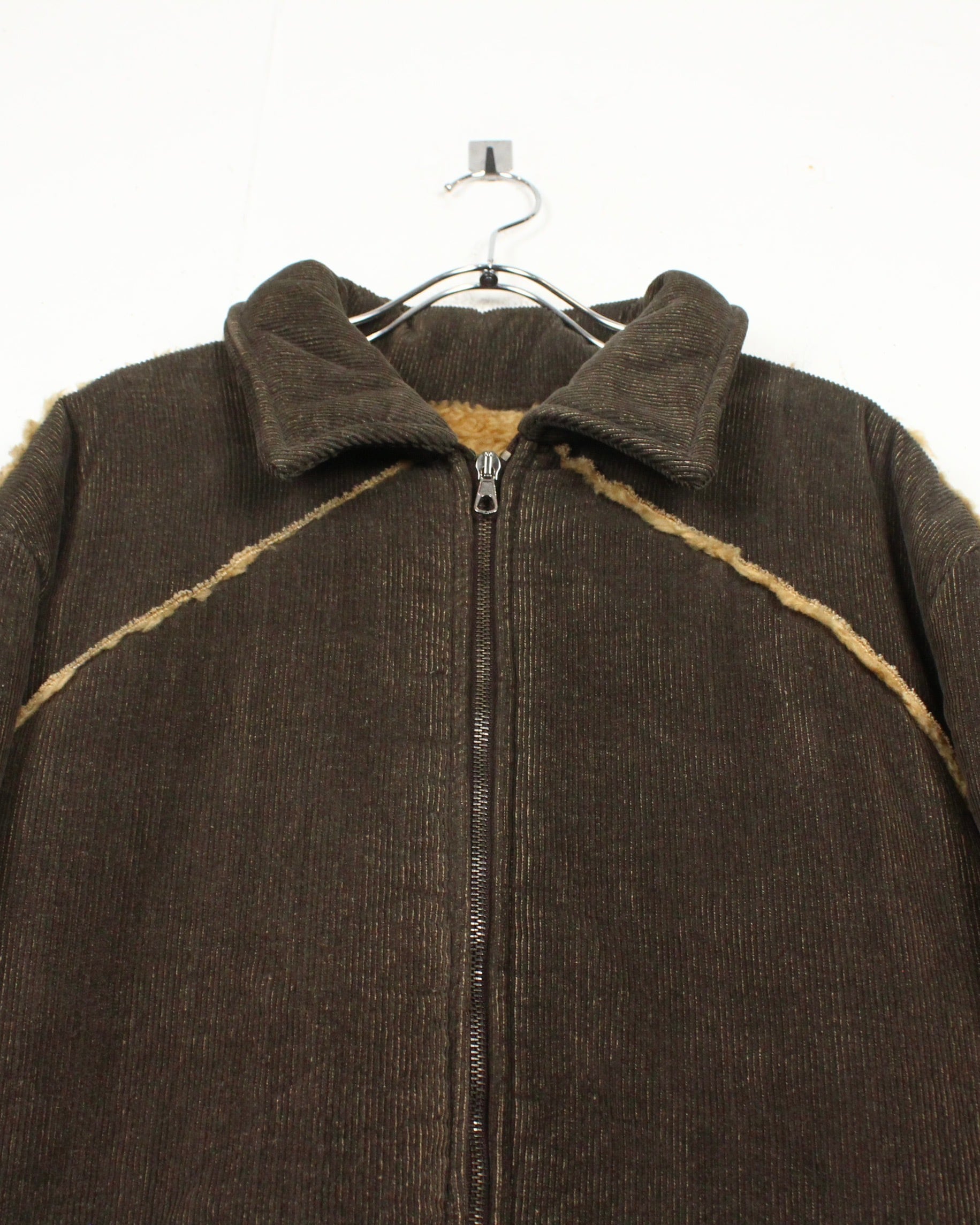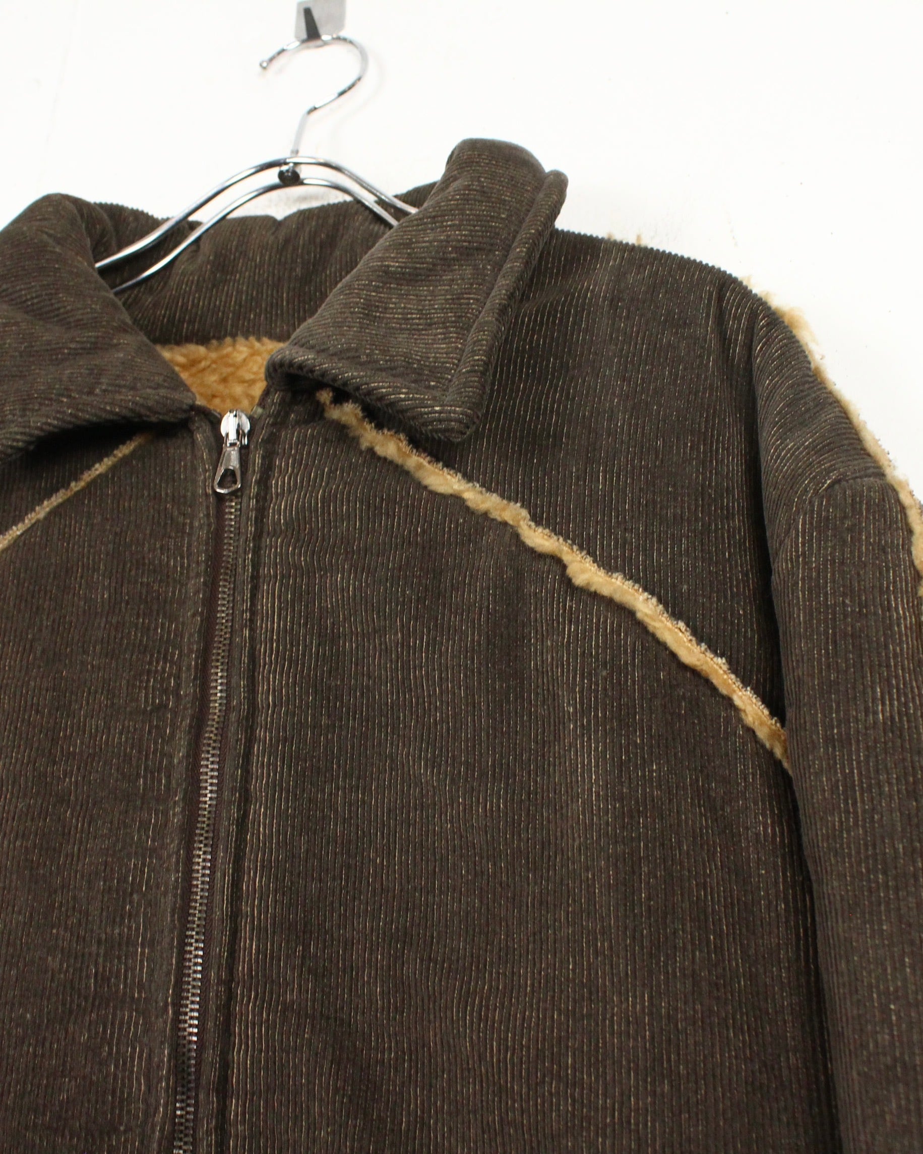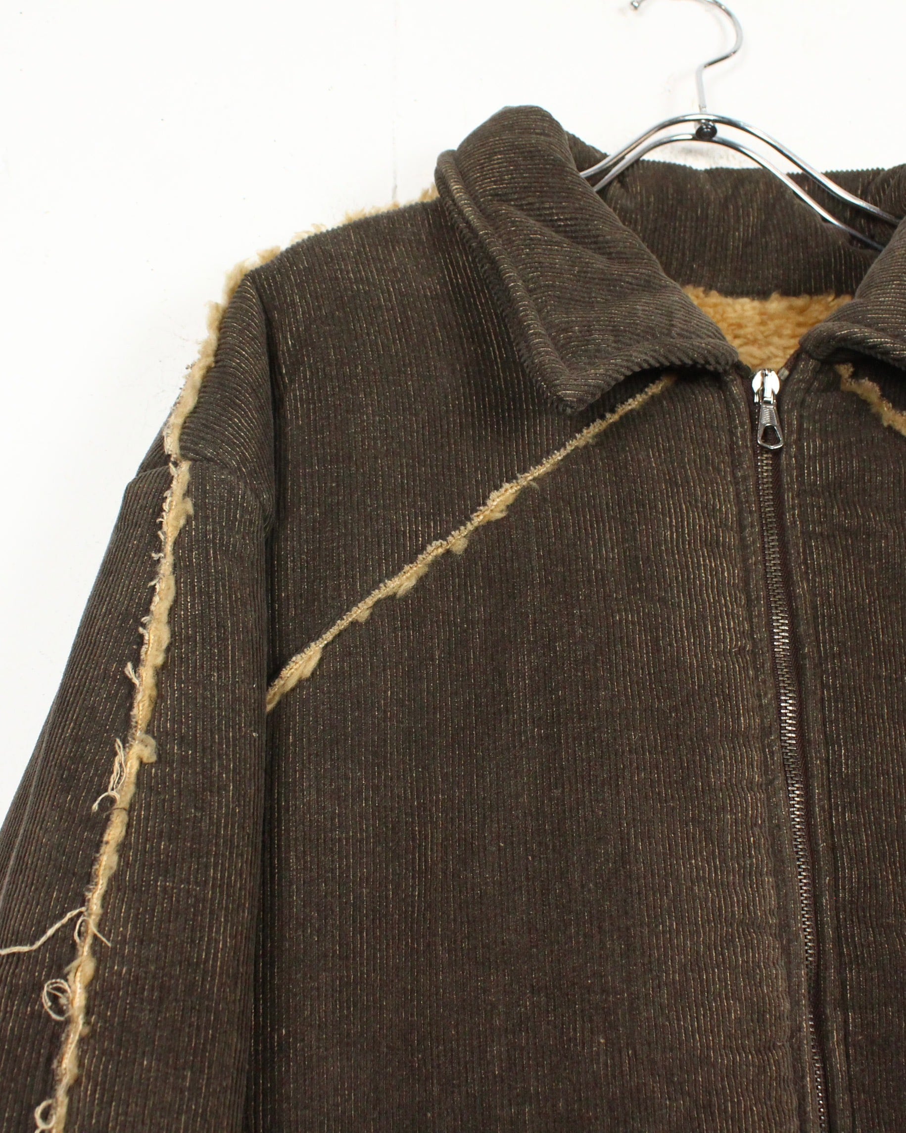 深いブラウンのコーデュロイボディに、断ち切り仕様でボアを覗かせた大胆な切り替えが映える1着。