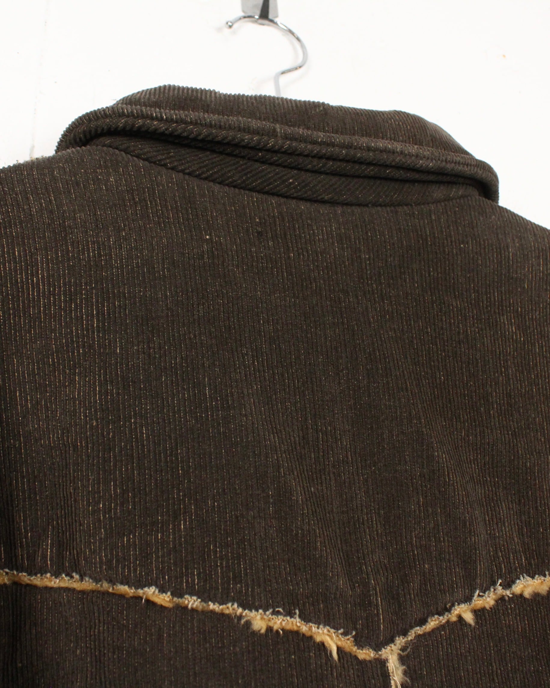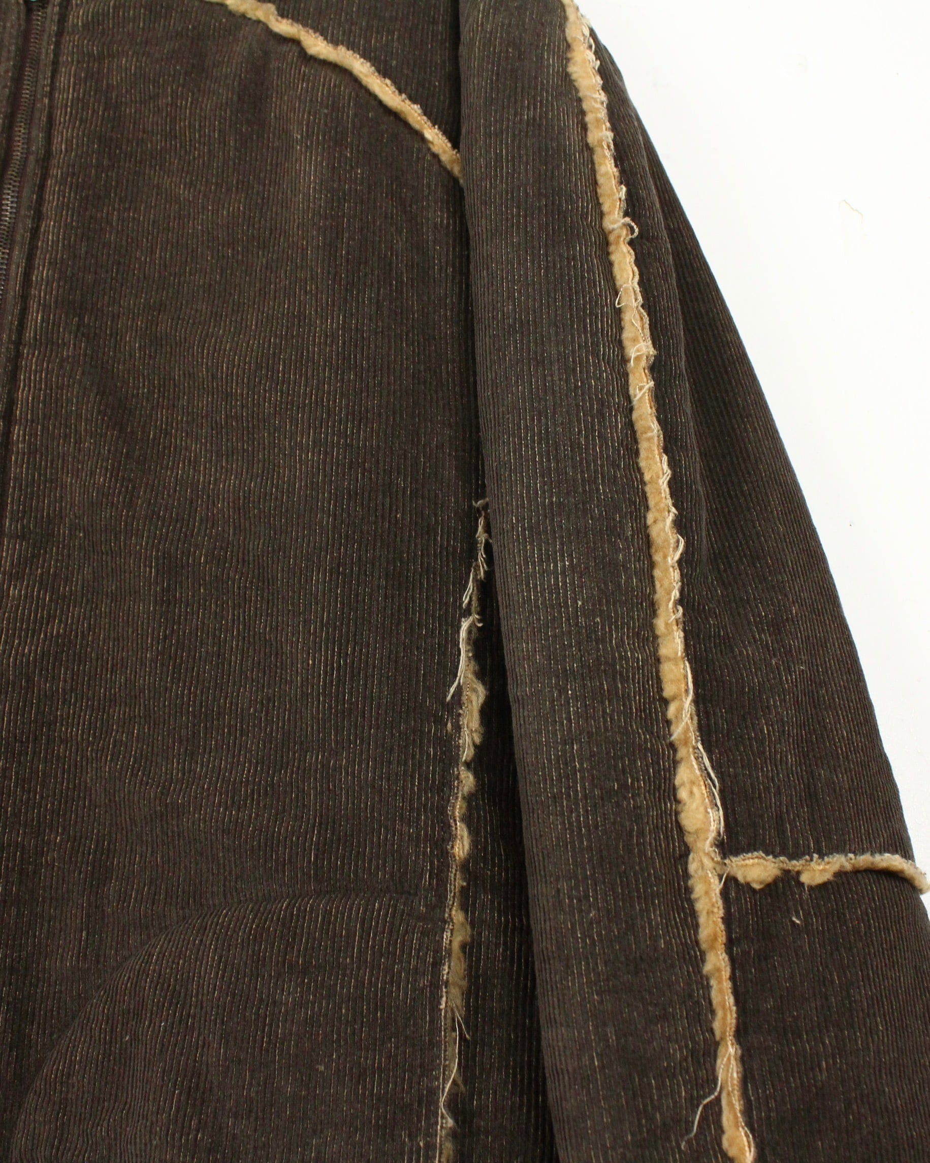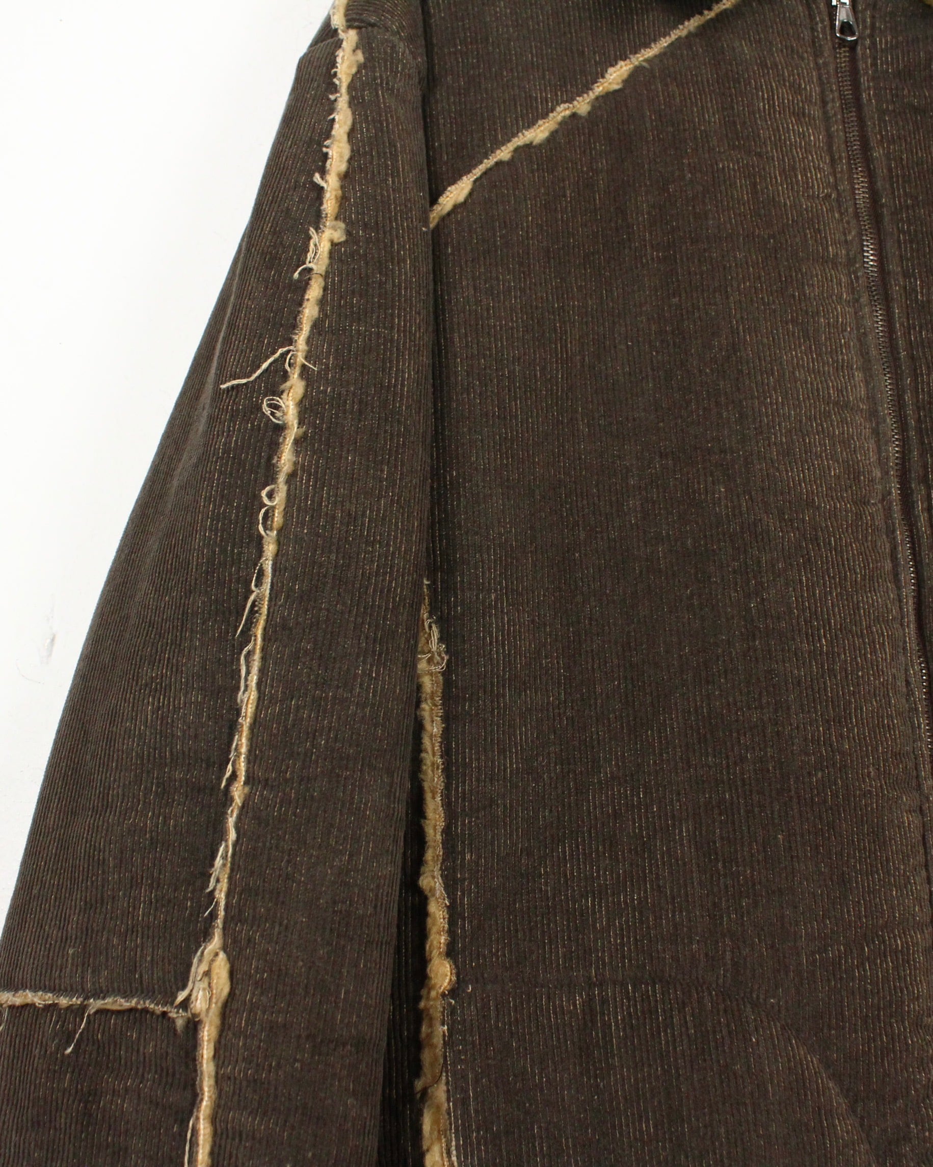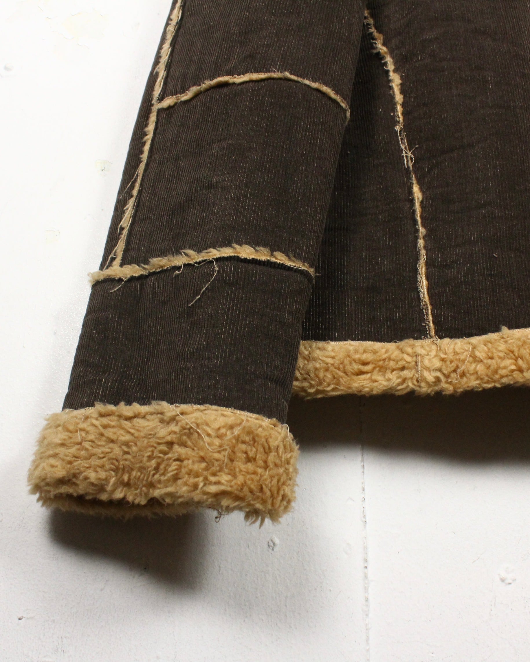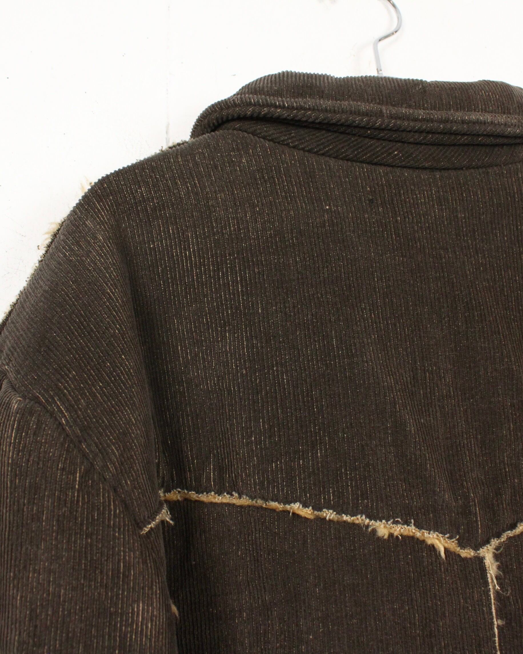 深いブラウンのコーデュロイボディに、断ち切り仕様でボアを覗かせた大胆な切り替えが映える1着。