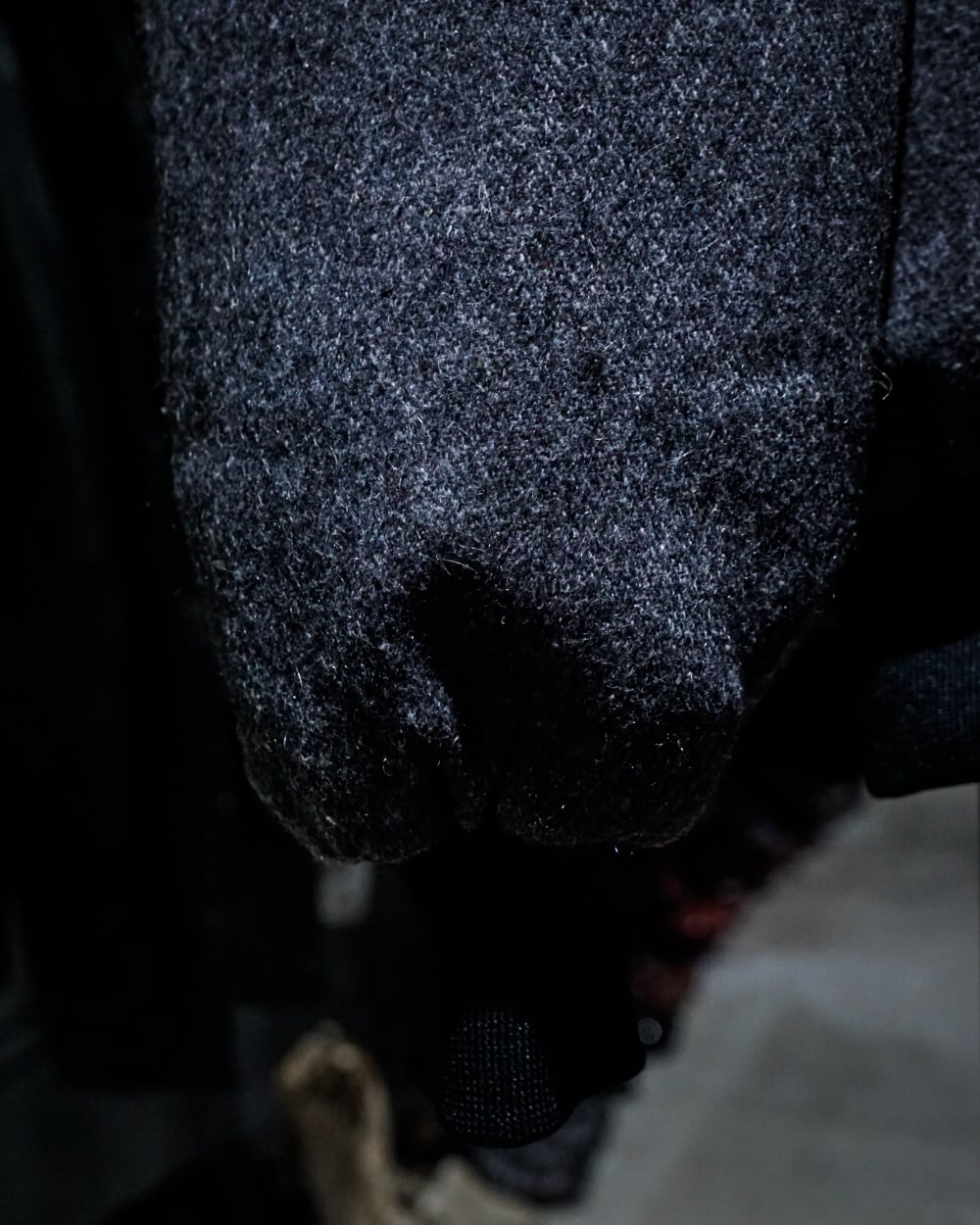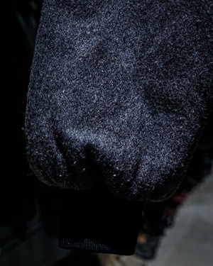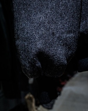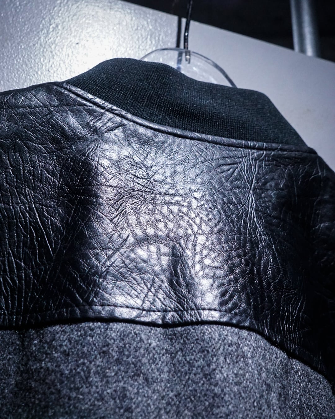 肩や袖にあしらわれたレザー切り替えはシボ感の強い表情豊かな質感で、ボディのメルトン生地とのコントラストが秀逸。