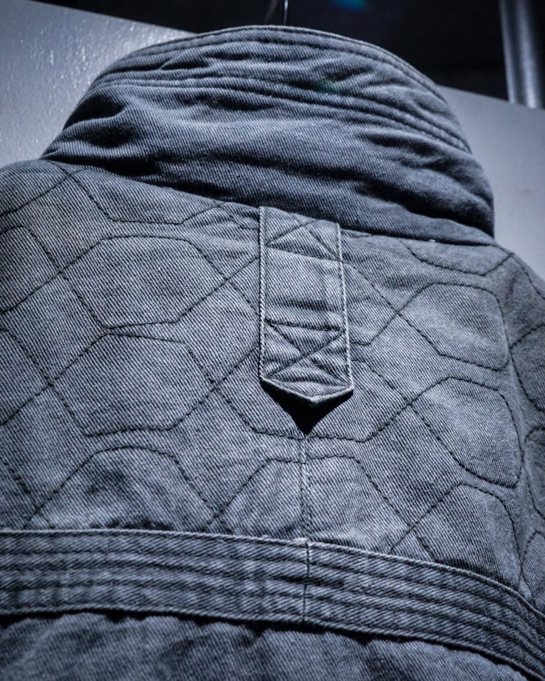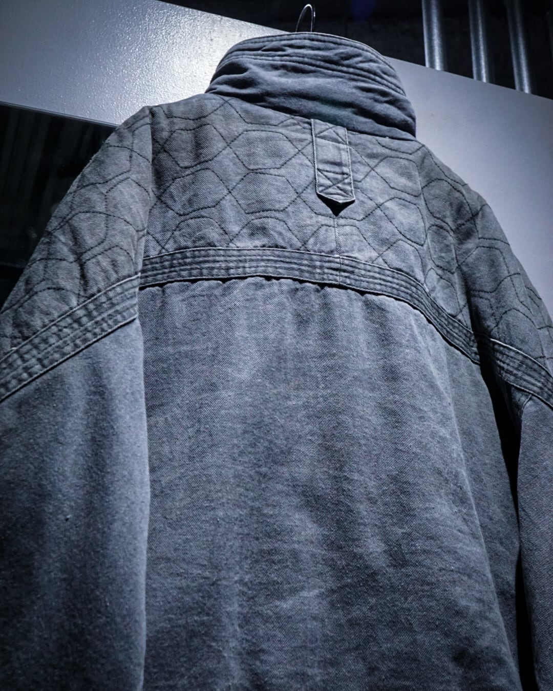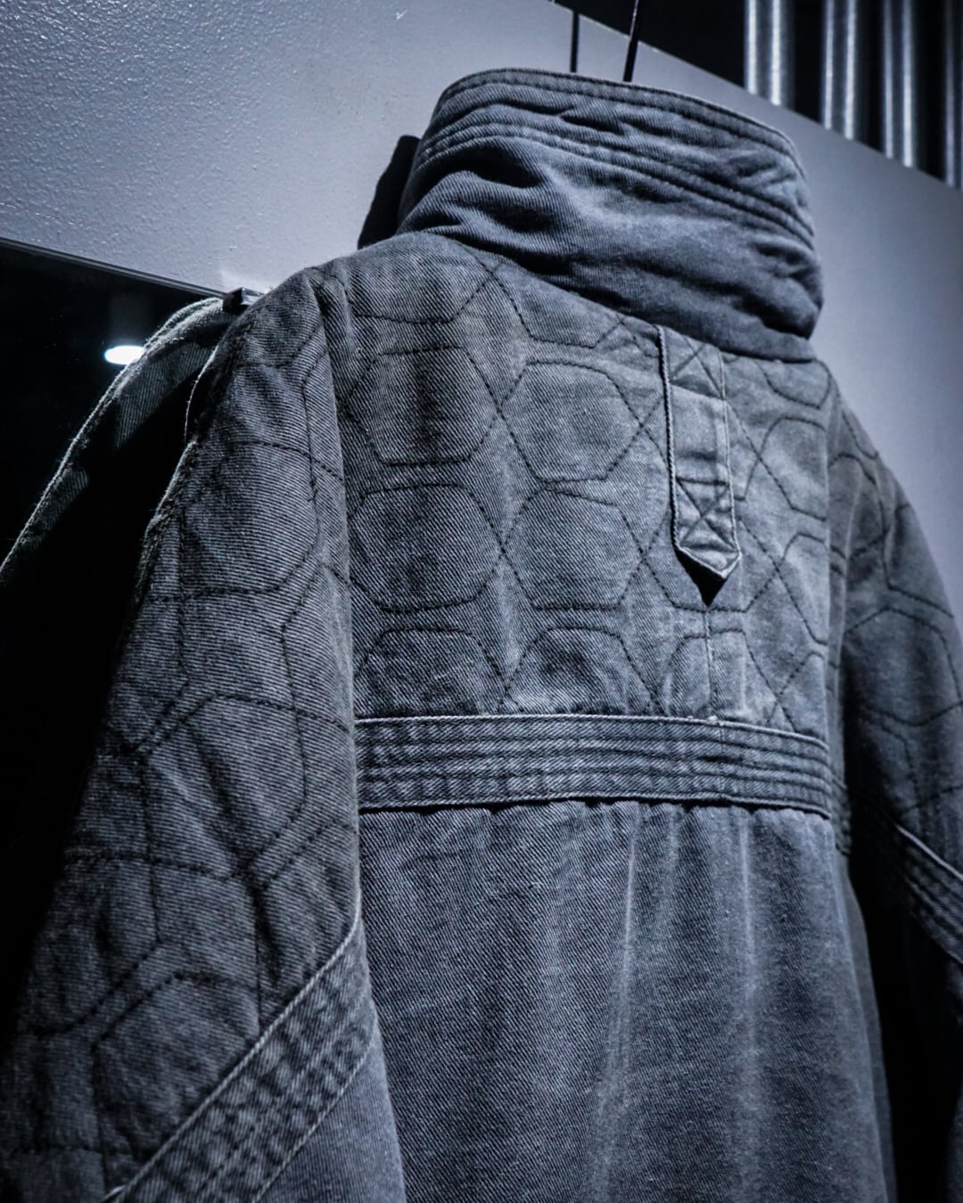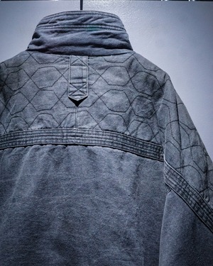 肩からアーム、背面にかけて施された六角ステッチが独特の表情を演出し、フロントに配された大振りのフラップポケットやハンドウォーマーポケット、裾のギャザーも相まって無骨さと実用性を匂わせるデザインバランスが◎