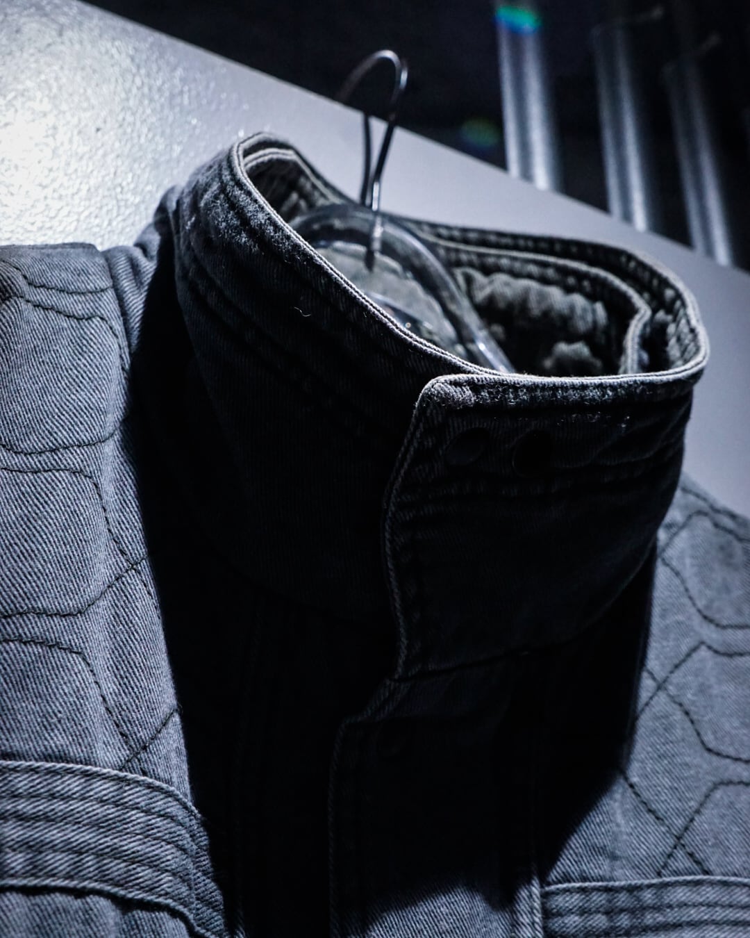 首元を高めに設定したスタンドカラーの内側には、別のジャケットを仕込んでいるかのようなデザインを搭載。シェルのネック部分を寝かせることでレイヤードのデザインが際立ち、モードな雰囲気が際立ちます。