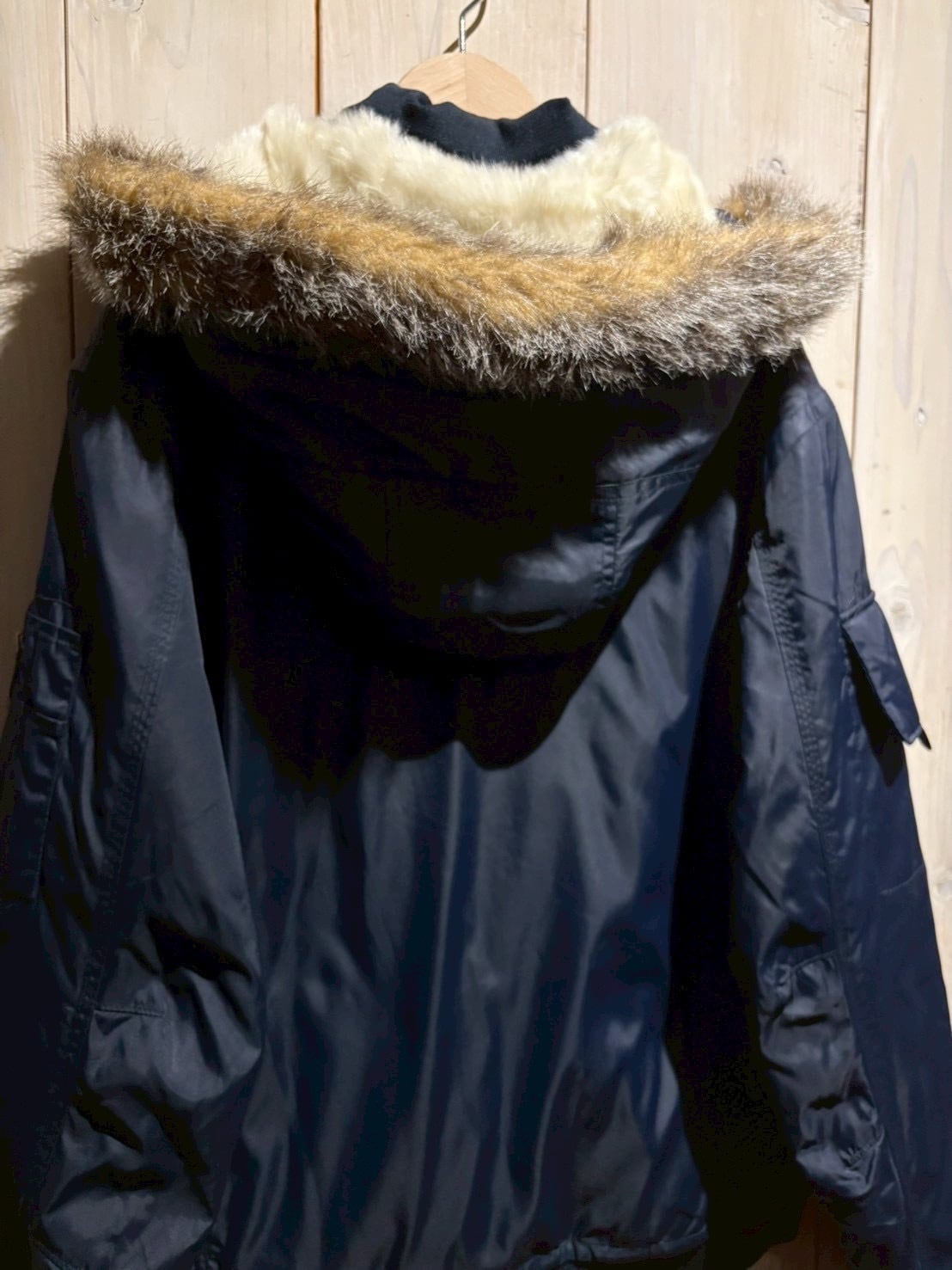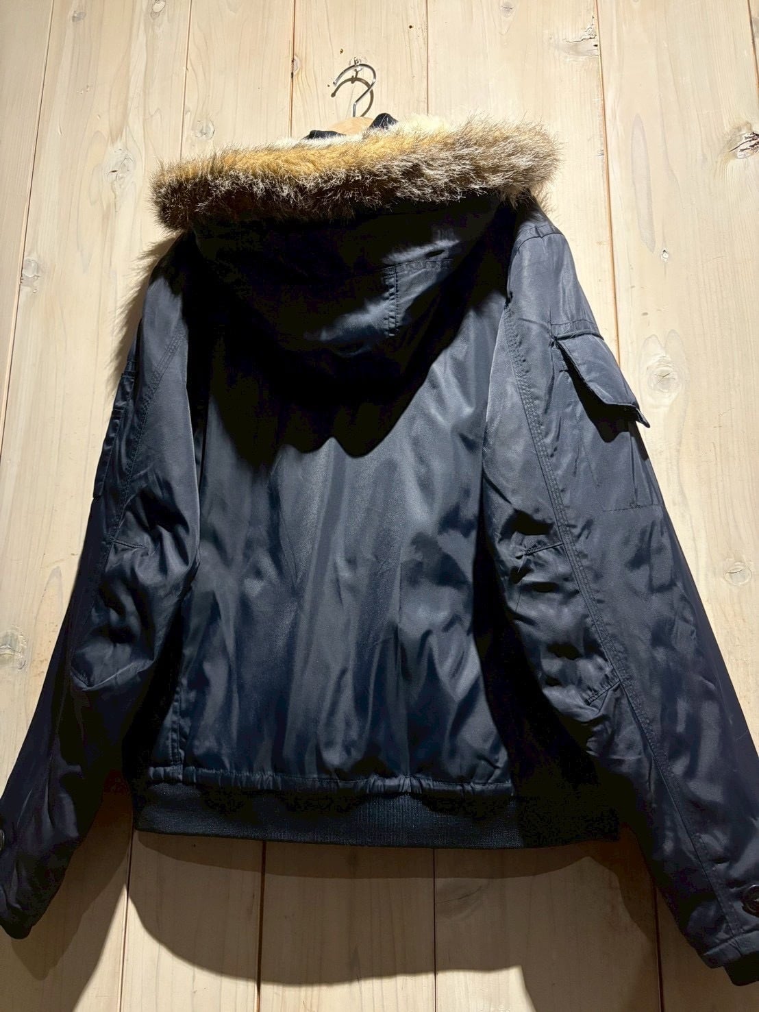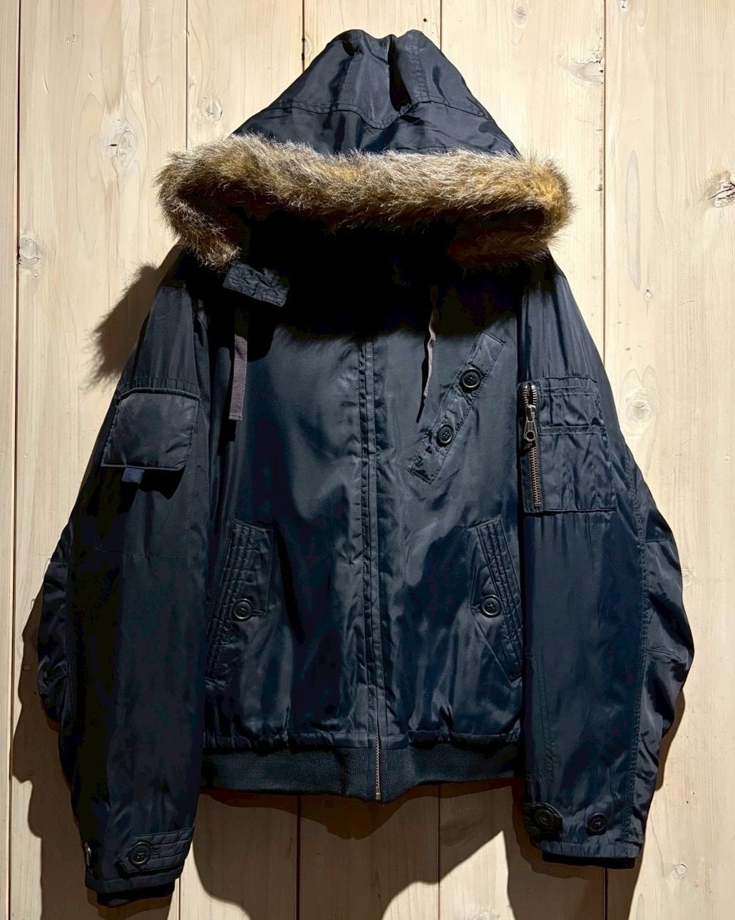 ネイビーナイロンのボディに、ハンドウォーマーポケット、ユーティリティポケット、裏地のオレンジのキルティングなどフライトジャケットならではのディテールを再現したジャケット。
