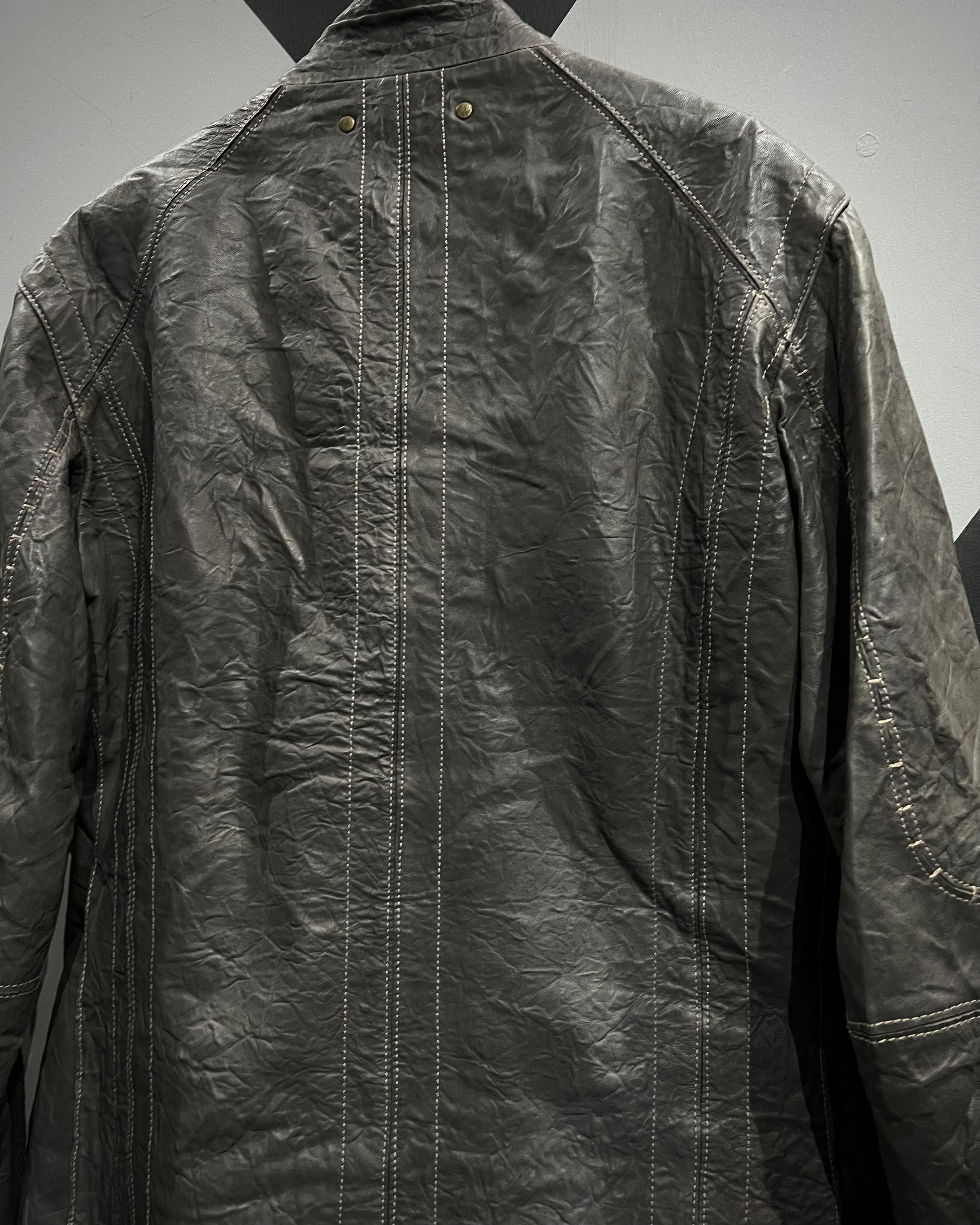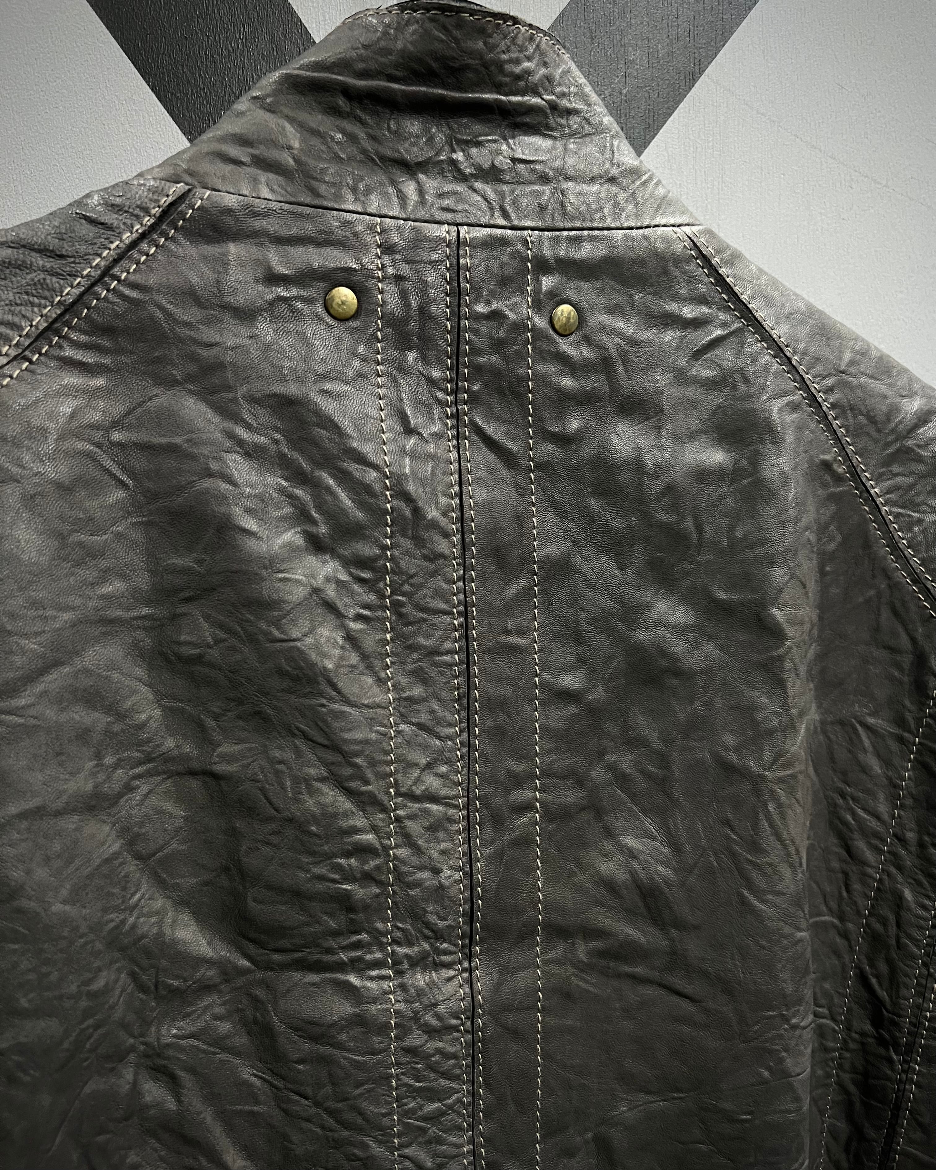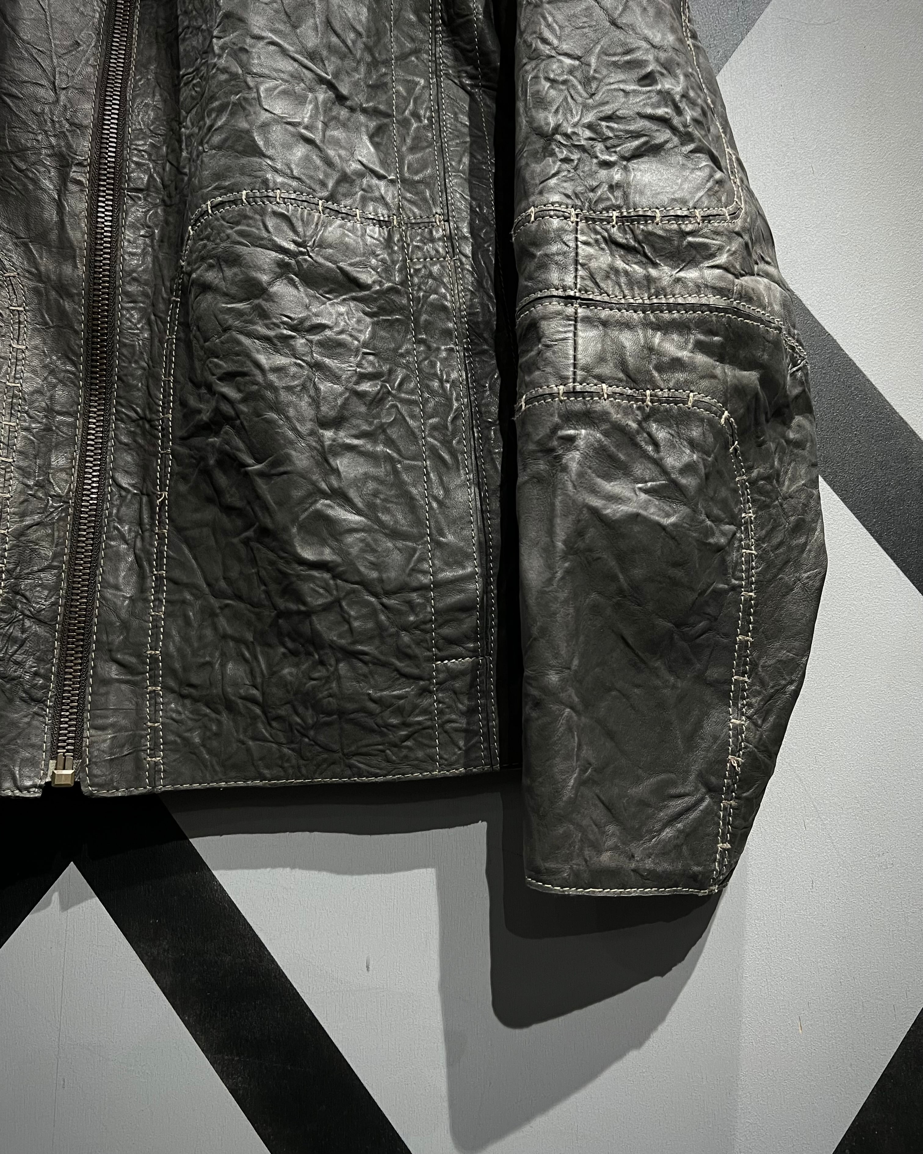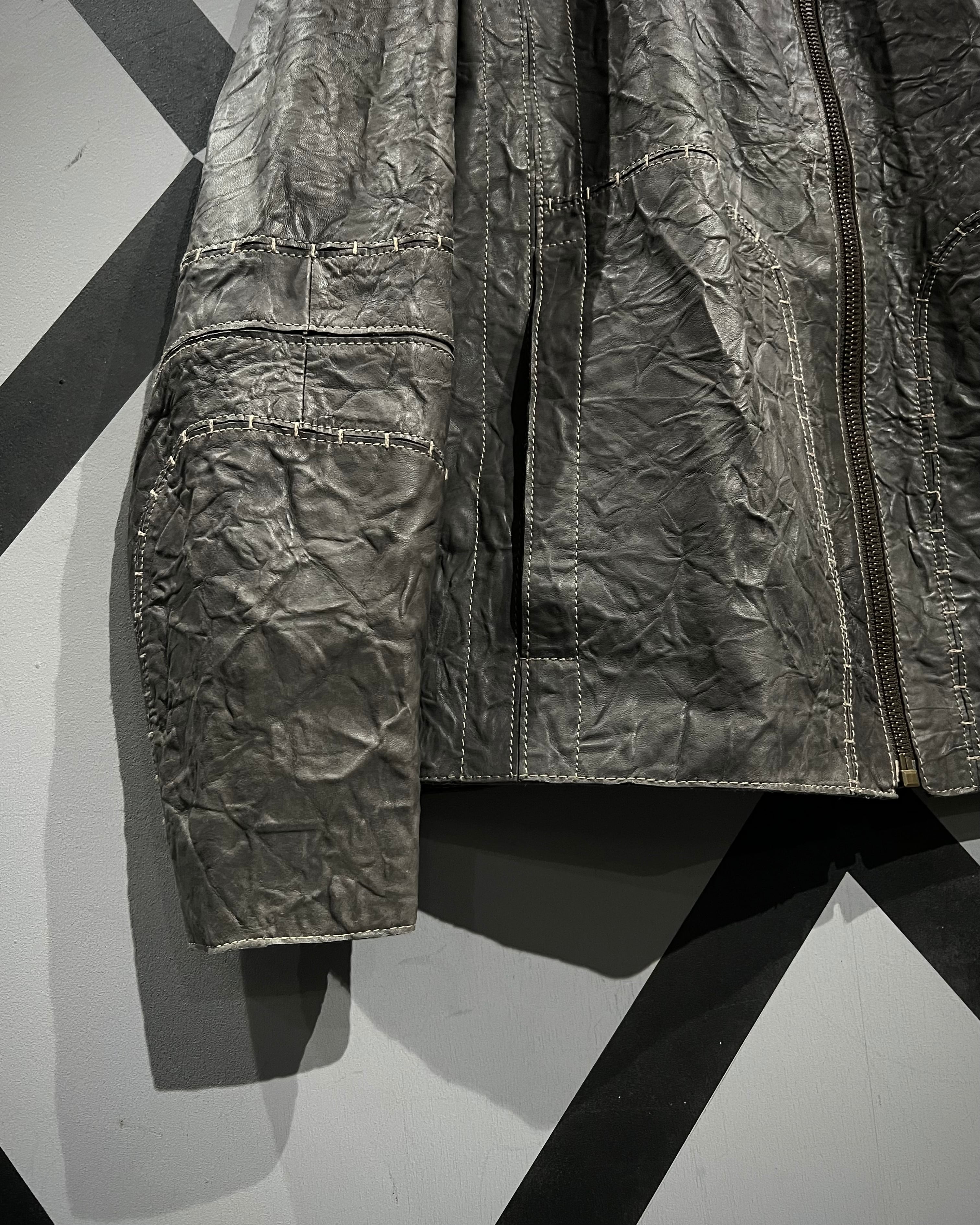 まず目を奪うのは、独特のシワ加工によって生まれた陰影。一般的なスムースレザーにはない立体感があり、光を受けたときの表情の変化が美しい、、、柔らかくしなやかなラムレザーだからこそ成立する質感で、モードな空気感を纏った1着。