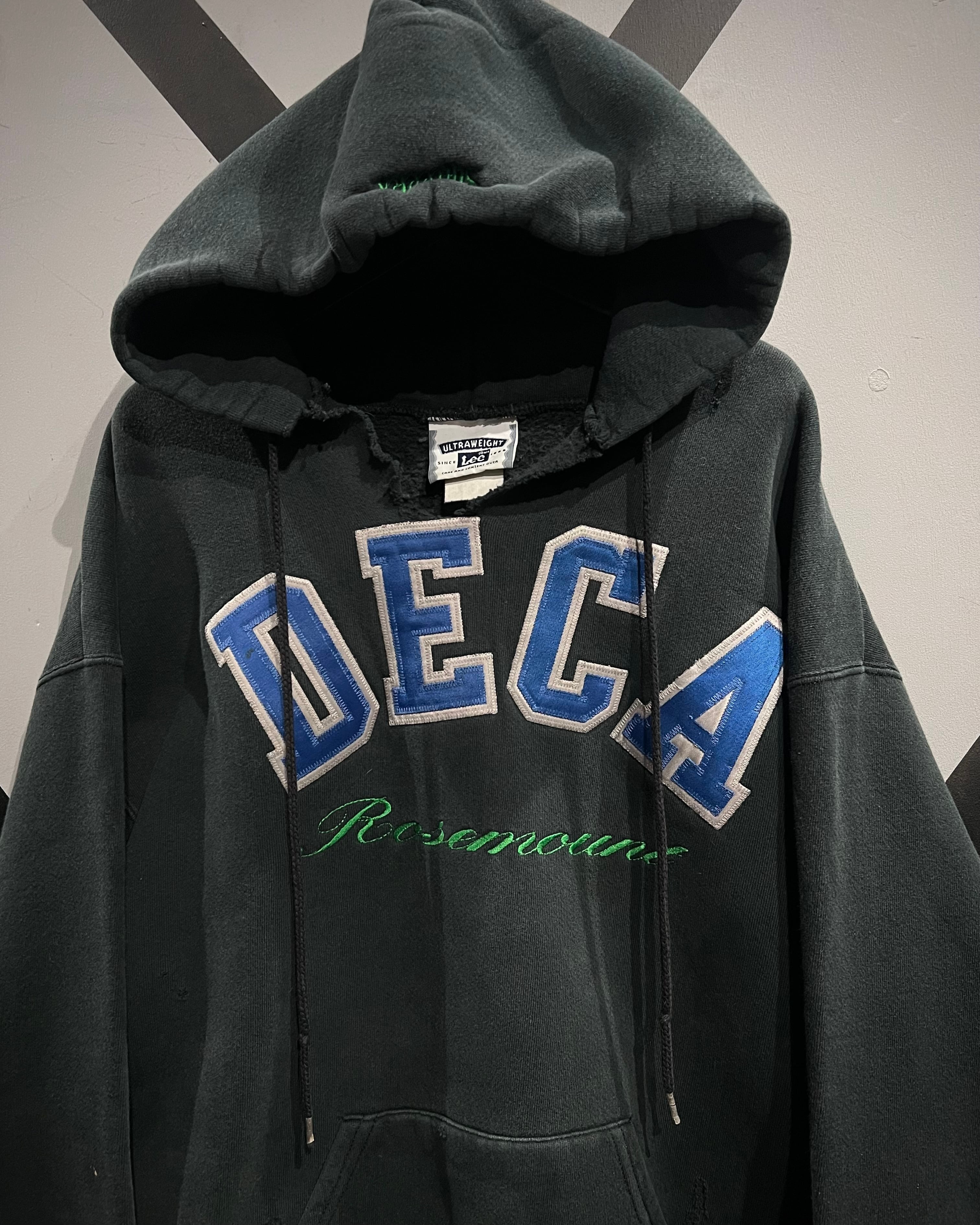 ブラックのボディが長年の着用で深いチャコール寄りにフェードした、最高の雰囲気を纏った “Lee”のフーディ。