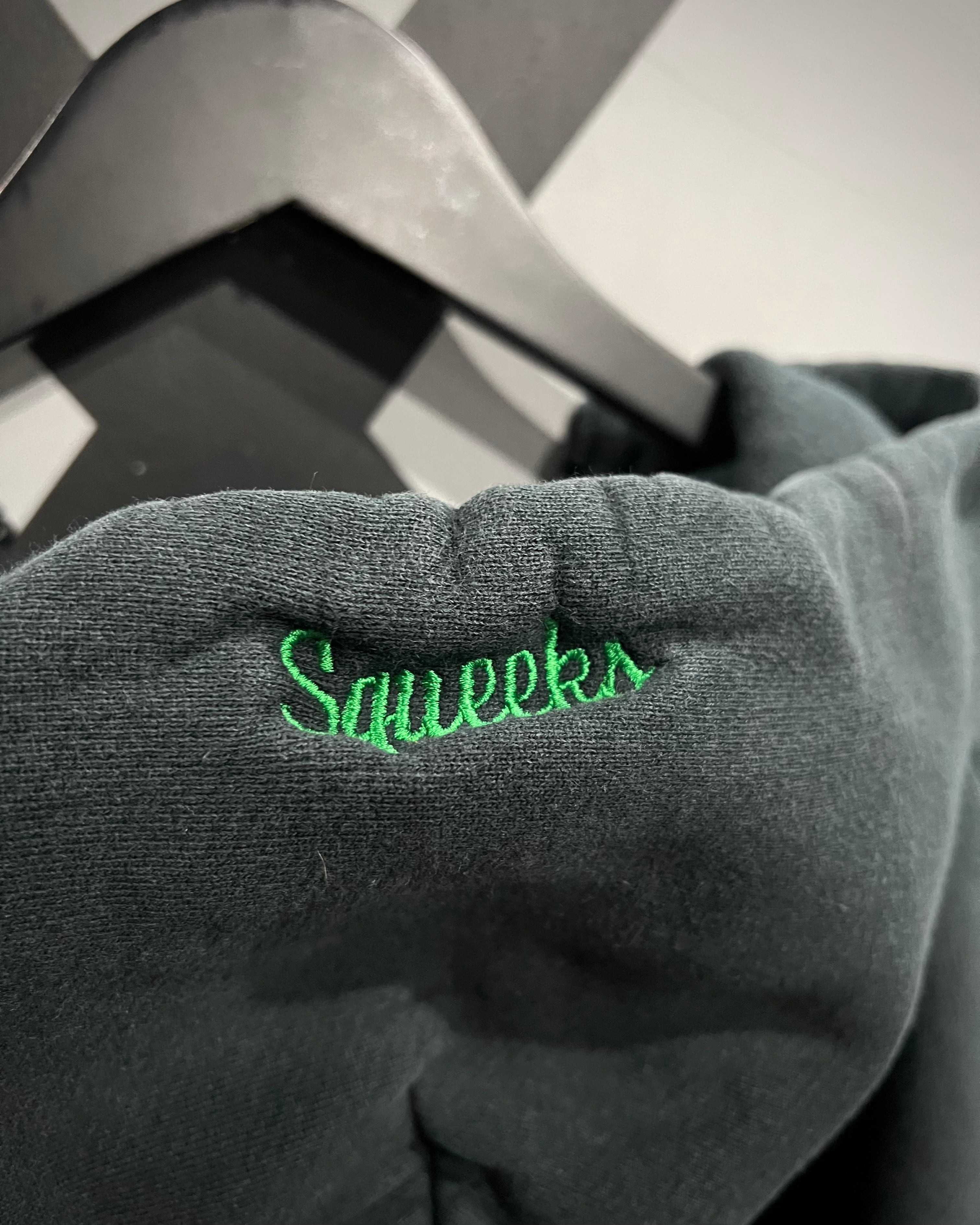 フロントには立体的なブルーのアーチロゴ、その下に走るグリーンの刺繍がブラックフェードのボディとマッチし、存在感のあるコントラストを形成しています。