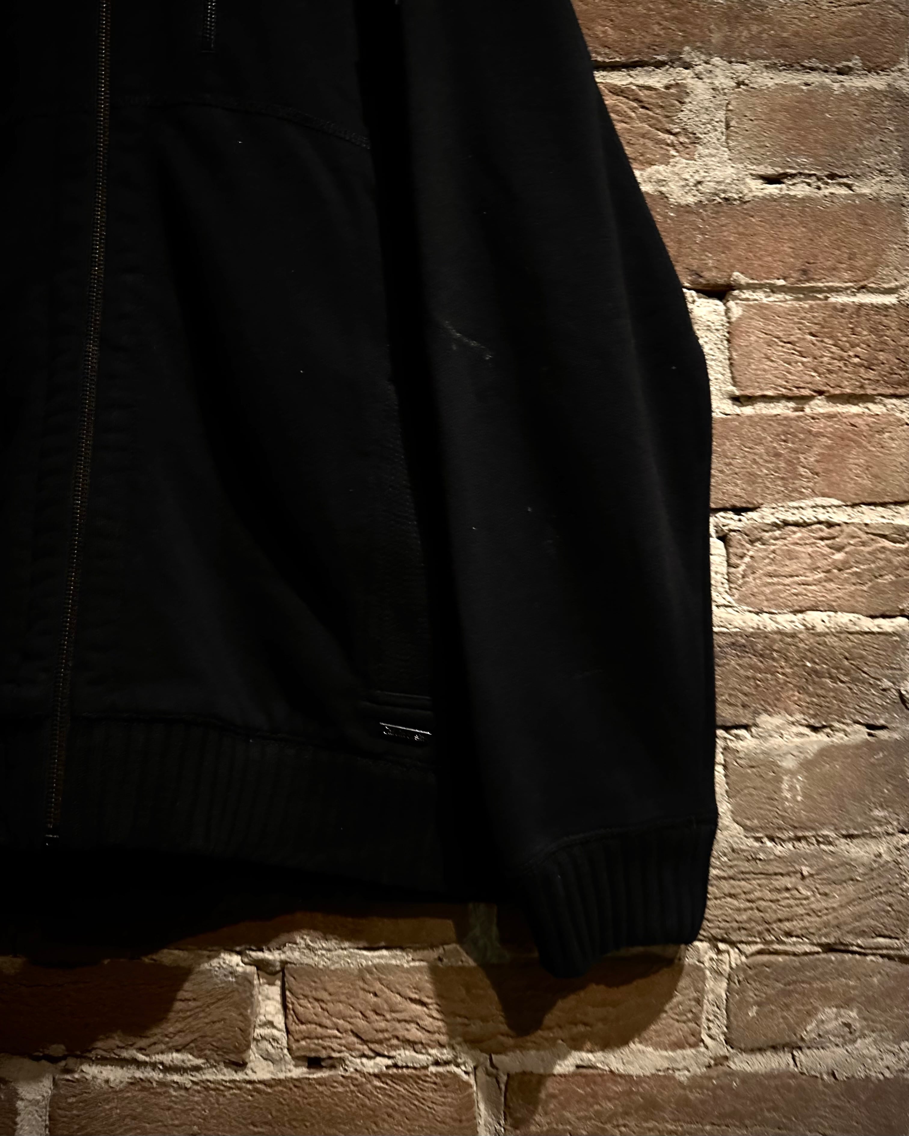 フロントは無駄のないジップアップ仕様、胸元の縦ジップポケットが実用性とデザインの両立を果たし、袖にはさりげなく置かれた“ck”レザーパッチを載せ、全体を黒で統一しながらモードな雰囲気を漂わさる1着に仕上がっています。ロックミシンのステッチのアクセントも◎