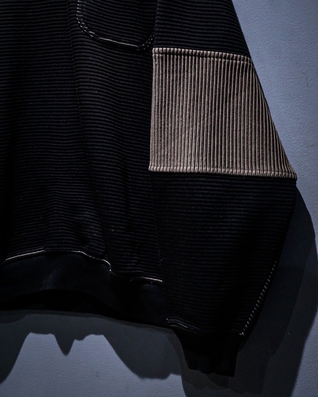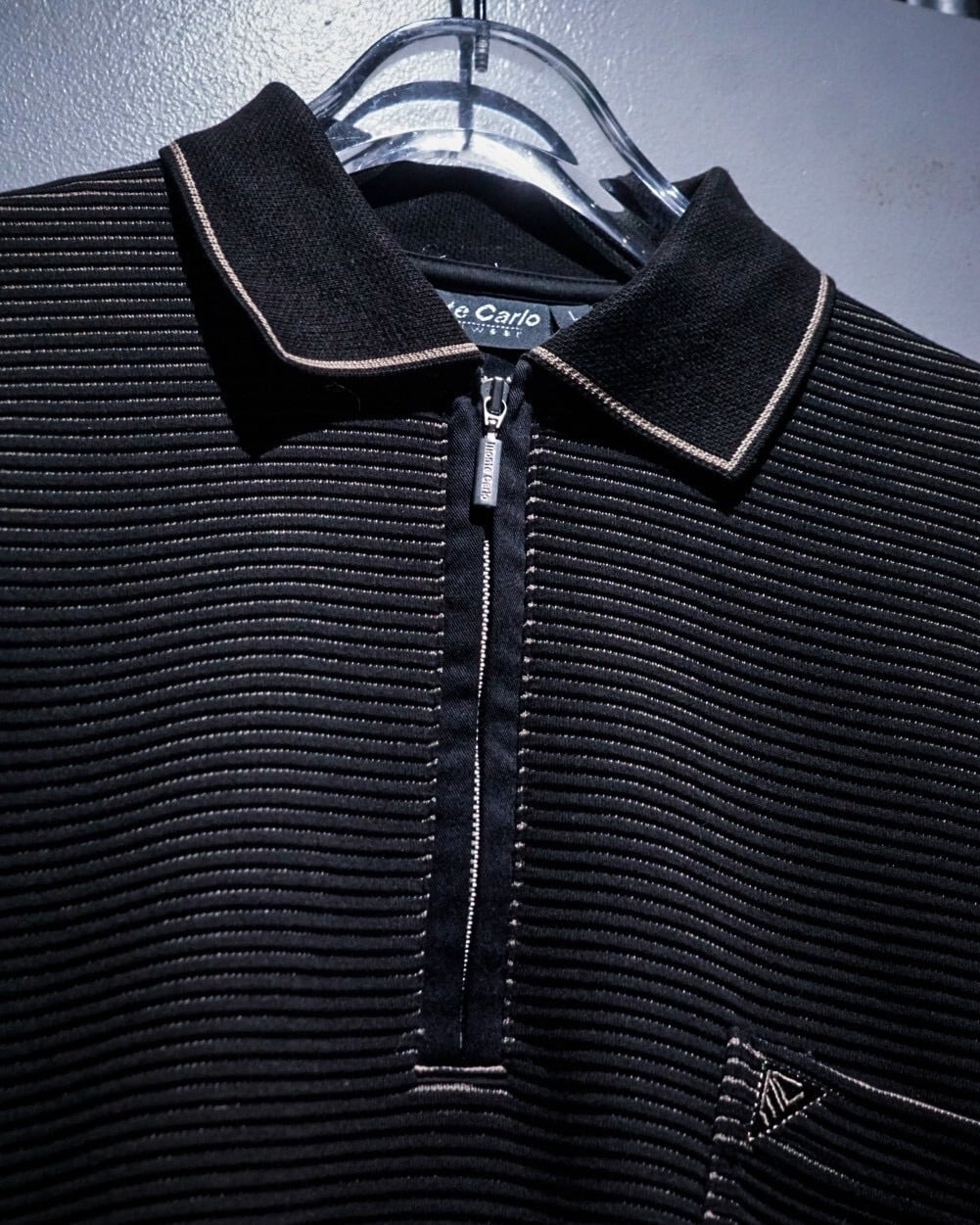 全体に細かな凹凸が走るリブ状のテキスタイルを採用し、袖には配色切り替えのストライプパネルを配置したハーフジッププルオーバー。