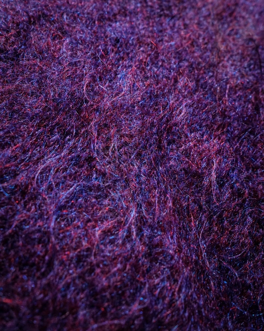 深いバーガンディをベースに、バイオレットやブルーの糸が複雑に混ざり合うカラーリングは、単色では出せない奥行きと立体感を演出。光の当たり方で表情を変える豊かな毛並みが雰囲気を漂わせています。