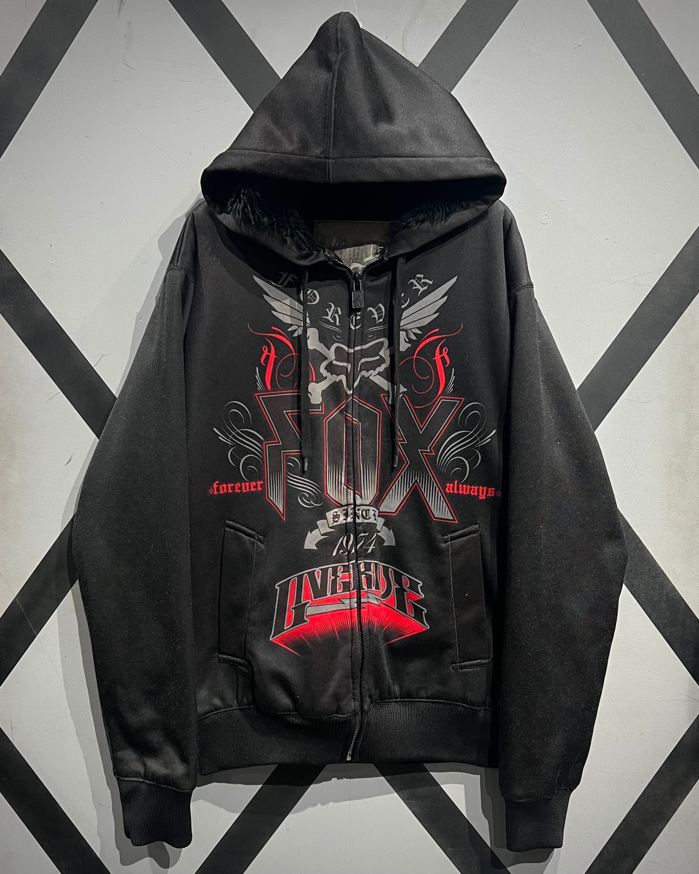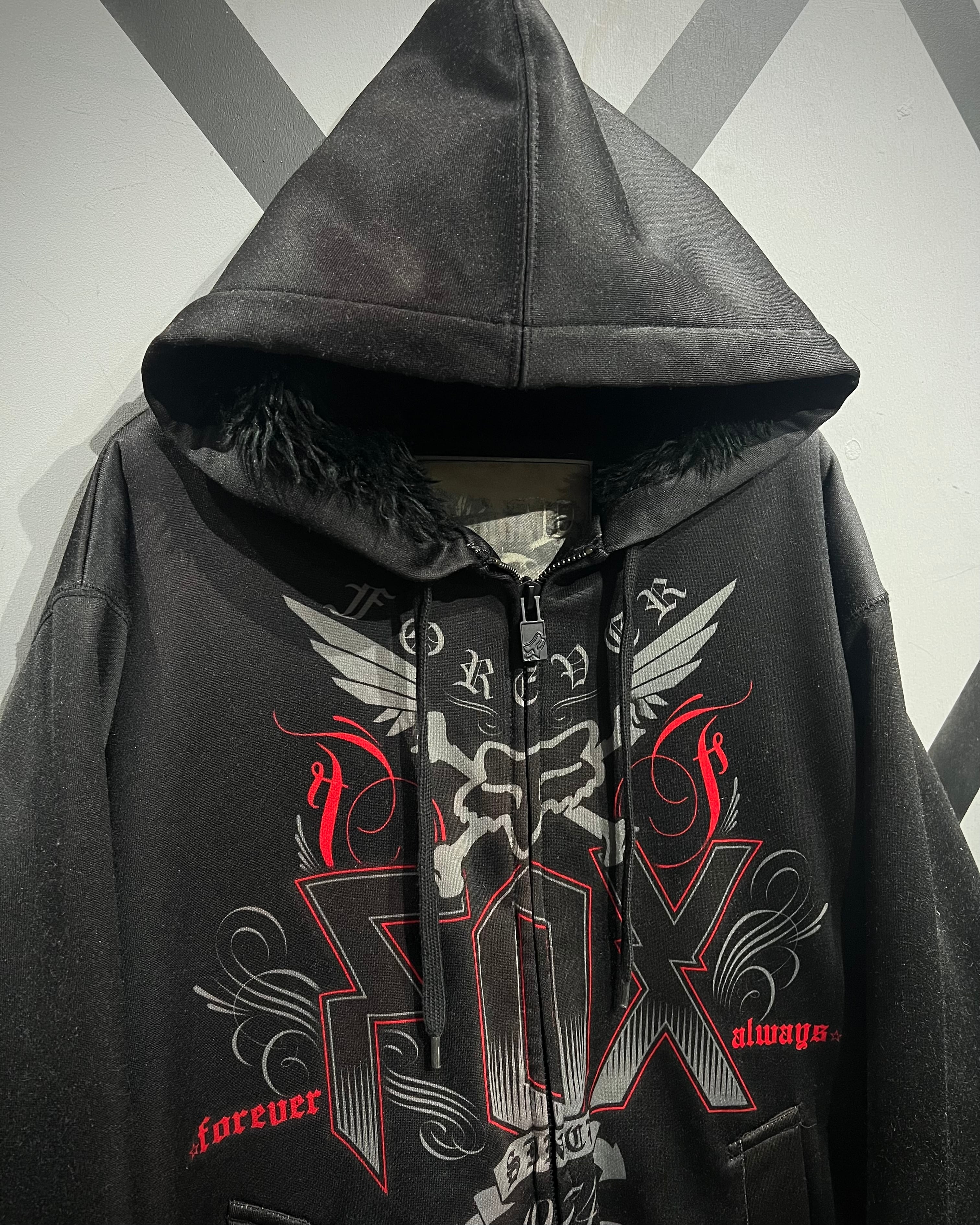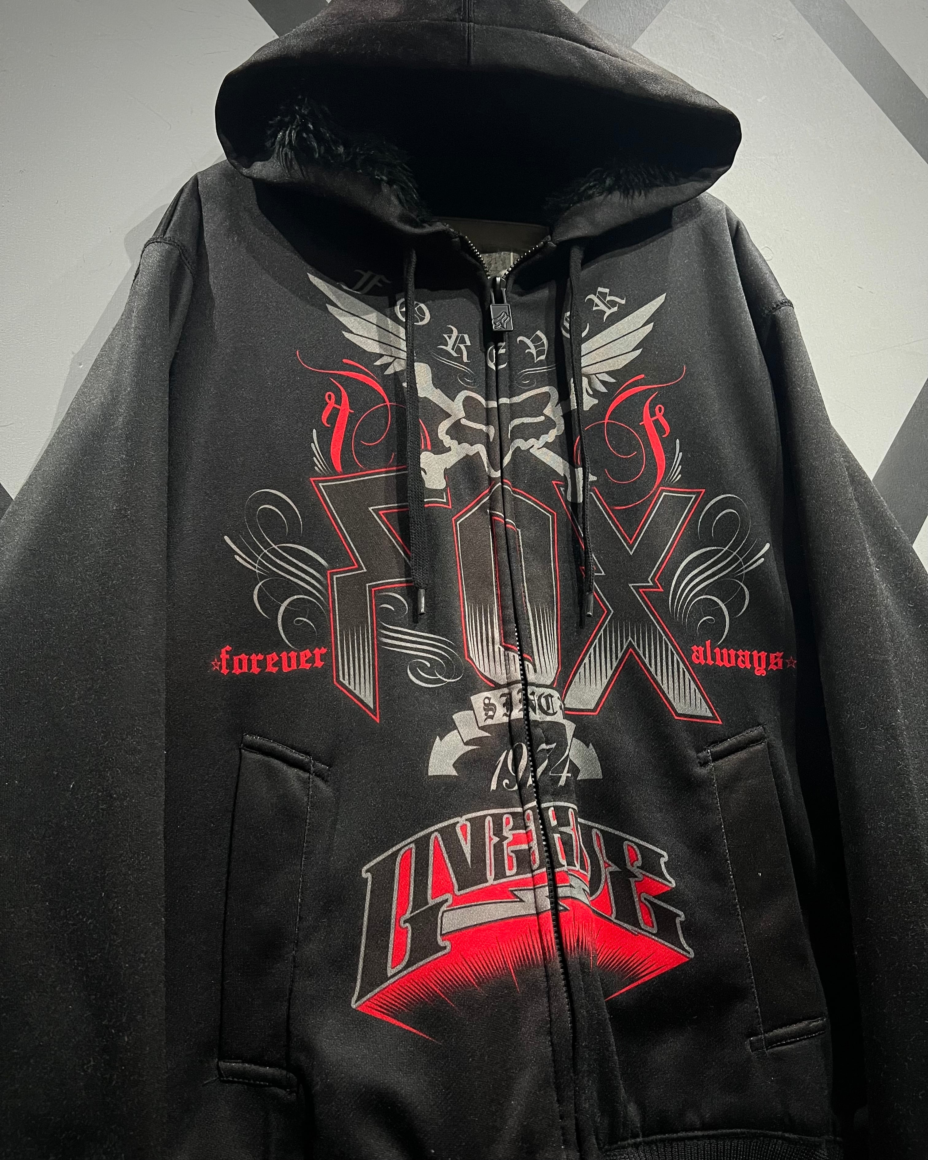 ブラックのボディに、フロントにはFOXロゴ×クロスボーン×翼のヘビーなモチーフを組み合わせた圧巻のグラフィックを載せたジップアップフーディ。