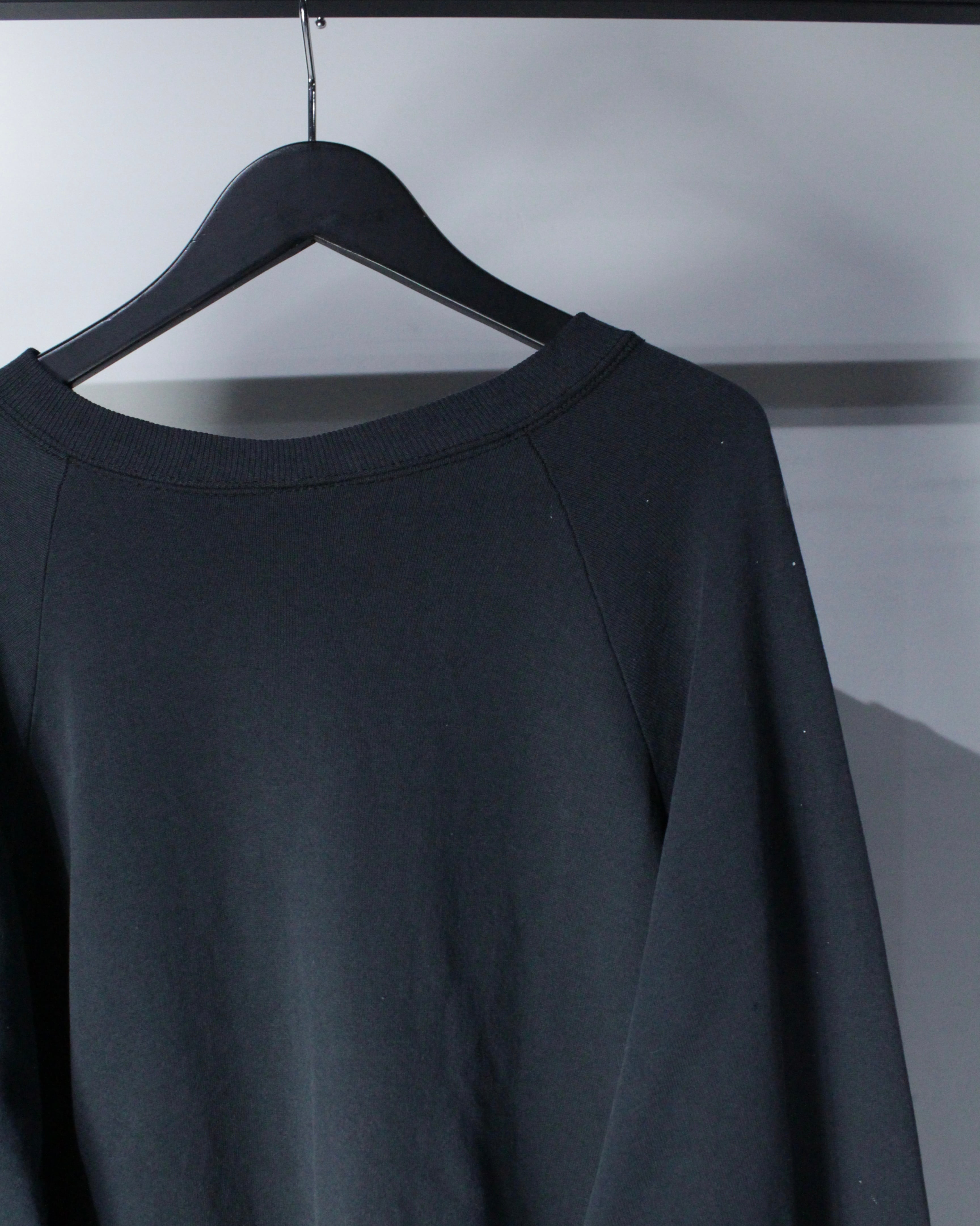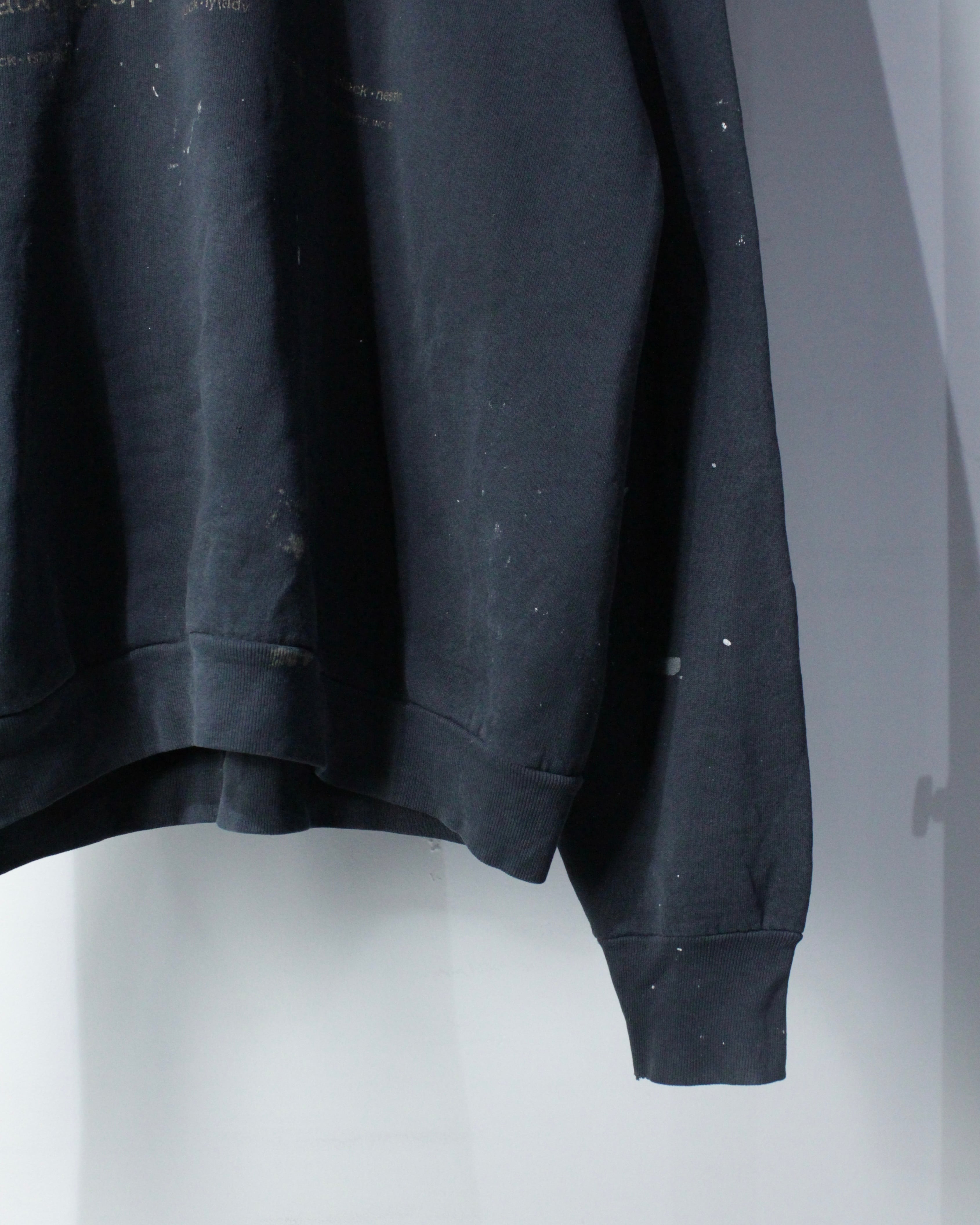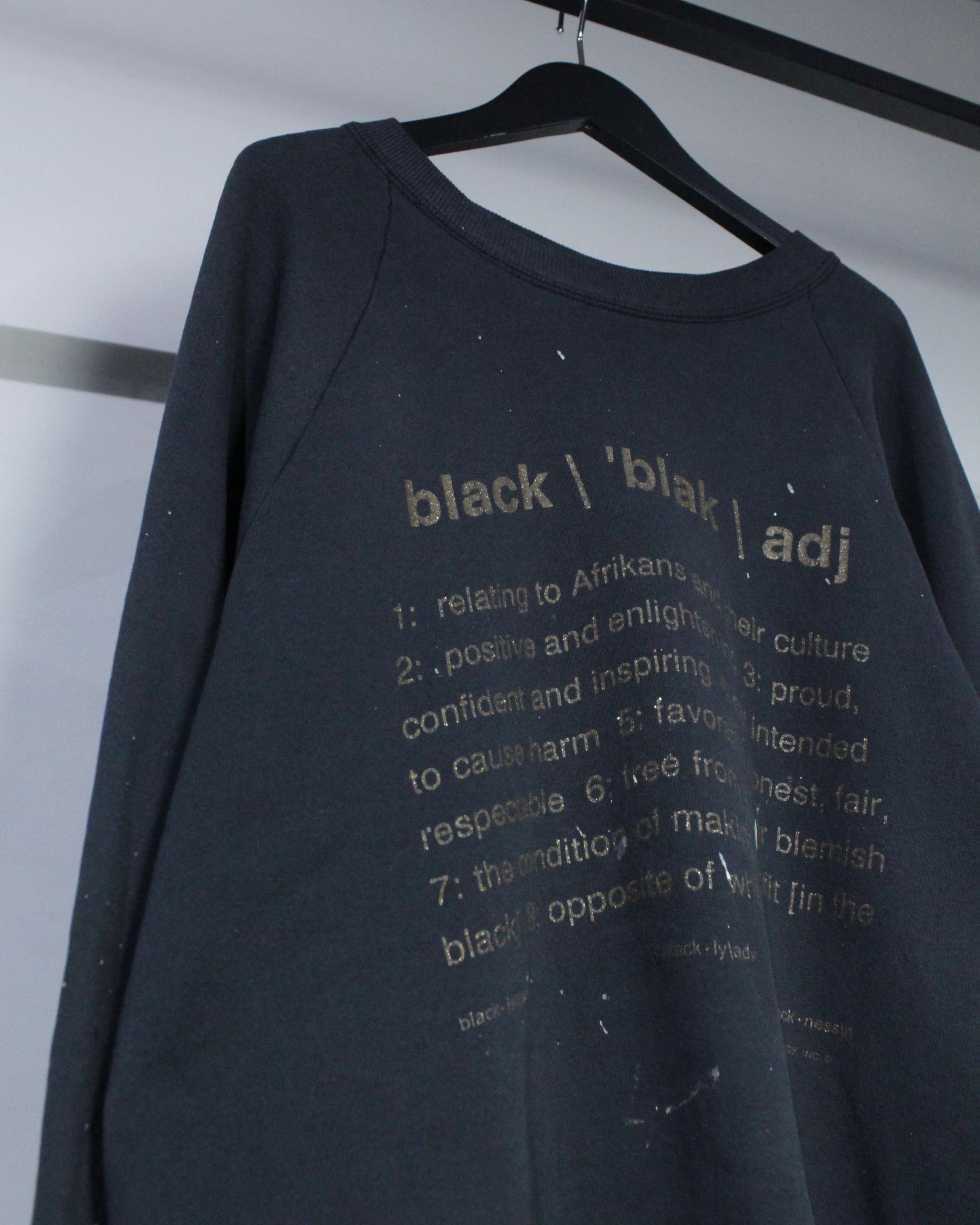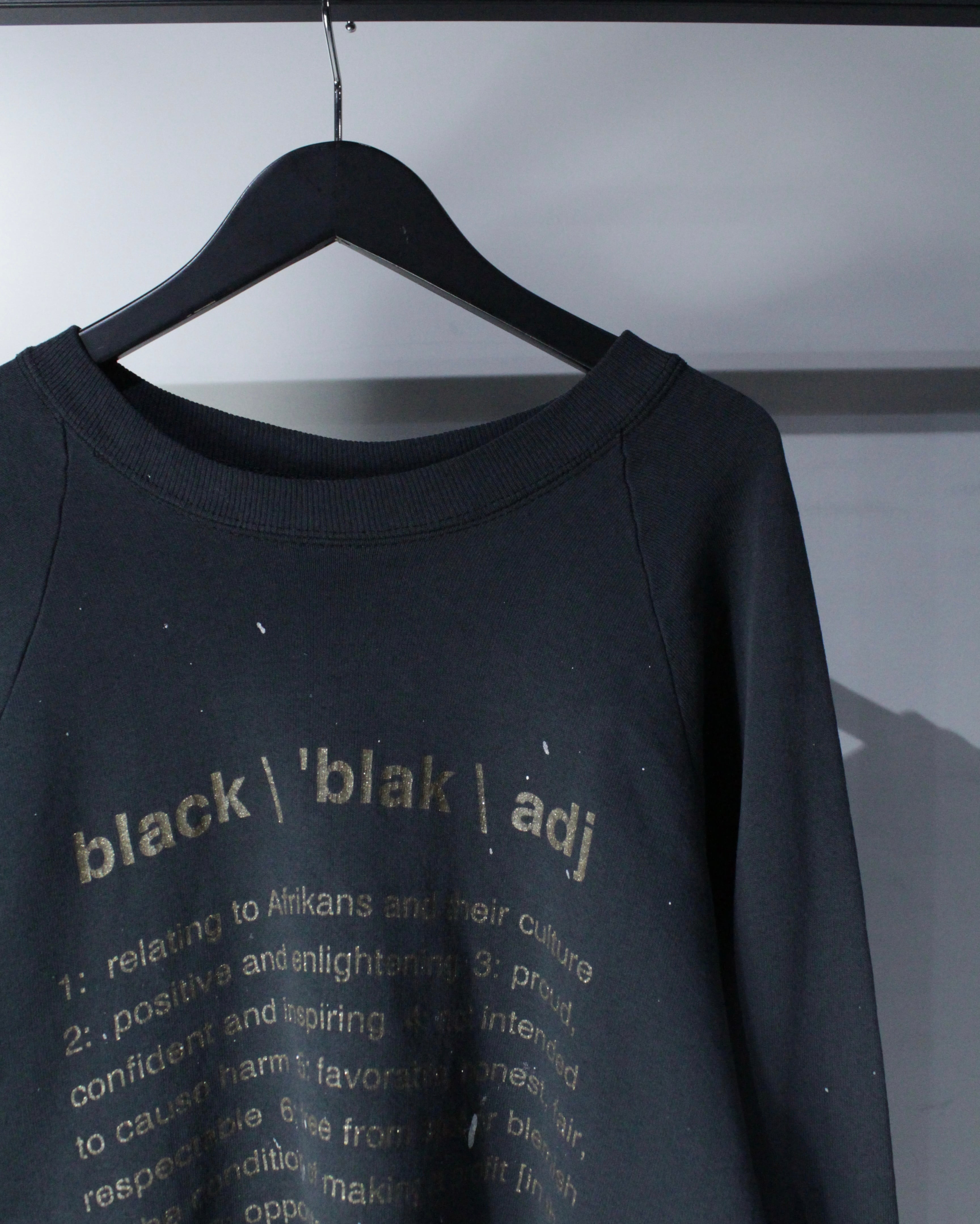 “BLACK”についてのプリントが載せられた、当店的スペシャルなスウェット。