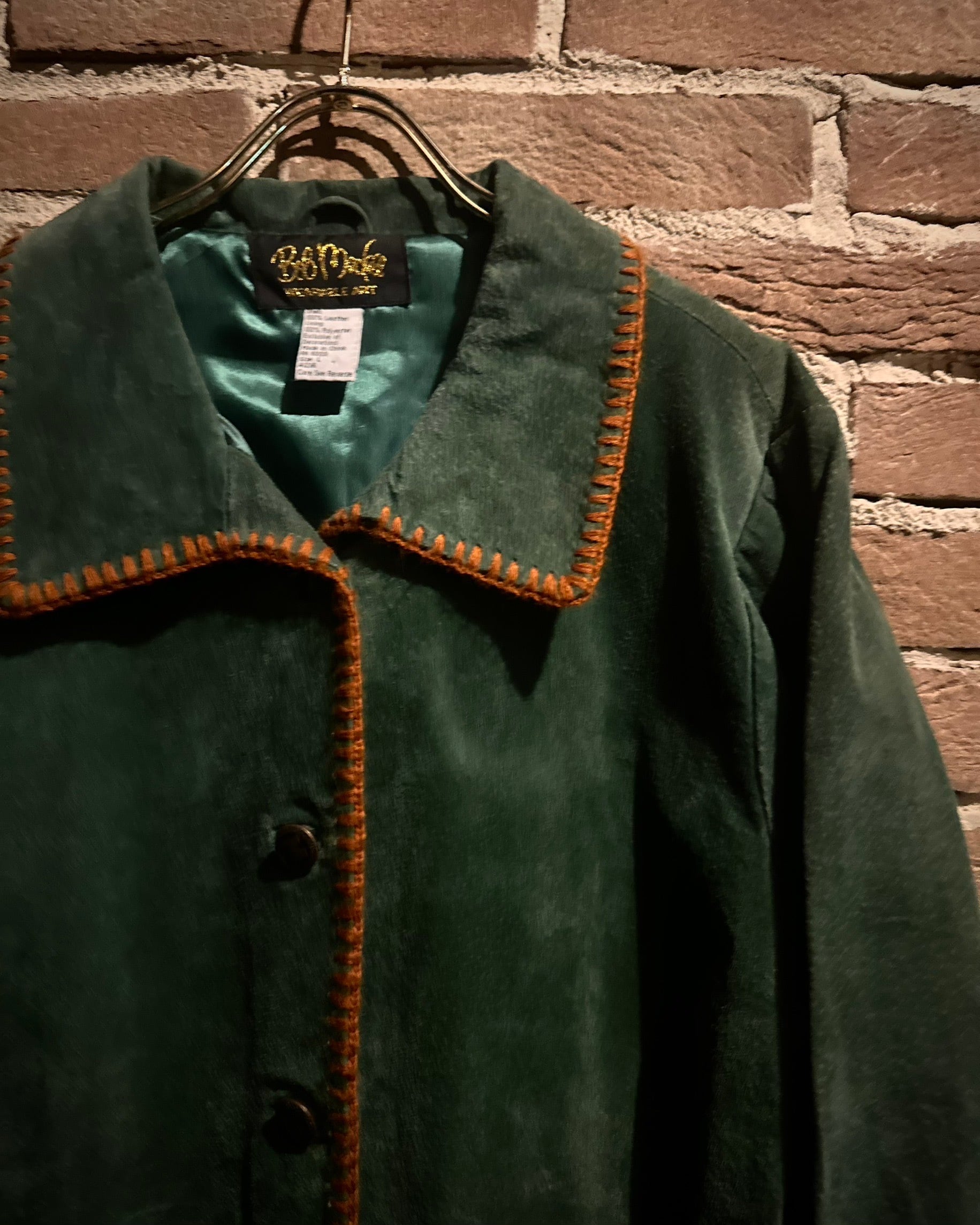 深みのあるグリーンスエードに、オレンジのボタニカルモチーフを乗せた華やかな1着。襟まわりや前立て、裾に施されたハンドステッチが立体感を生み、シンプルながら圧倒的な存在感を放ちます。
