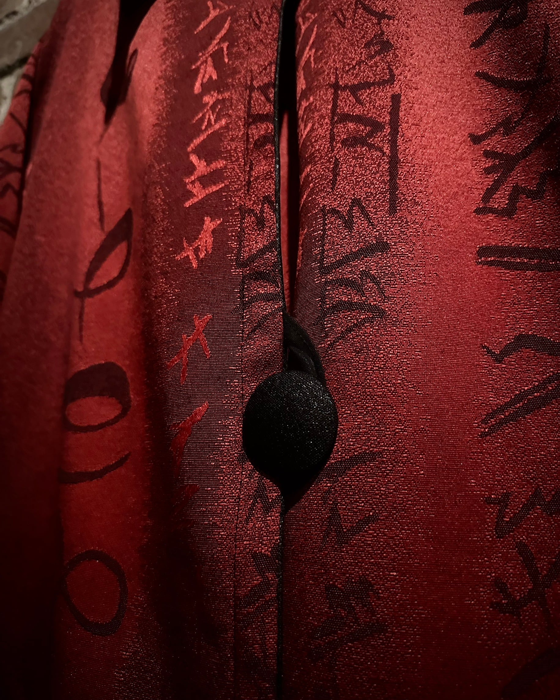 一方のレッド面は、抽象的なラインが走る総柄テキスタイルが特徴。深い赤の陰影の中にランダムな線が重なり、ブラックとのコントラストがエレガントかつエッジの効いたムードを演出。