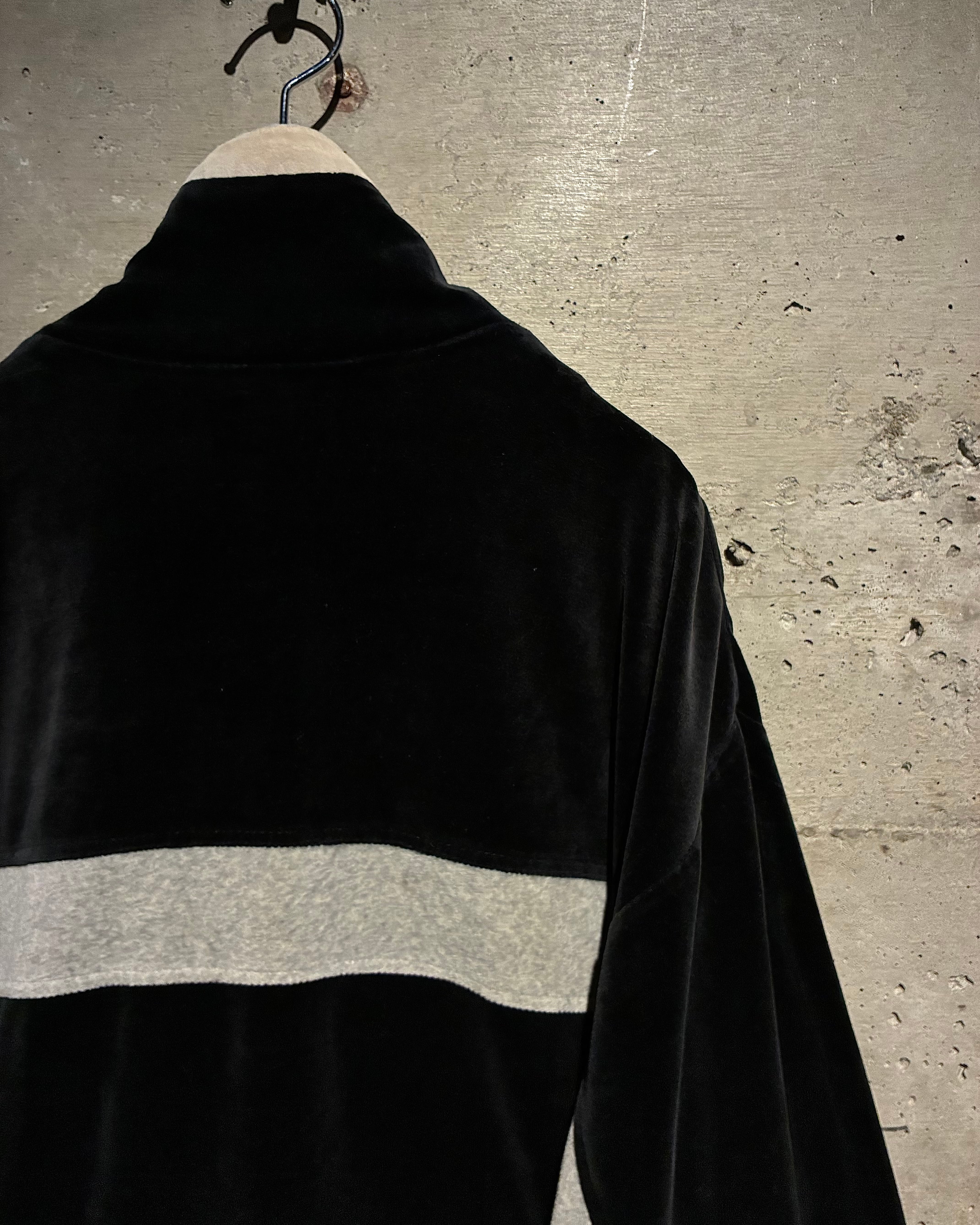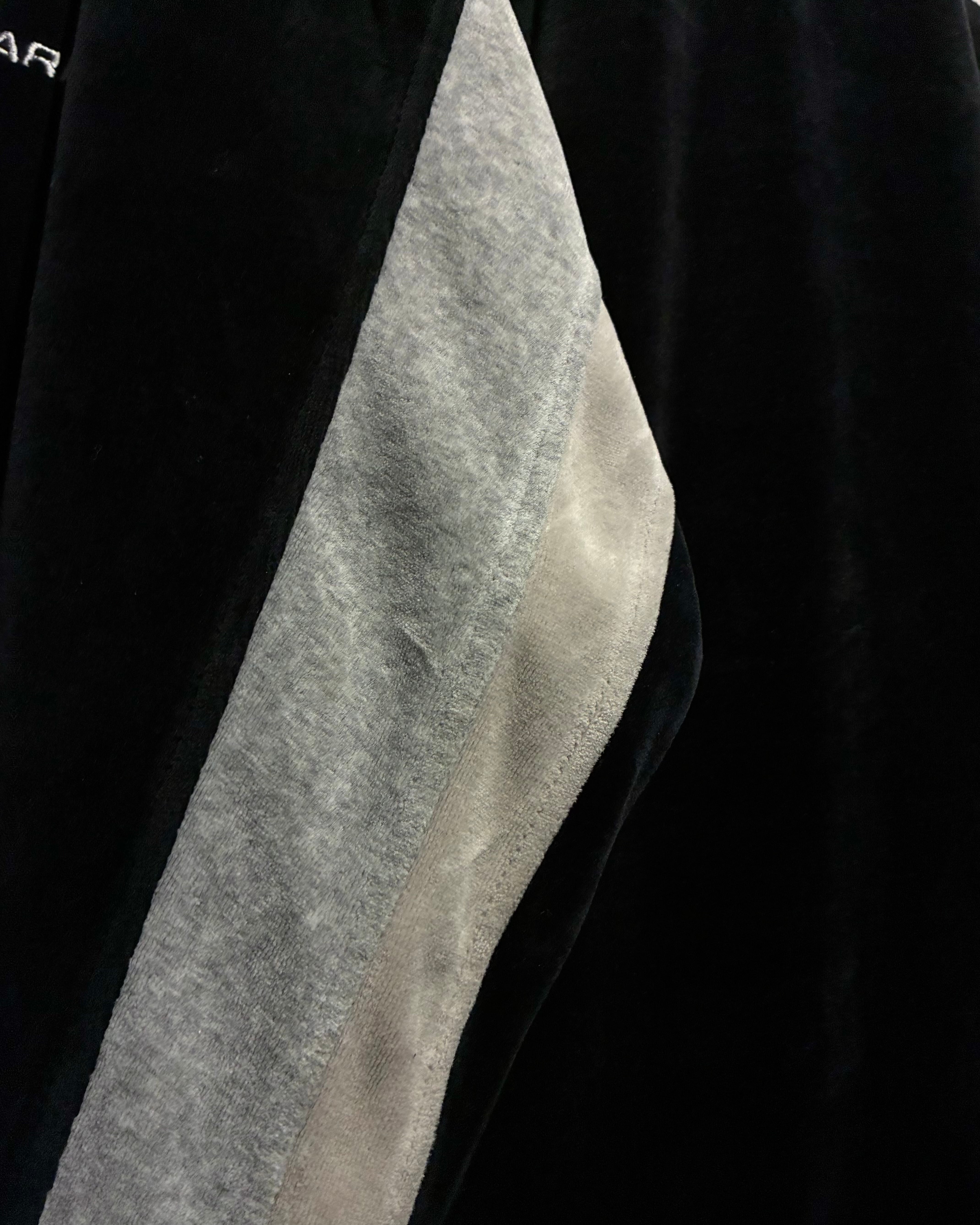 鈍く光沢を放つ滑らかなブラックベロアを用いて、トラックジャケットに落とし込んだ1着。