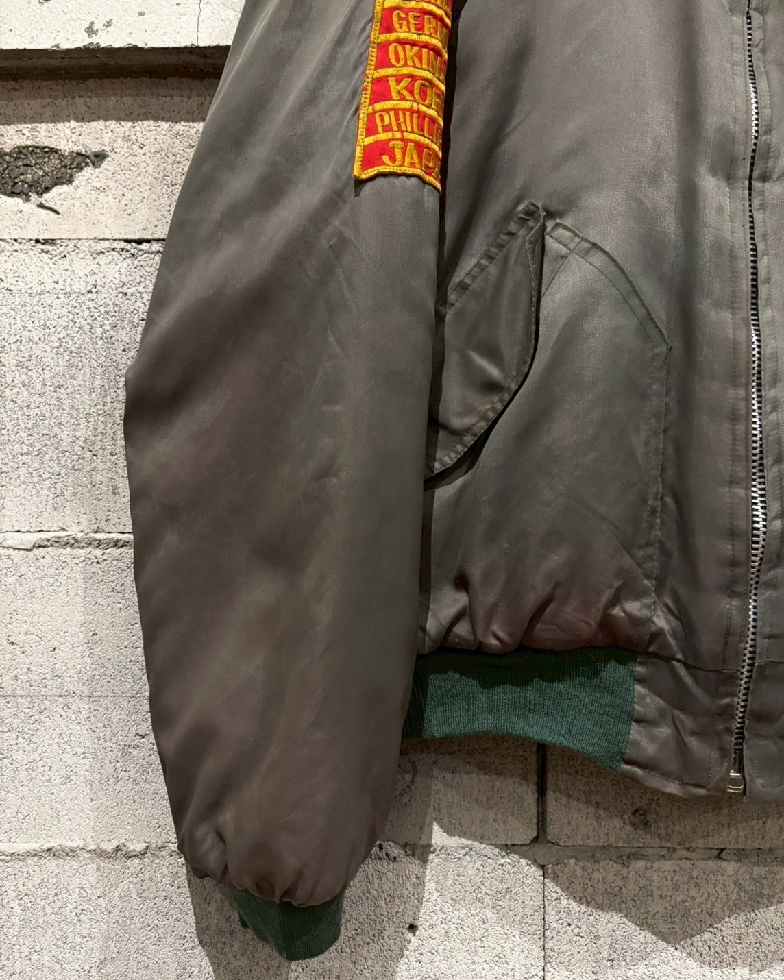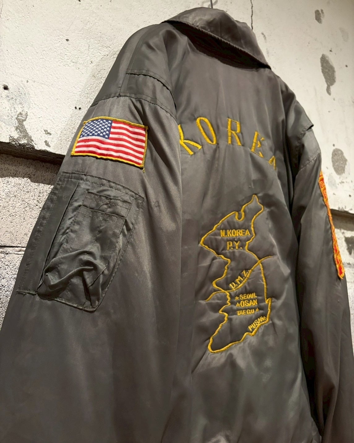 背面には大きく描かれた朝鮮半島のマップ刺繍、袖には「KOREA」「OKINAWA」「GERMANY」などの渡航パッチが並ぶ迫力はスーベニアジャケットならでは。アメリカ国旗ワッペンもアクセントとして最高のバランスですね。