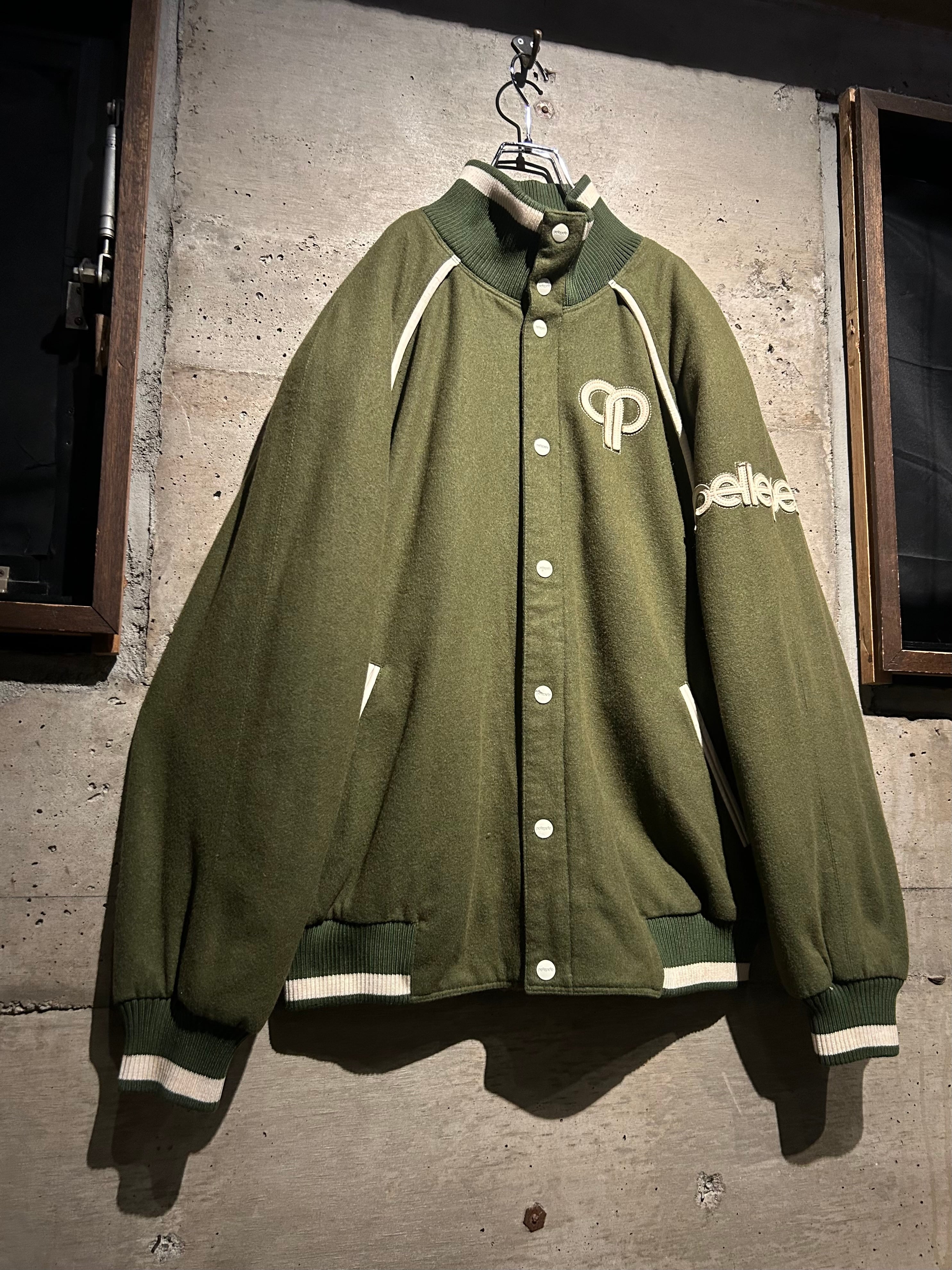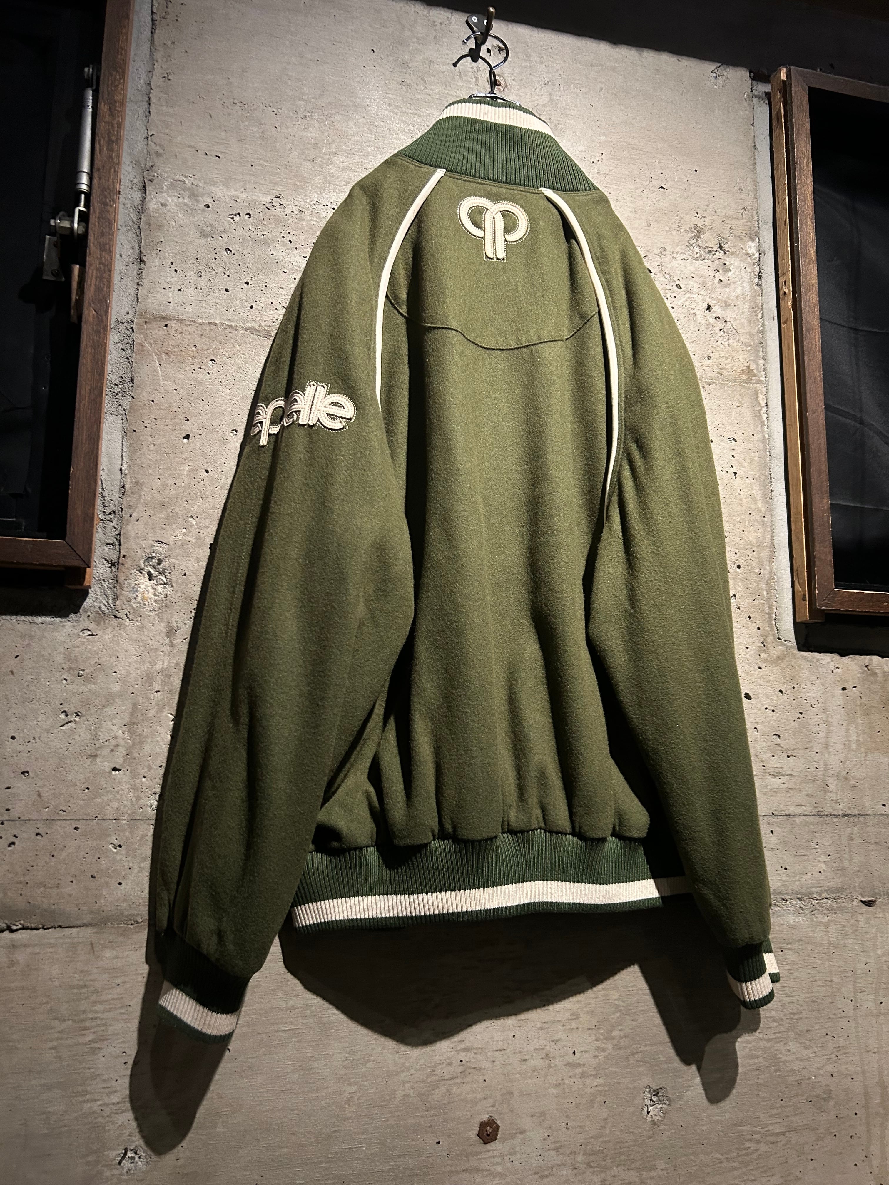 深みのあるオリーブカラーを軸に、ホワイトのパイピングと刺繍を随所にレイアウト。90’s〜00’sヒップホップカルチャーを象徴するウールスタジャンの空気感をしっかり纏いながらも、全体が上品にまとまった絶妙な個体です。