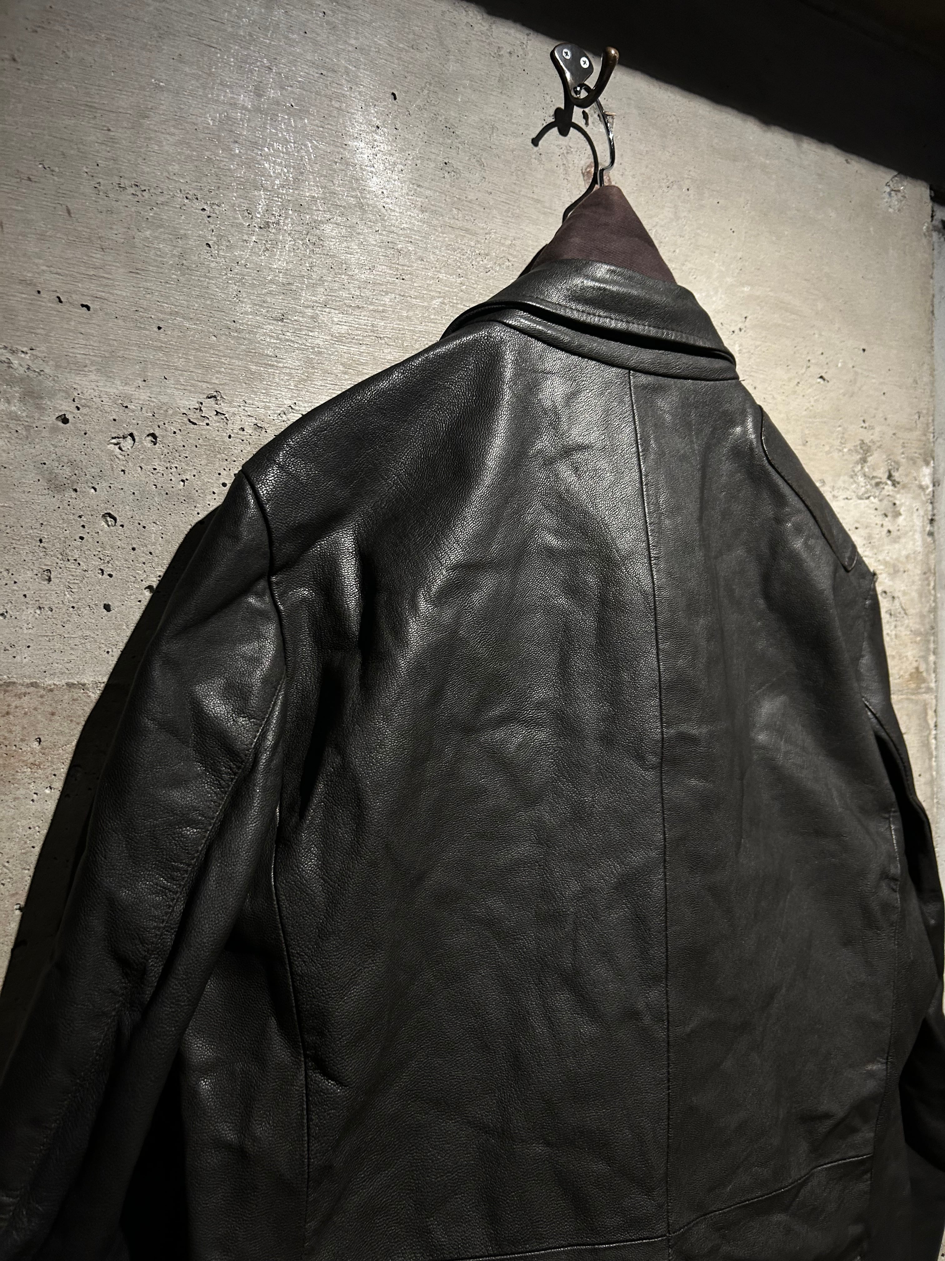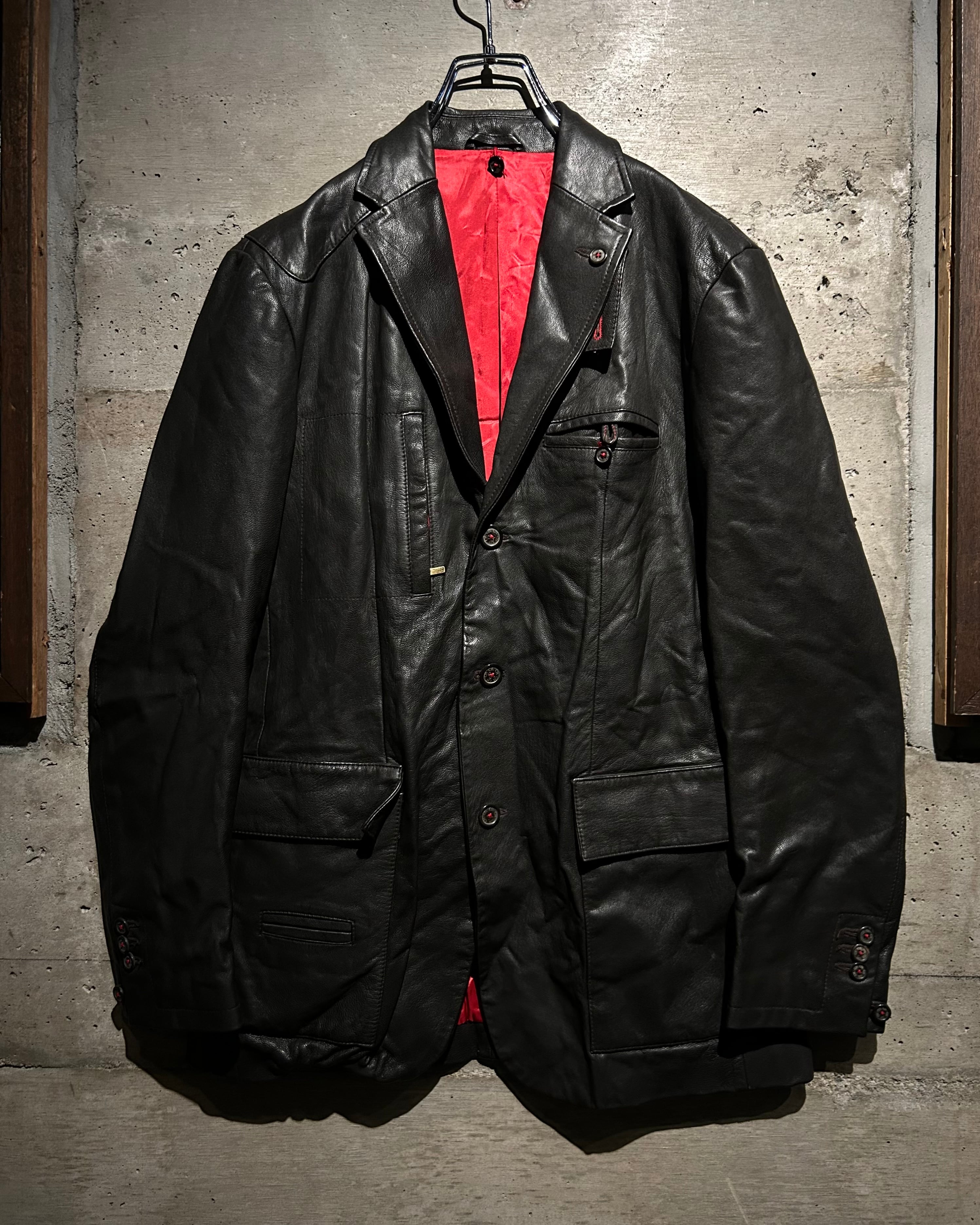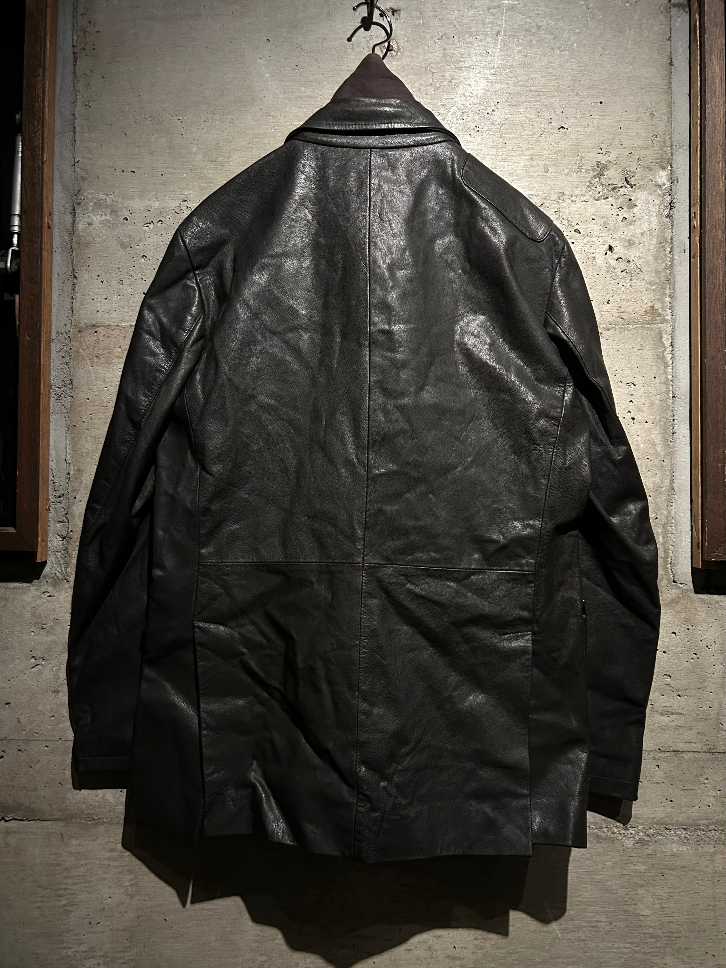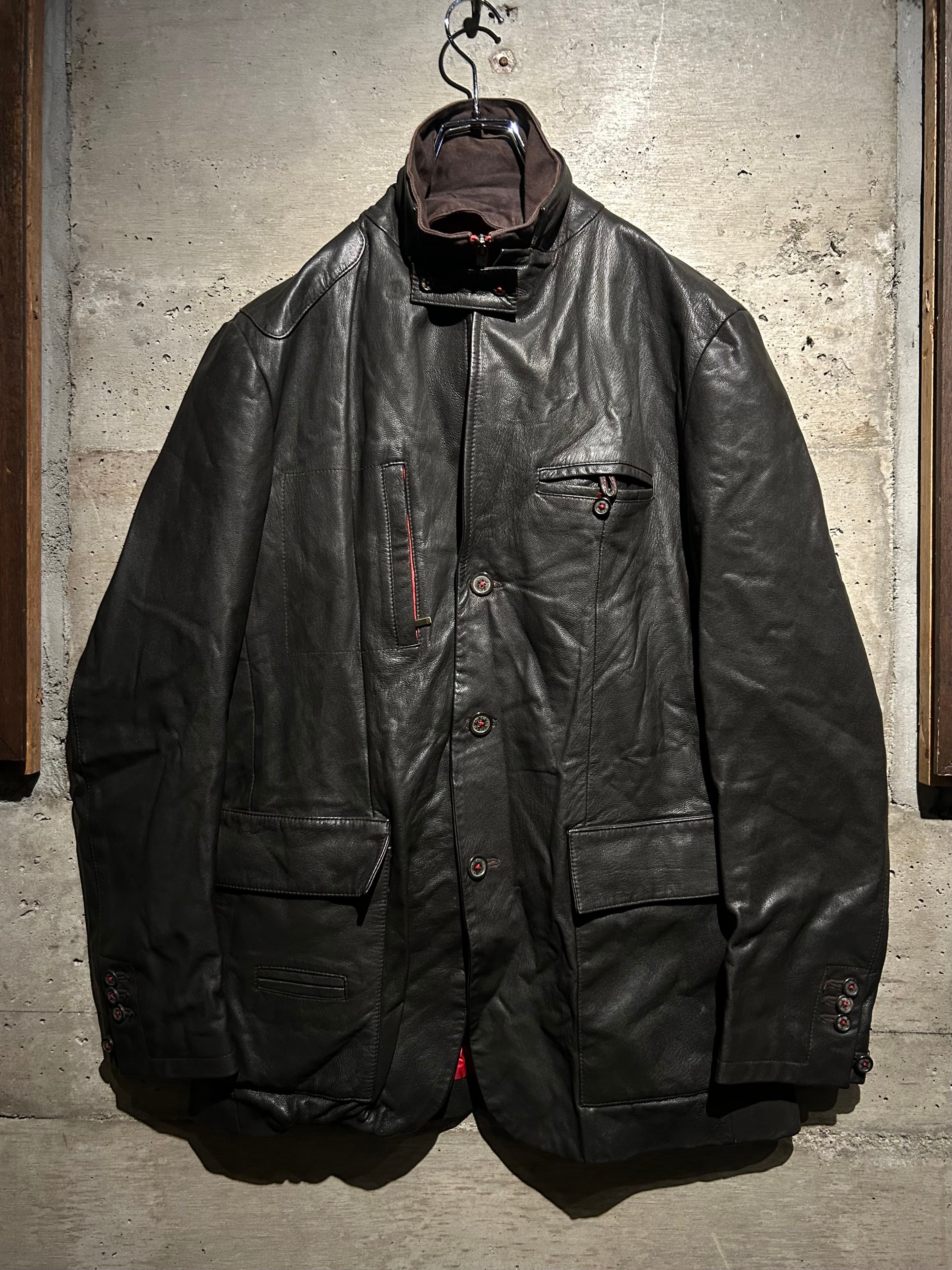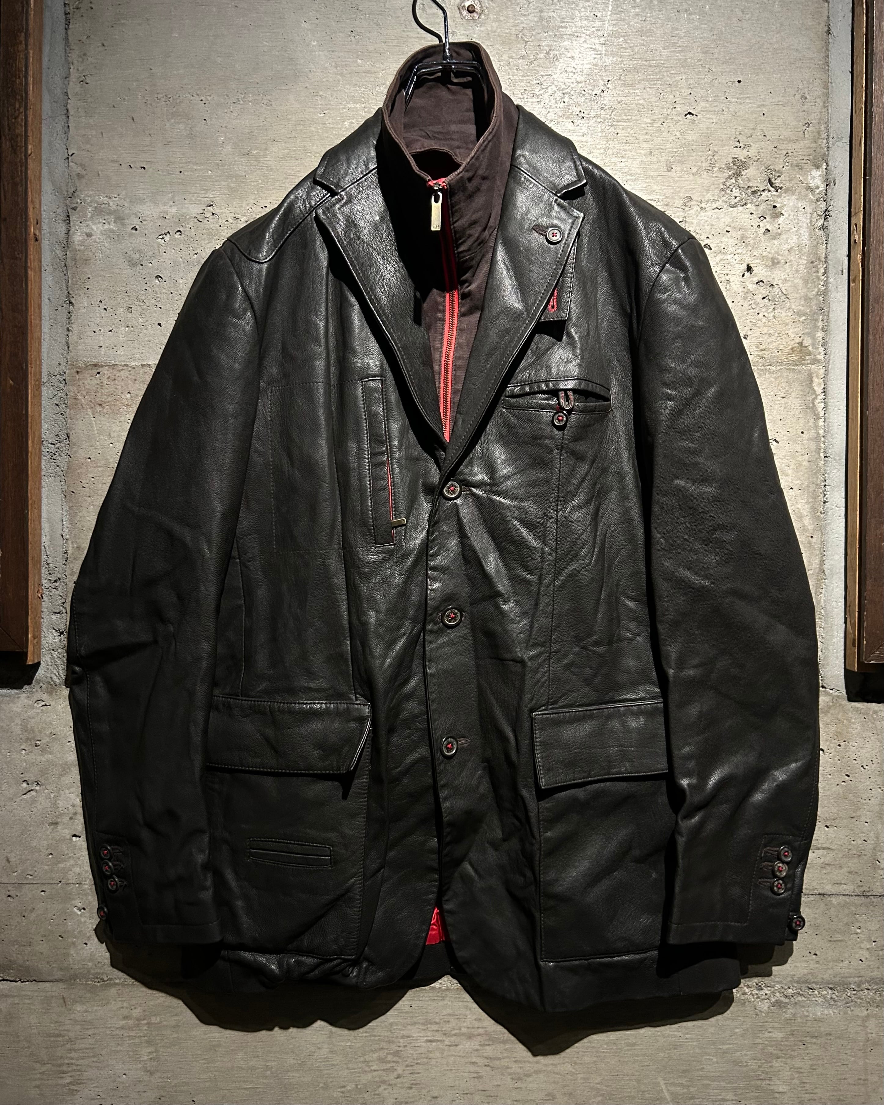 レザーの重みにテーラードの仕立てバランスが実に素晴らしい。フロントにはジップ式のインサートを搭載し、閉めればスタンドカラーのアウターとして成立する二重構造。内側から覗くレッドライニングが強いアクセントとなり、着脱の瞬間まで美しく見える仕上がりです。