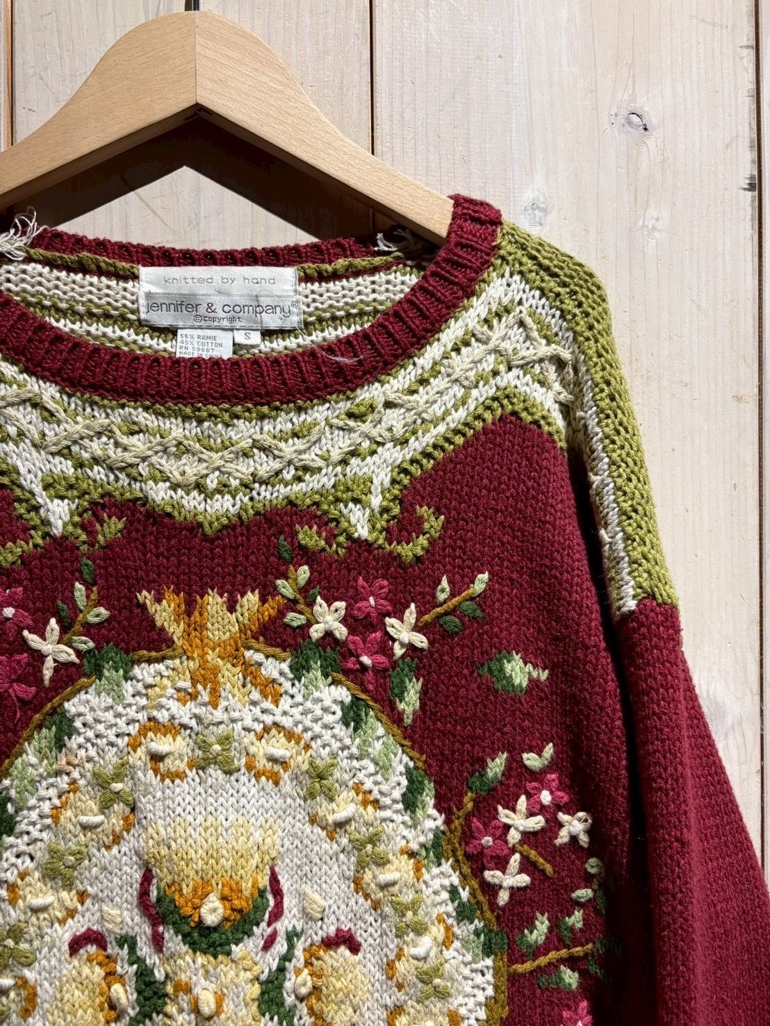 周囲に散らされた小花の刺繍もすべて手作業で、ハンドニットの中でも非常に高いクオリティ。デザインはもちろん、カラーバランスも素晴らしい、、