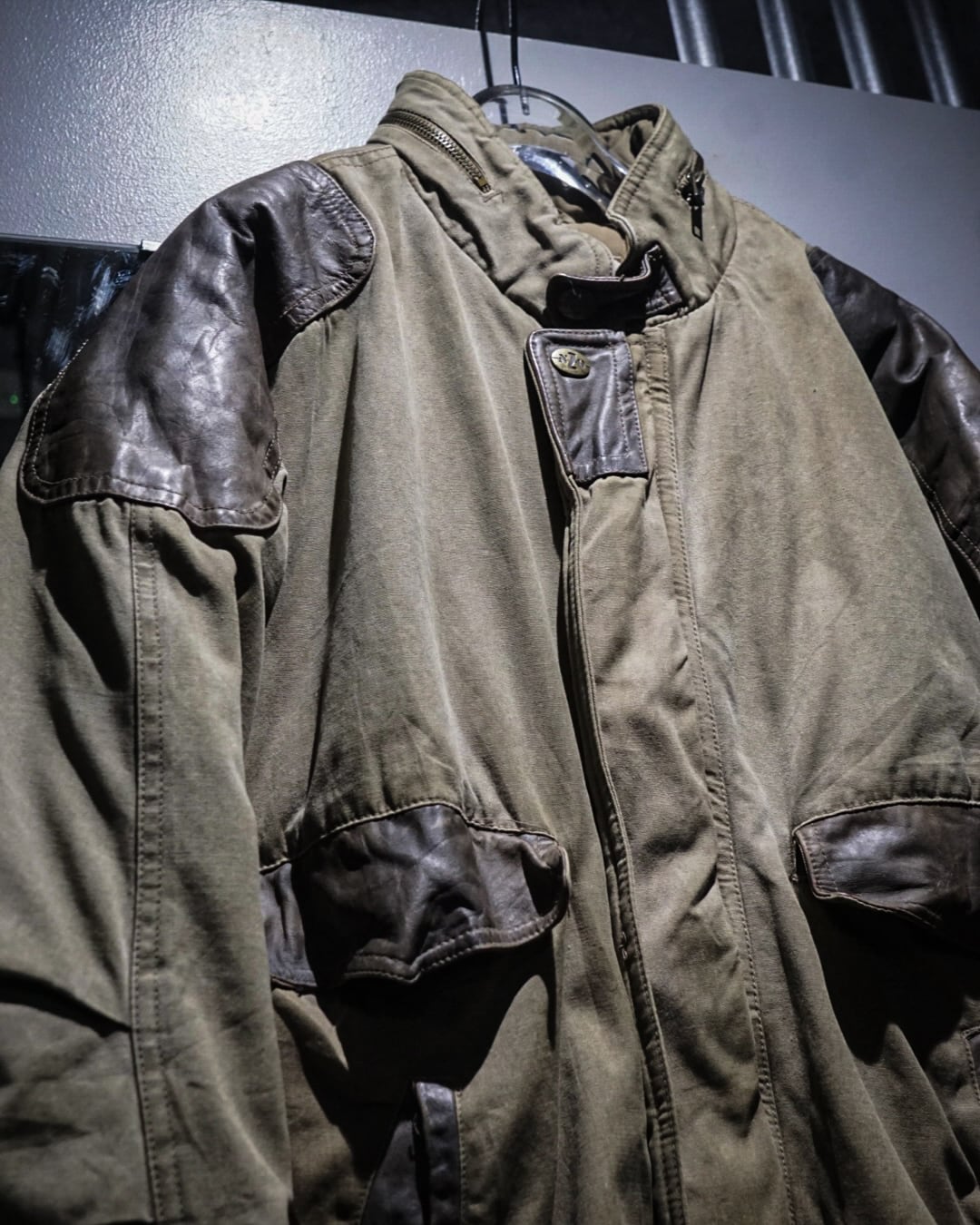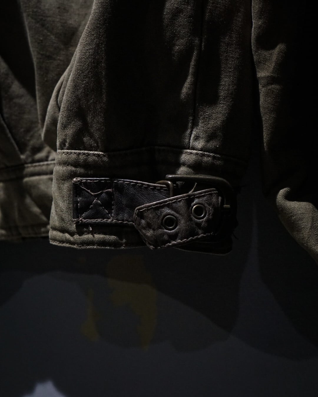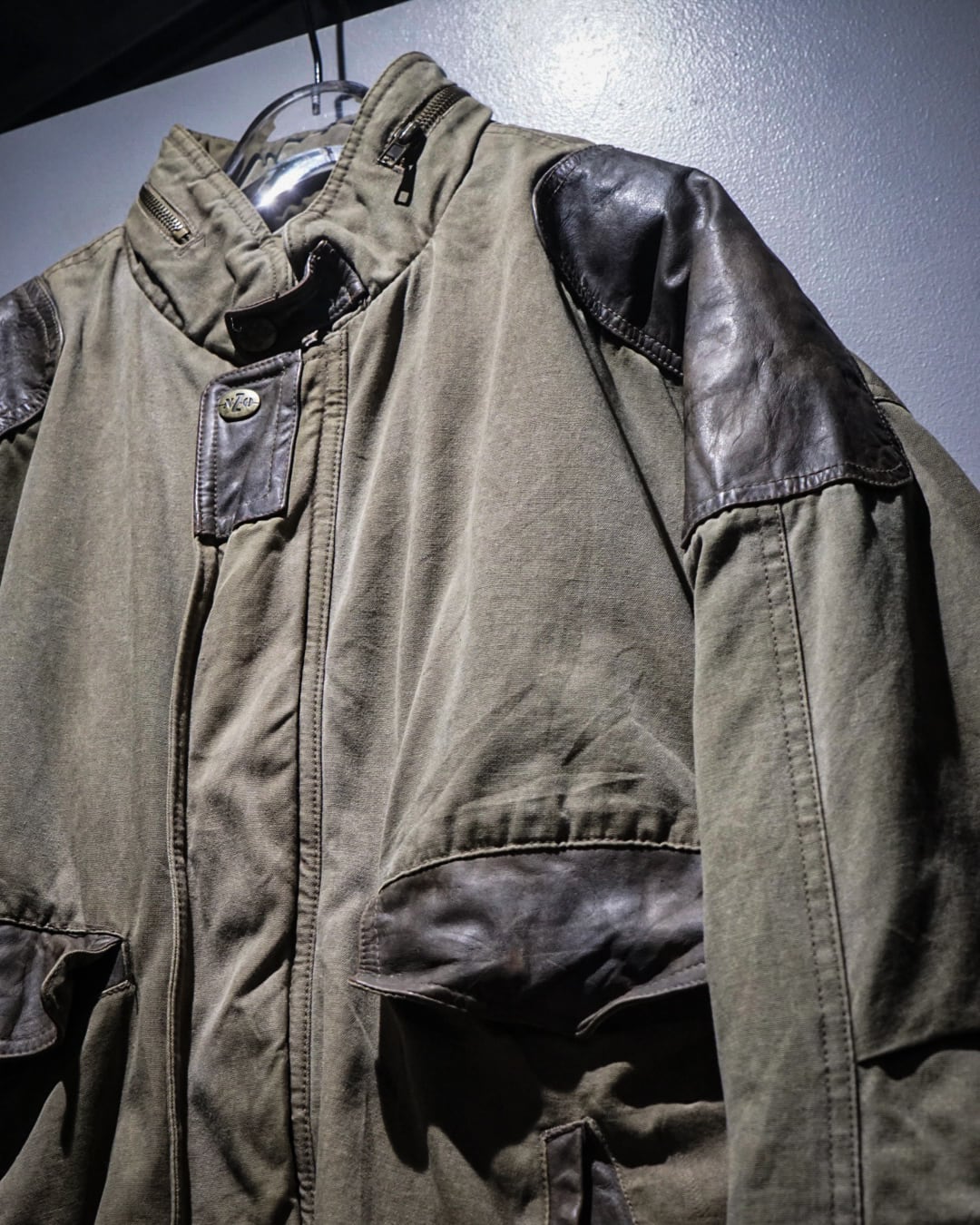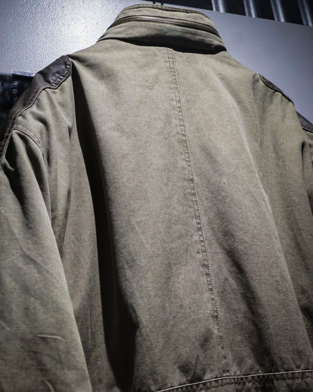 ボディはコットンらしいドライな質感と、経年によって生まれた絶妙なフェード感が魅力。カーキのトーンにレザーの濃淡が重なり、USEDならではの奥深い表情に仕上がっています。