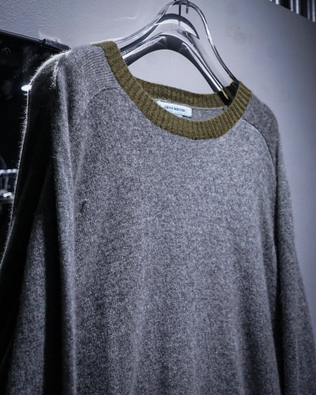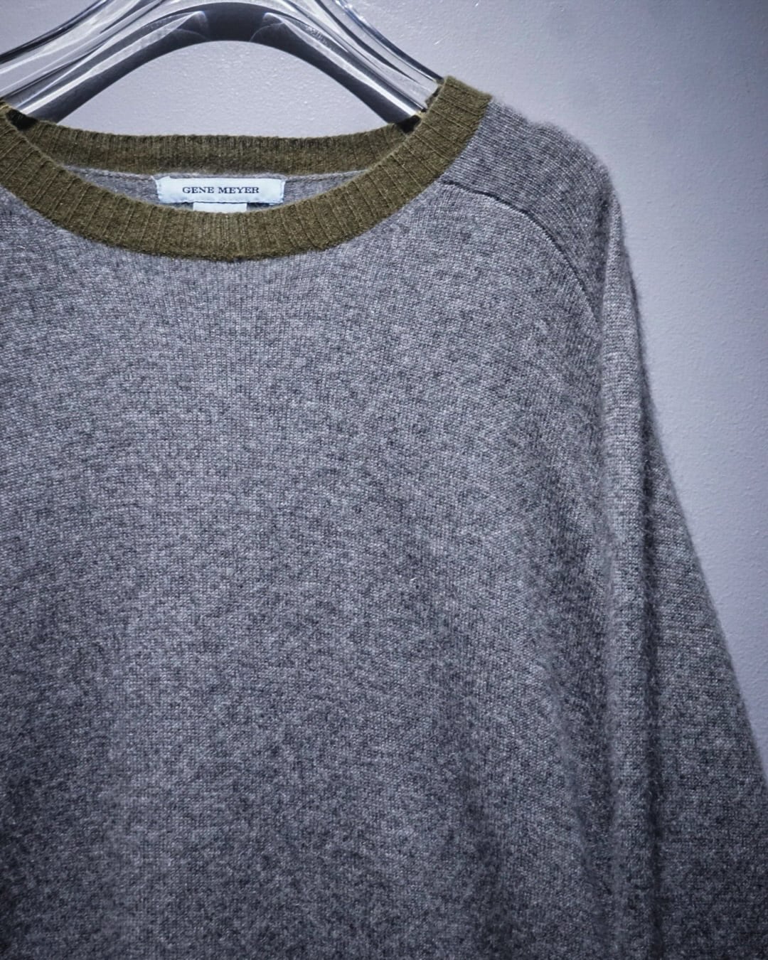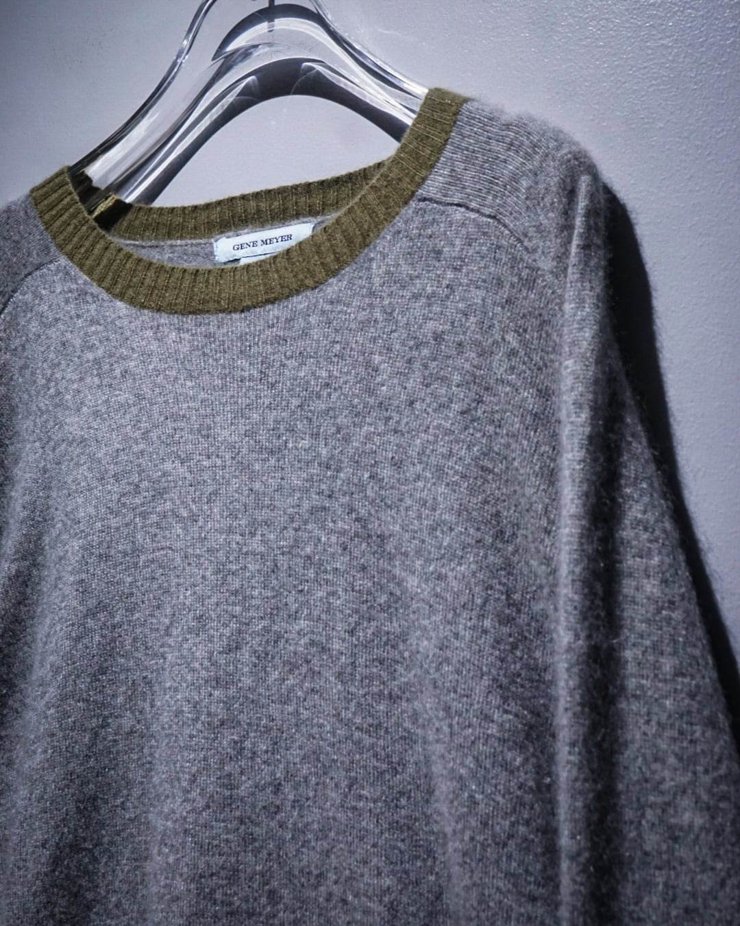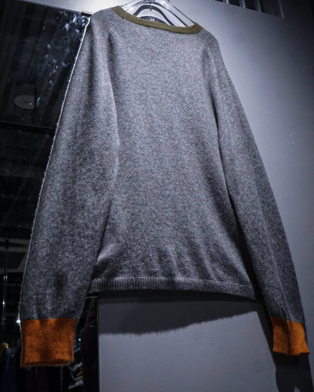 ボディは落ち着いたグレーで統一しながら、襟元のオリーブカラー、そして袖口に大胆に差し込まれた ビビッドなオレンジリブ がアクセントとなり、ミニマルな中に確かなデザイン性を宿した仕上がり。配色の妙がコーディネート全体の雰囲気を一段引き上げてくれます。