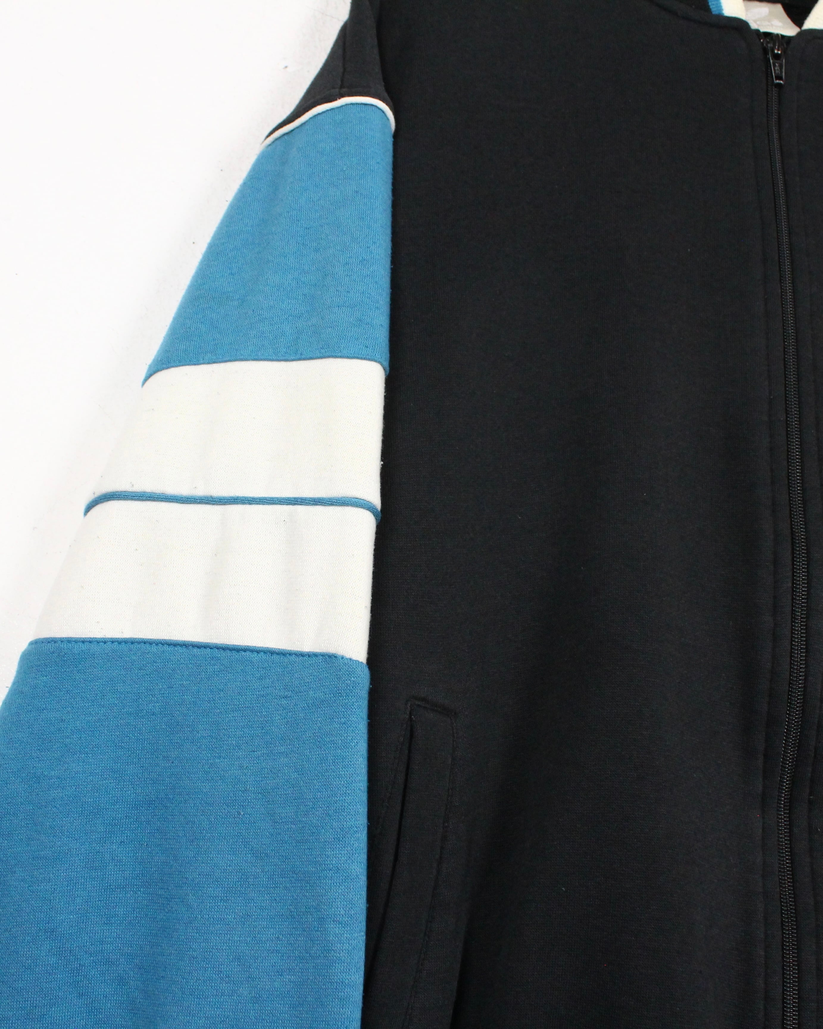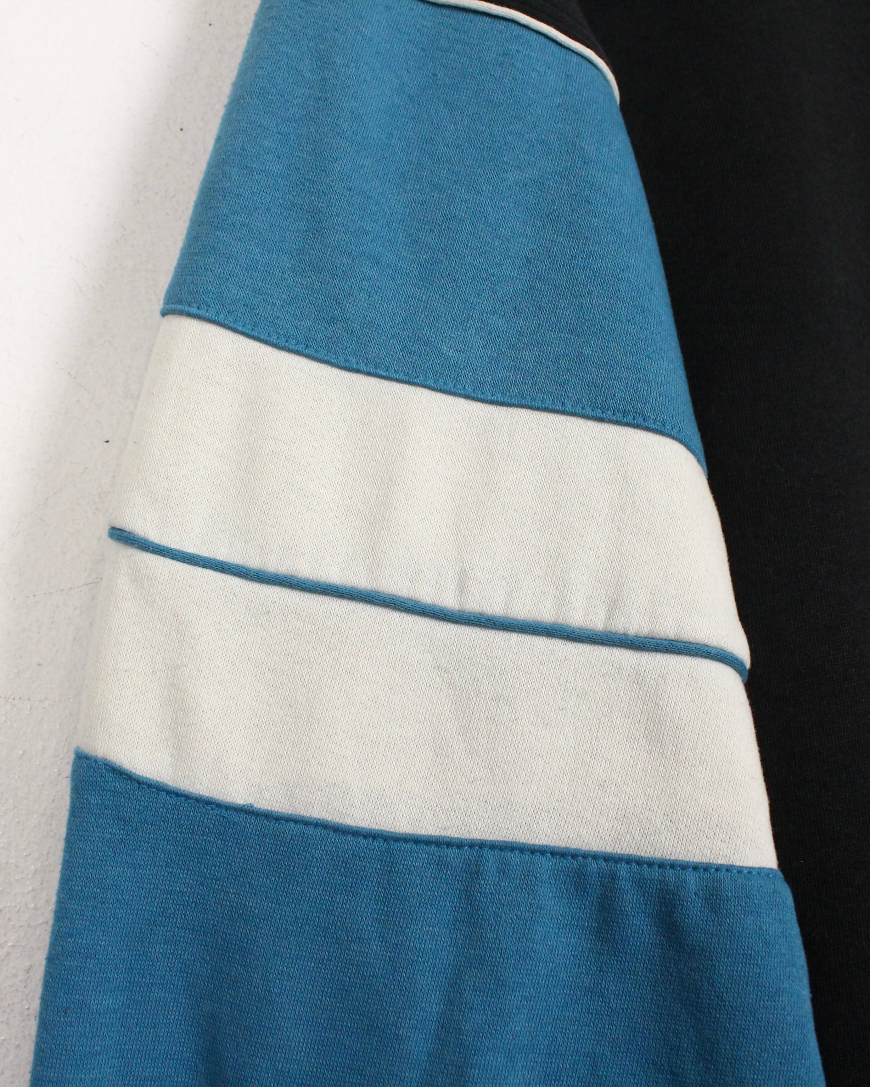 ブラックボディを軸に、スリーブへ大胆に入ったターコイズ×ホワイトの切り替えが目を惹き、この年代ならではのスポーティかつレトロな雰囲気が漂います。