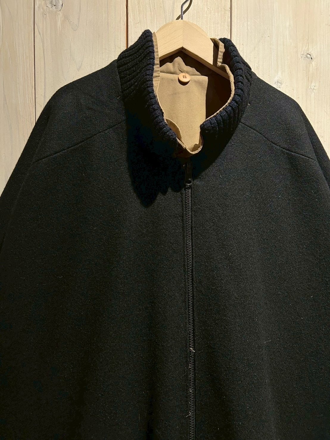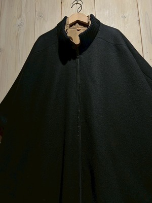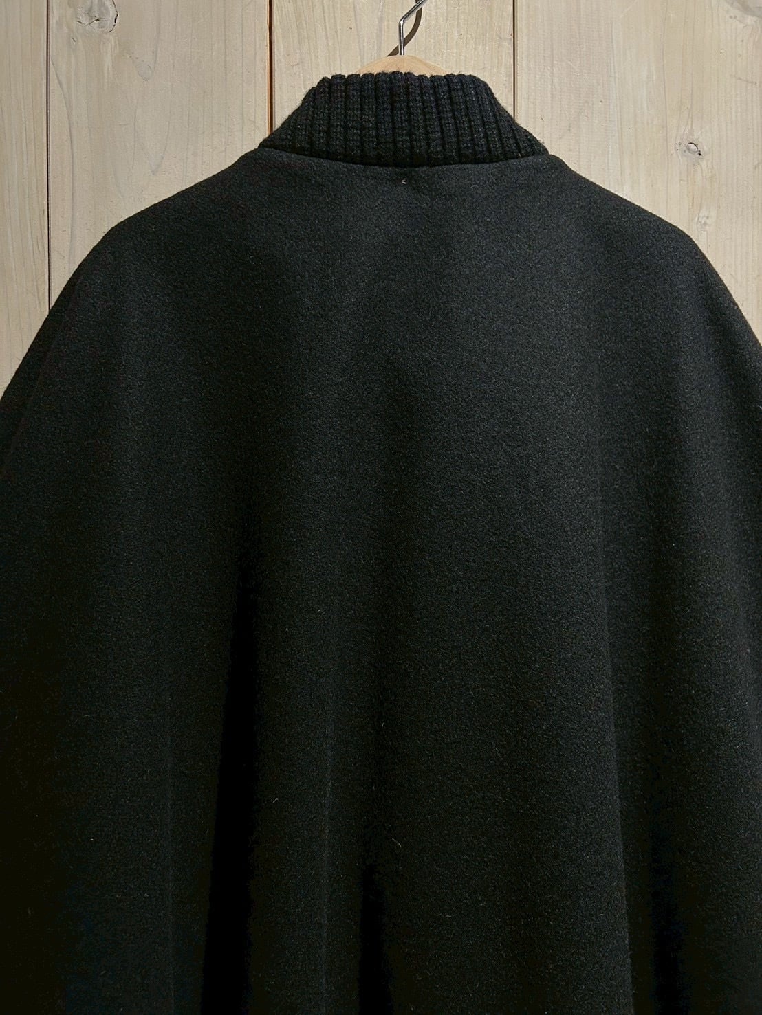 一方のブラック面はウール仕立て。柔らかい起毛感とふわりと落ちるシルエットが相まって、よりラグジュアリーで落ち着いた印象に。リブ編みのネックがアクセントとなり、ケープのように包み込むシルエットが美しい面構えです。