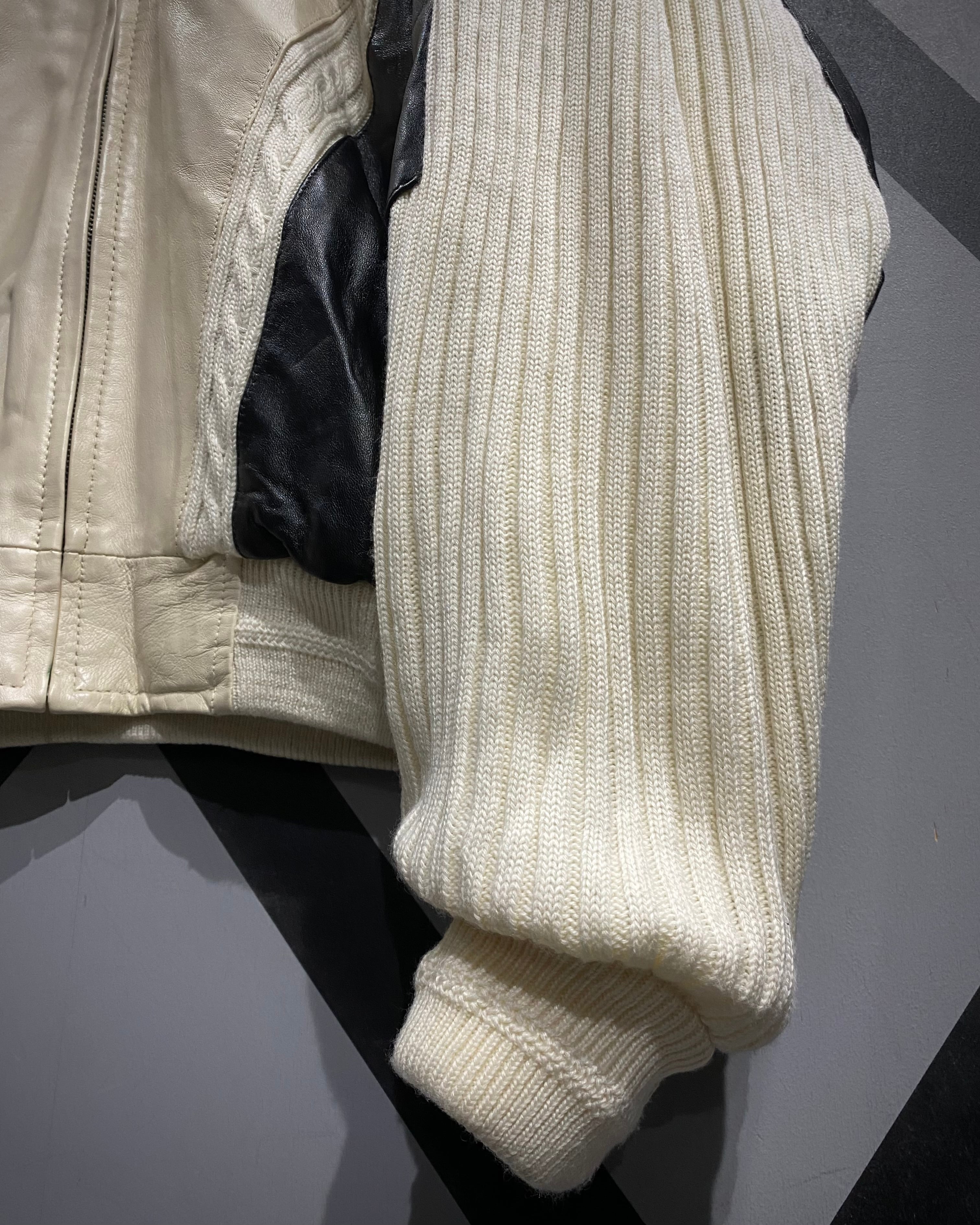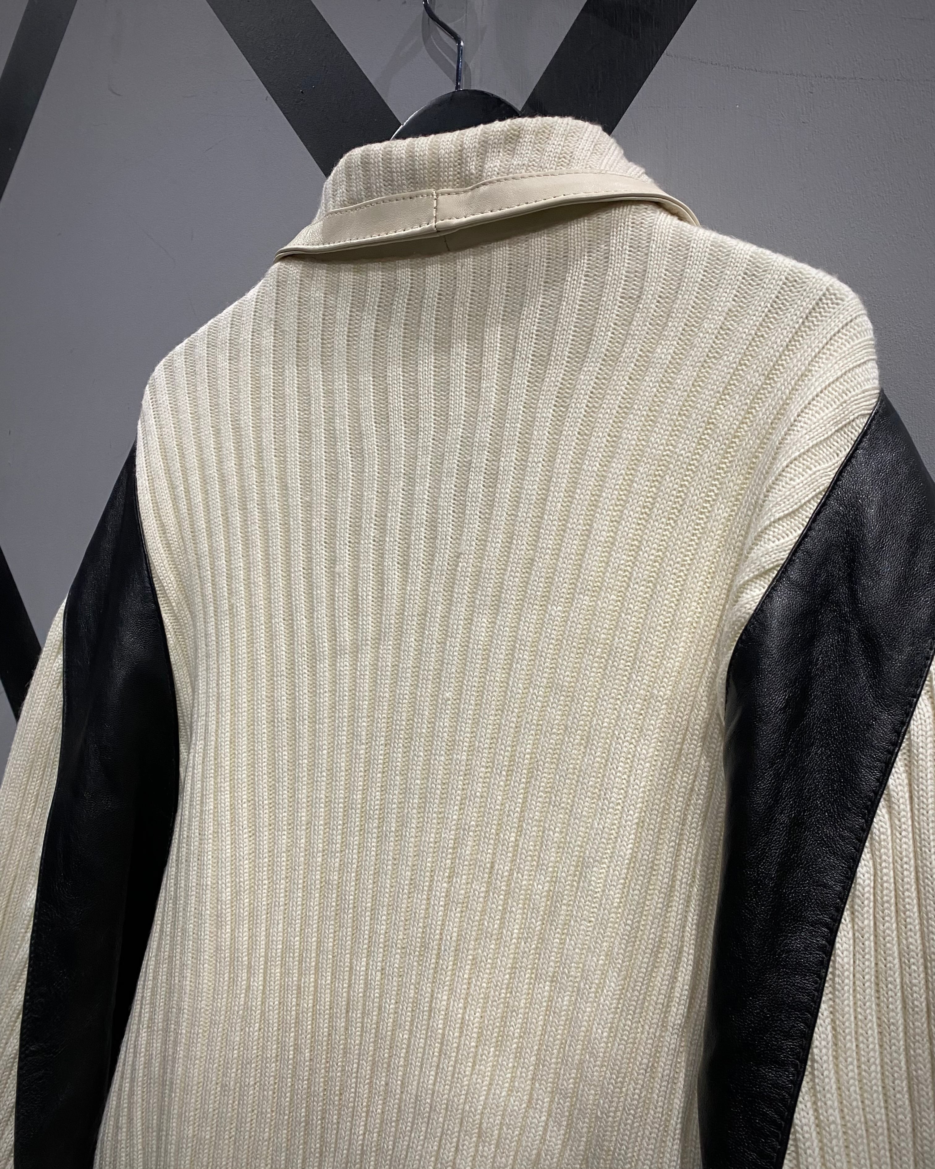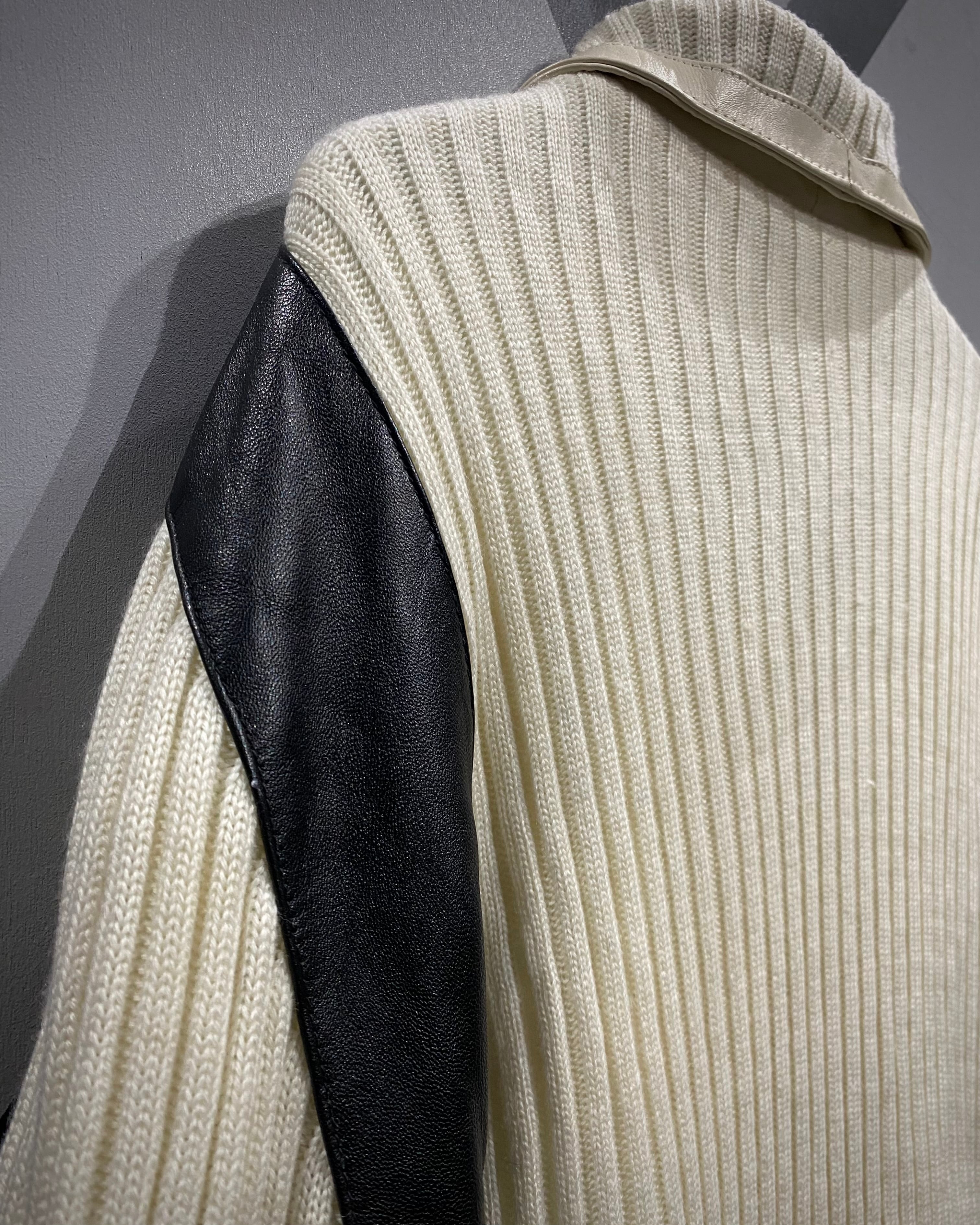 アイボリー×ブラックのモノトーン配色も秀逸で、決して派手ではないのにしっかり主張するバランス感で、レザーの切り替えラインや、ケーブル編みを走らせたニットの表情が奥行きを作り、着るだけでスタイリングの主役になる1着に仕上がっています。