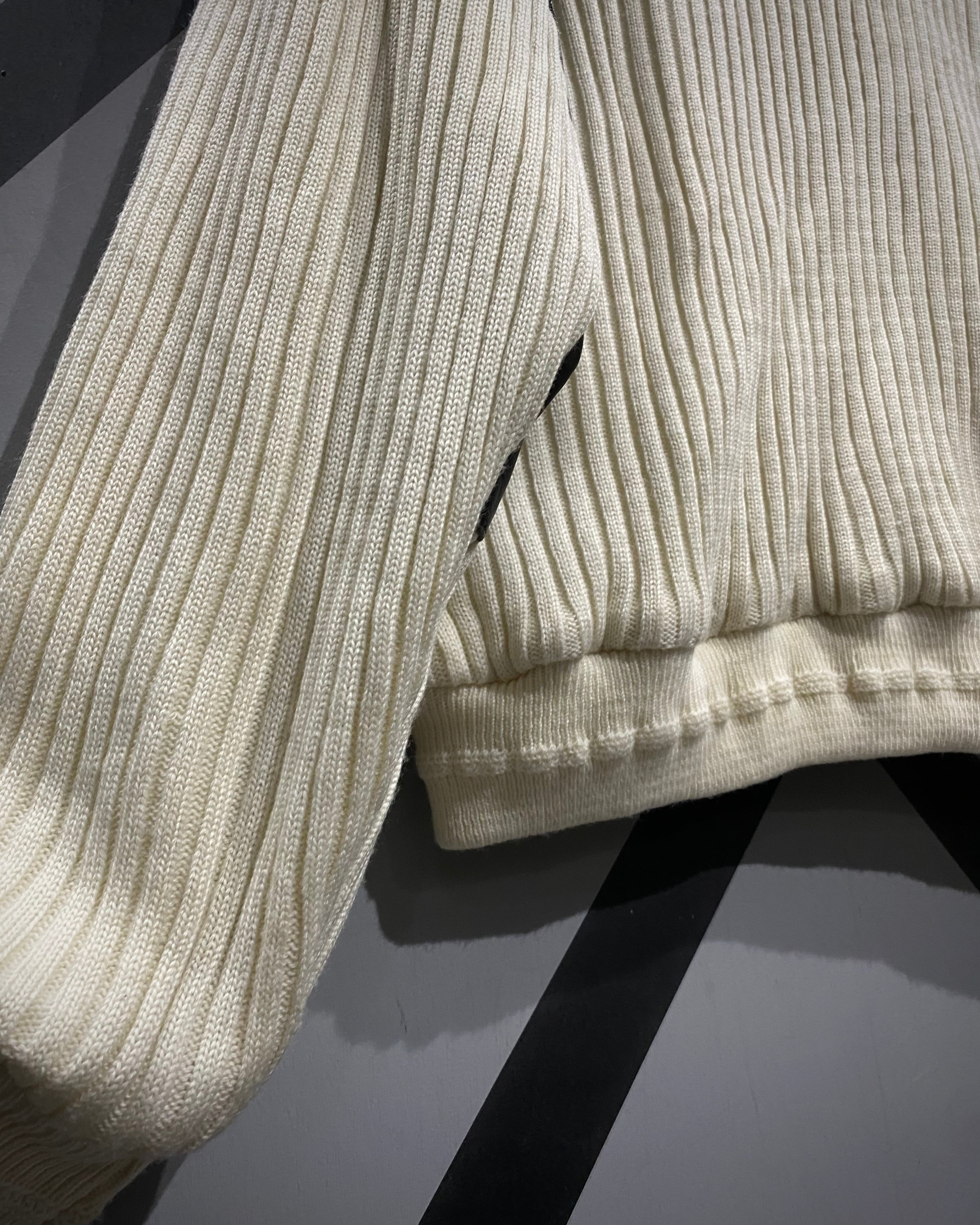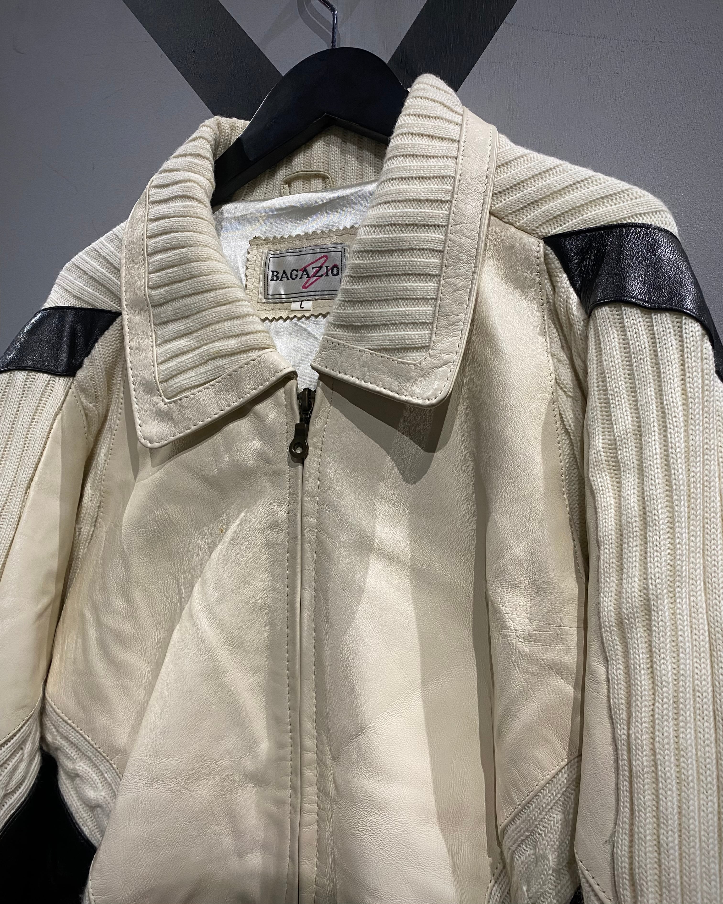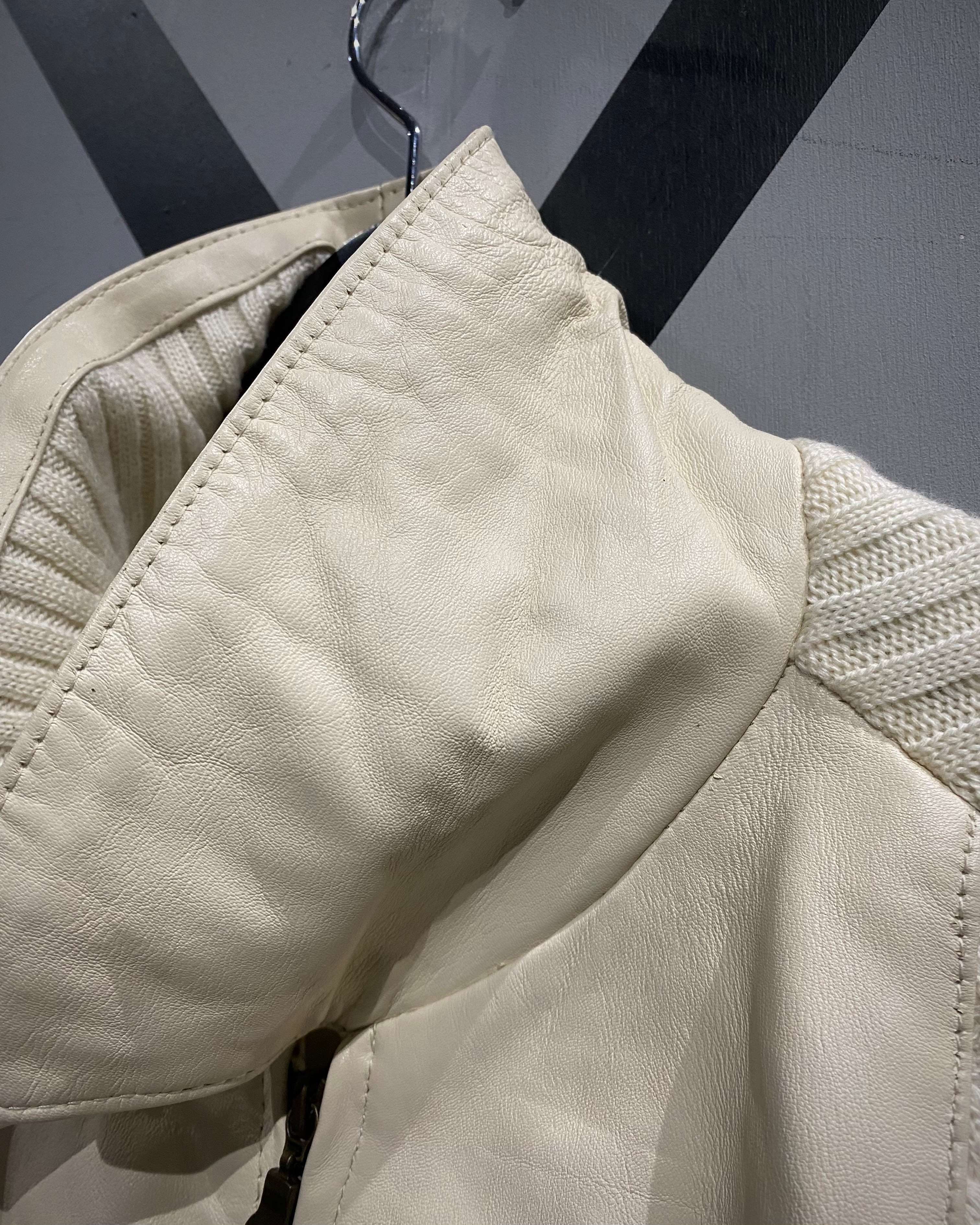 アイボリー×ブラックのモノトーン配色も秀逸で、決して派手ではないのにしっかり主張するバランス感で、レザーの切り替えラインや、ケーブル編みを走らせたニットの表情が奥行きを作り、着るだけでスタイリングの主役になる1着に仕上がっています。