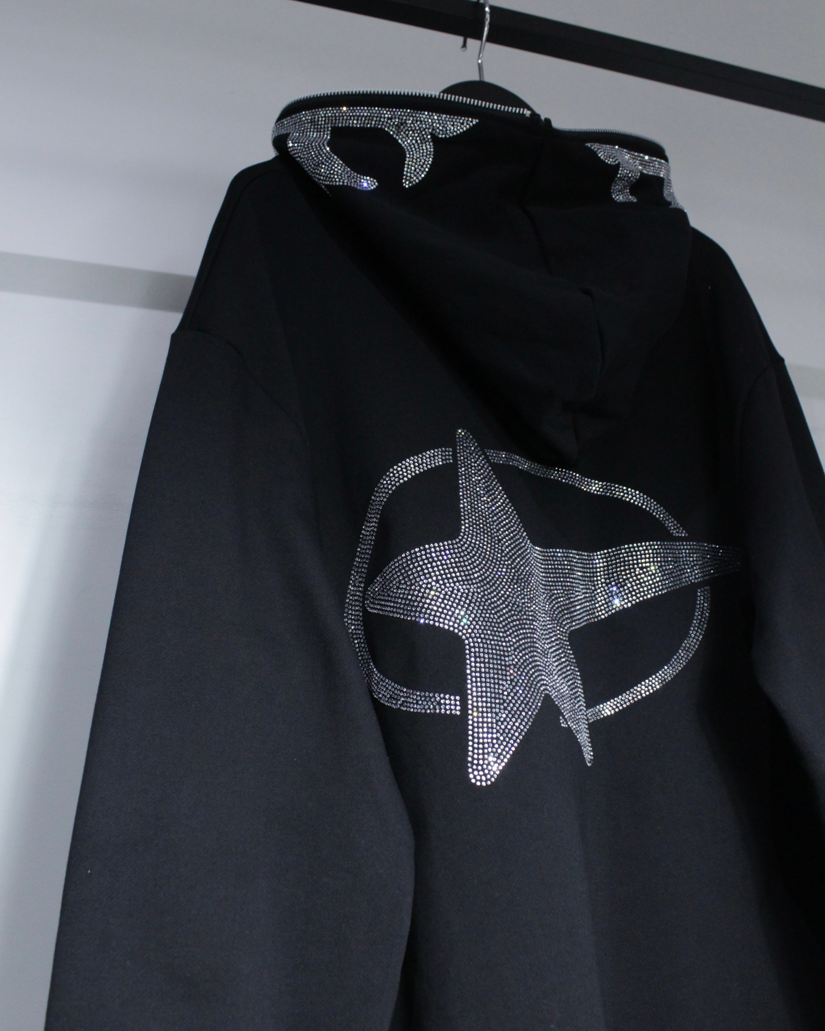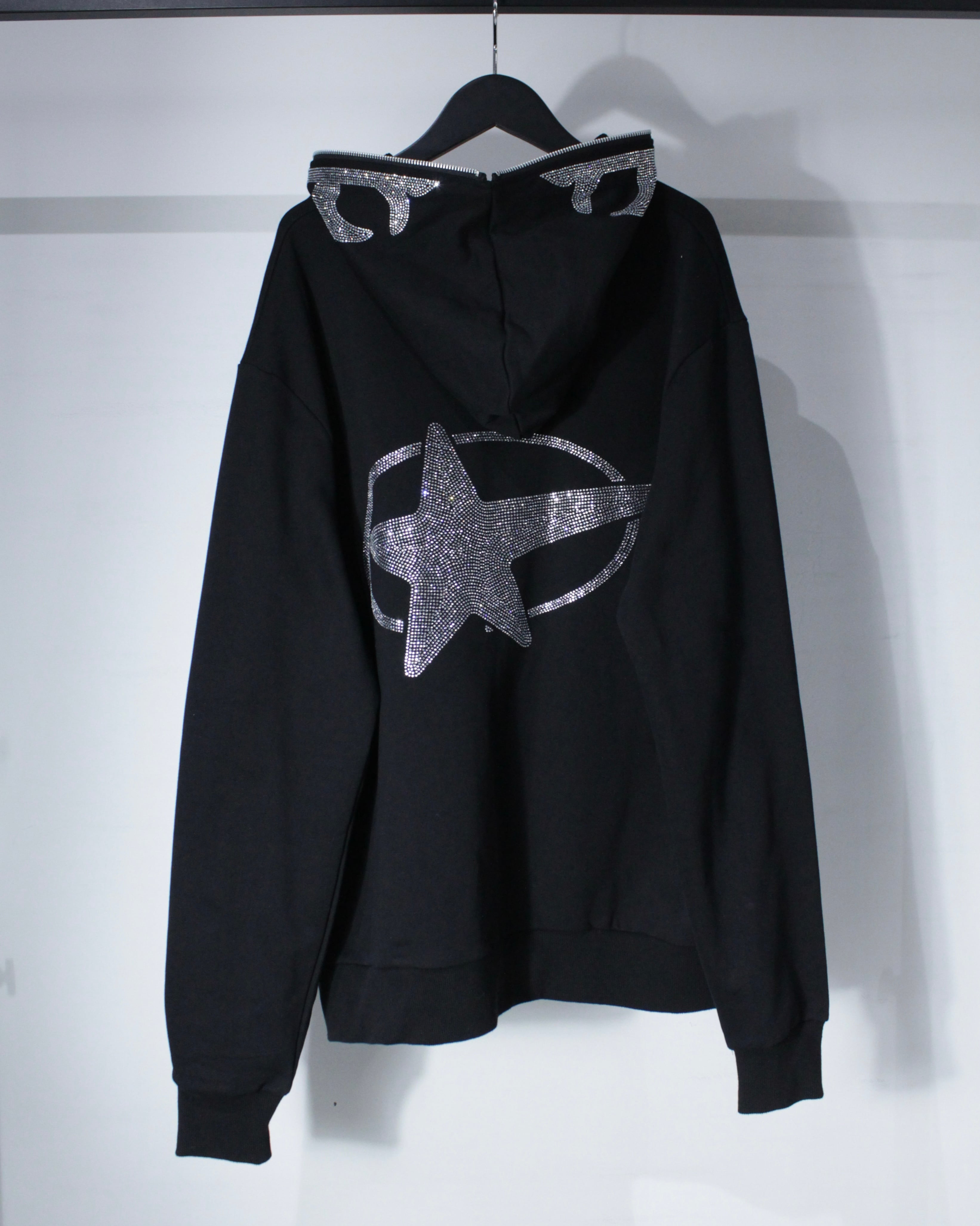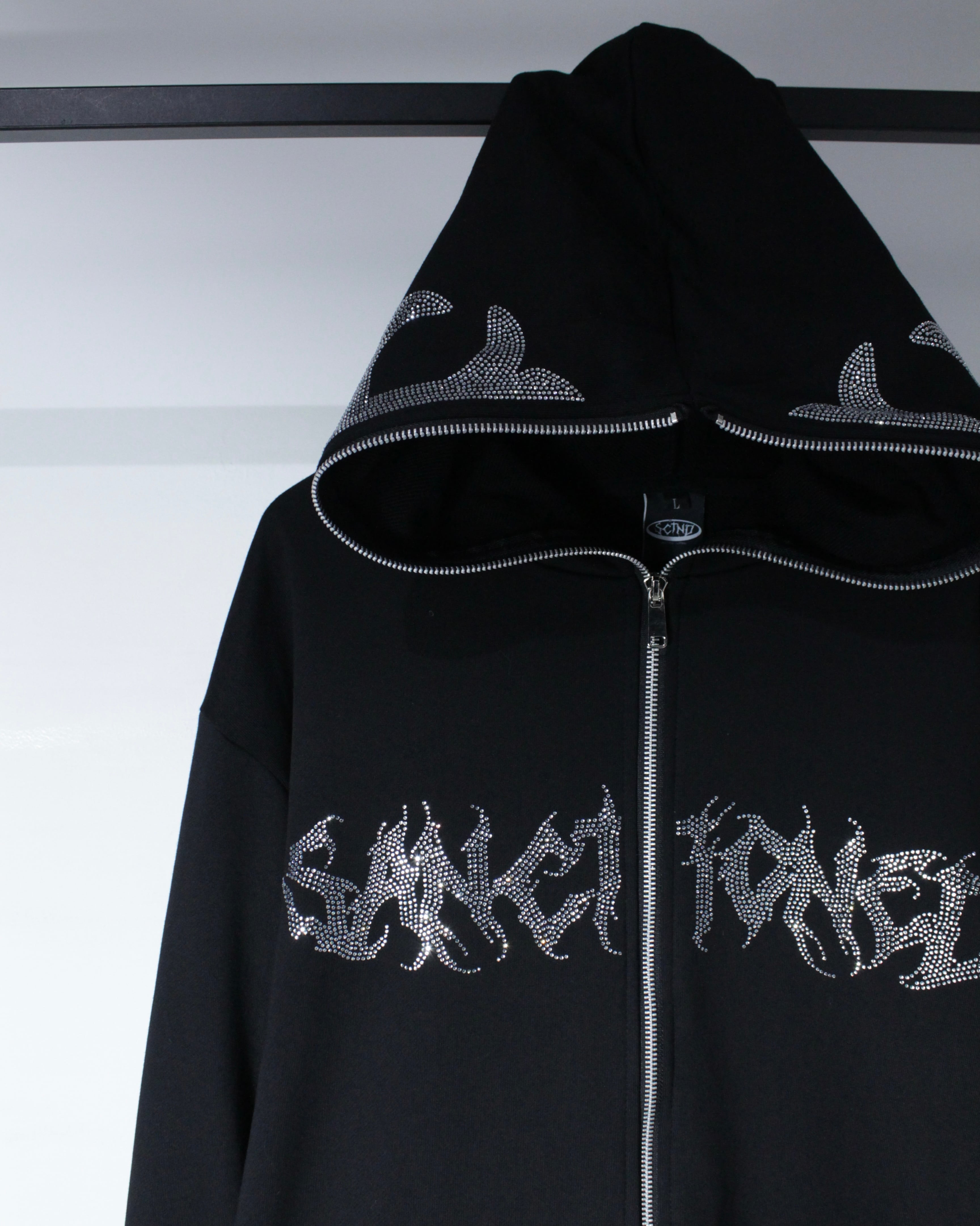 煌びやかなストーンワークを大胆に配した、存在感抜群のフルジップフーディです。