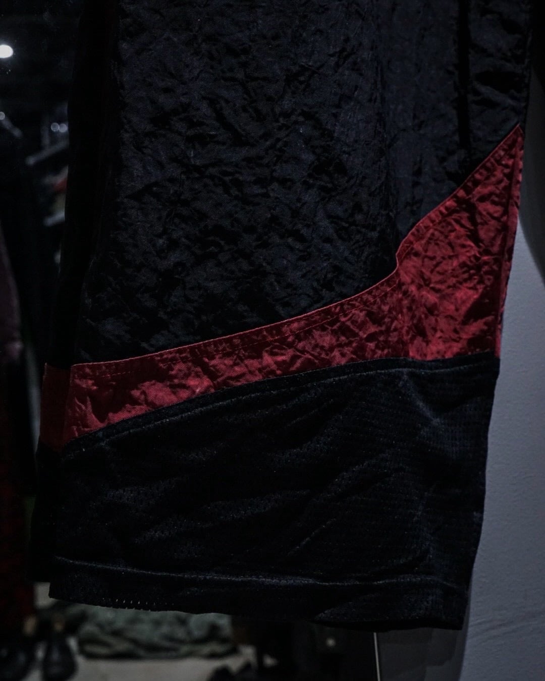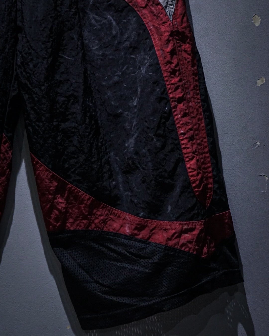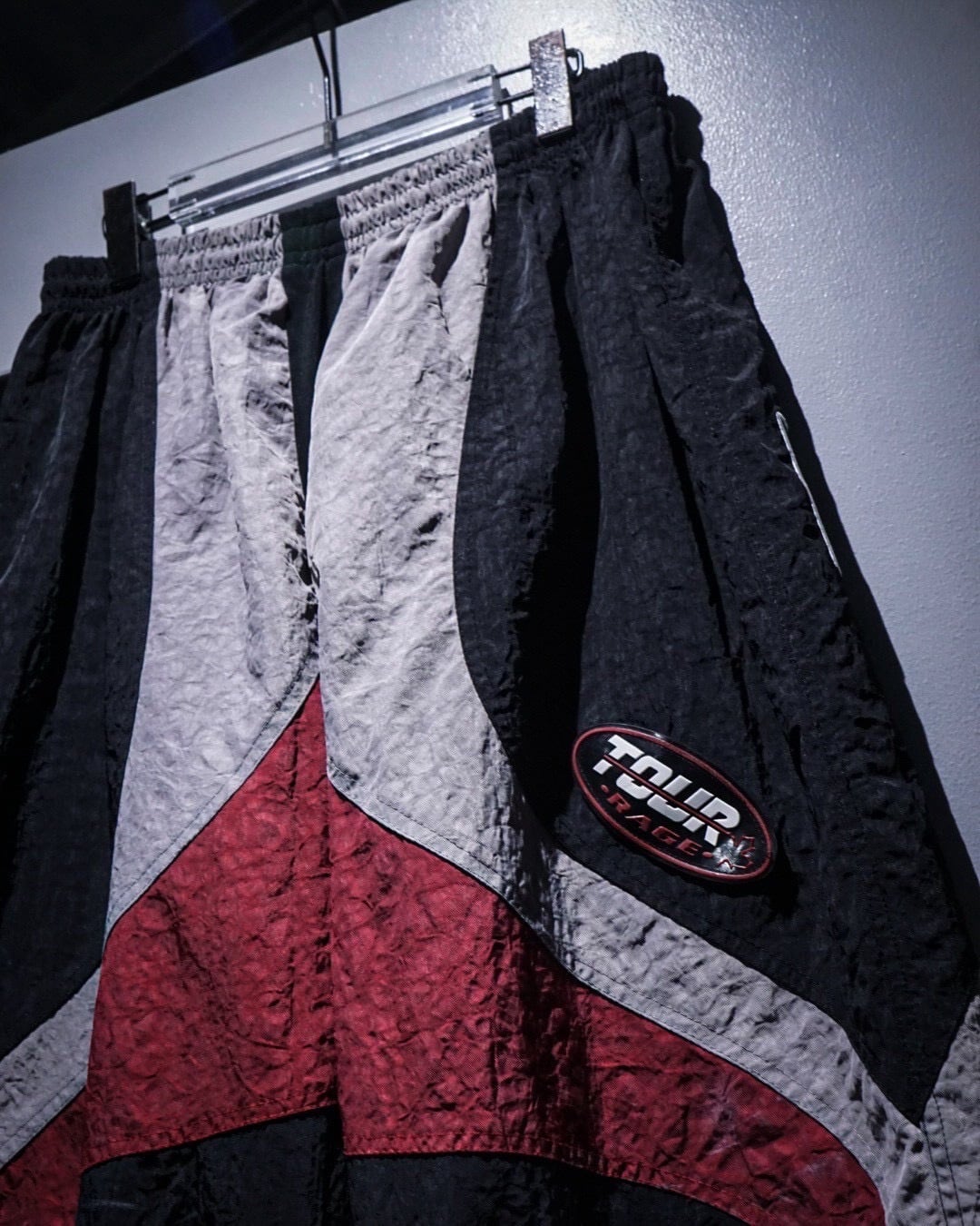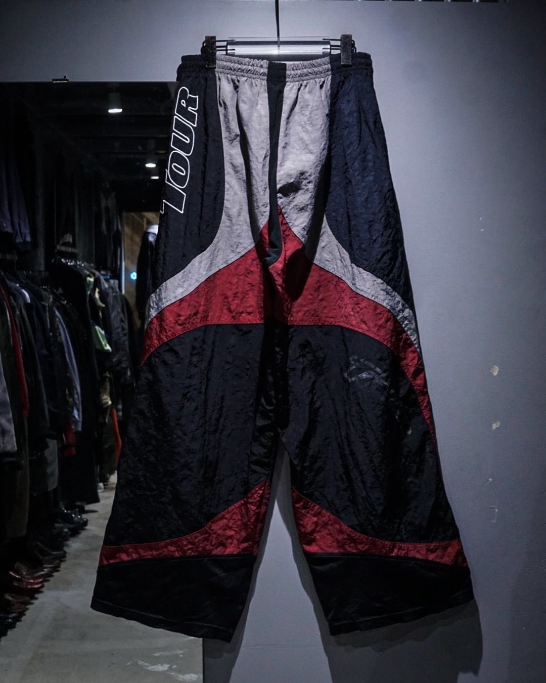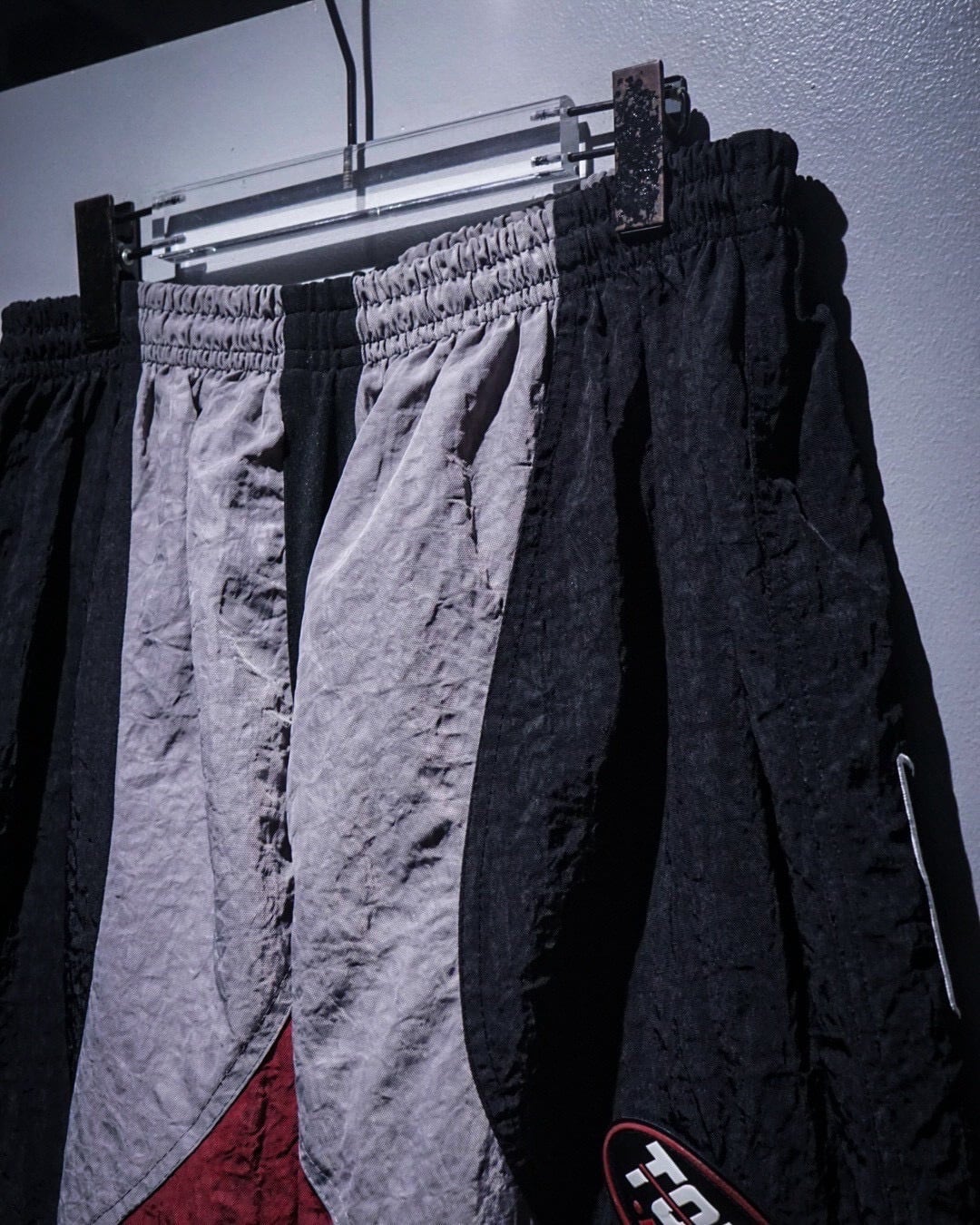 ブラックをベースに、レッドとシルバーで切り替えを重ねたデザインが存在感を放つ極太のナイロンパンツ。