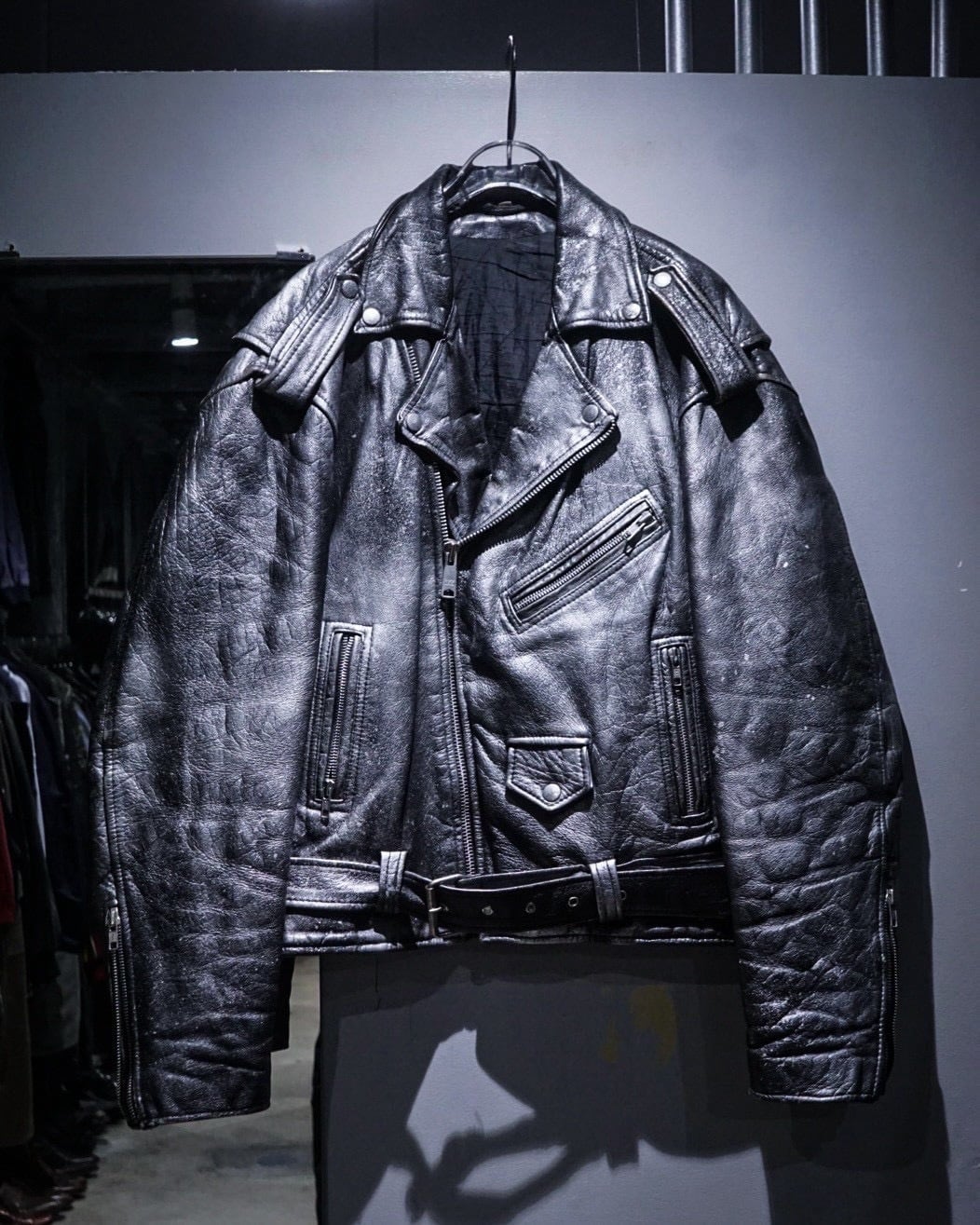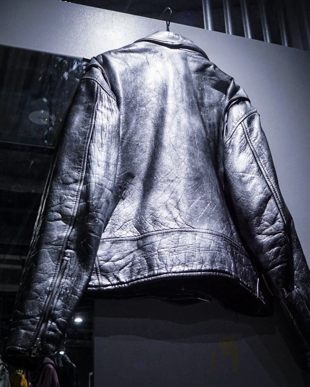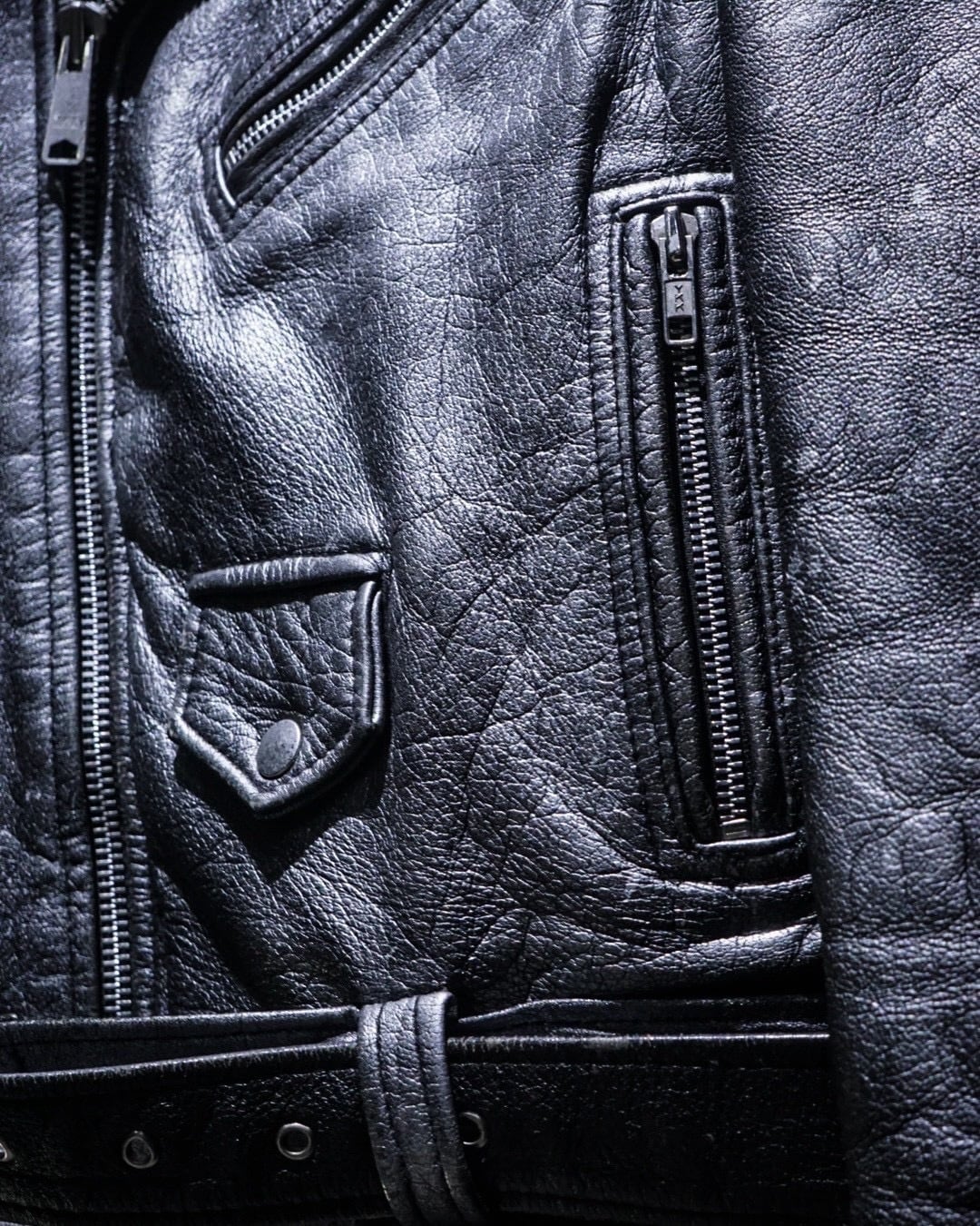 王道なダブルライダースのジップラインに複数のポケット、重厚なウエストベルトと、ディテールはクラシックそのもの。そこにシルバーペイントが加わることで、唯一無二の存在感へと昇華されており、無骨さとファッション性のバランス感も最高ですね。