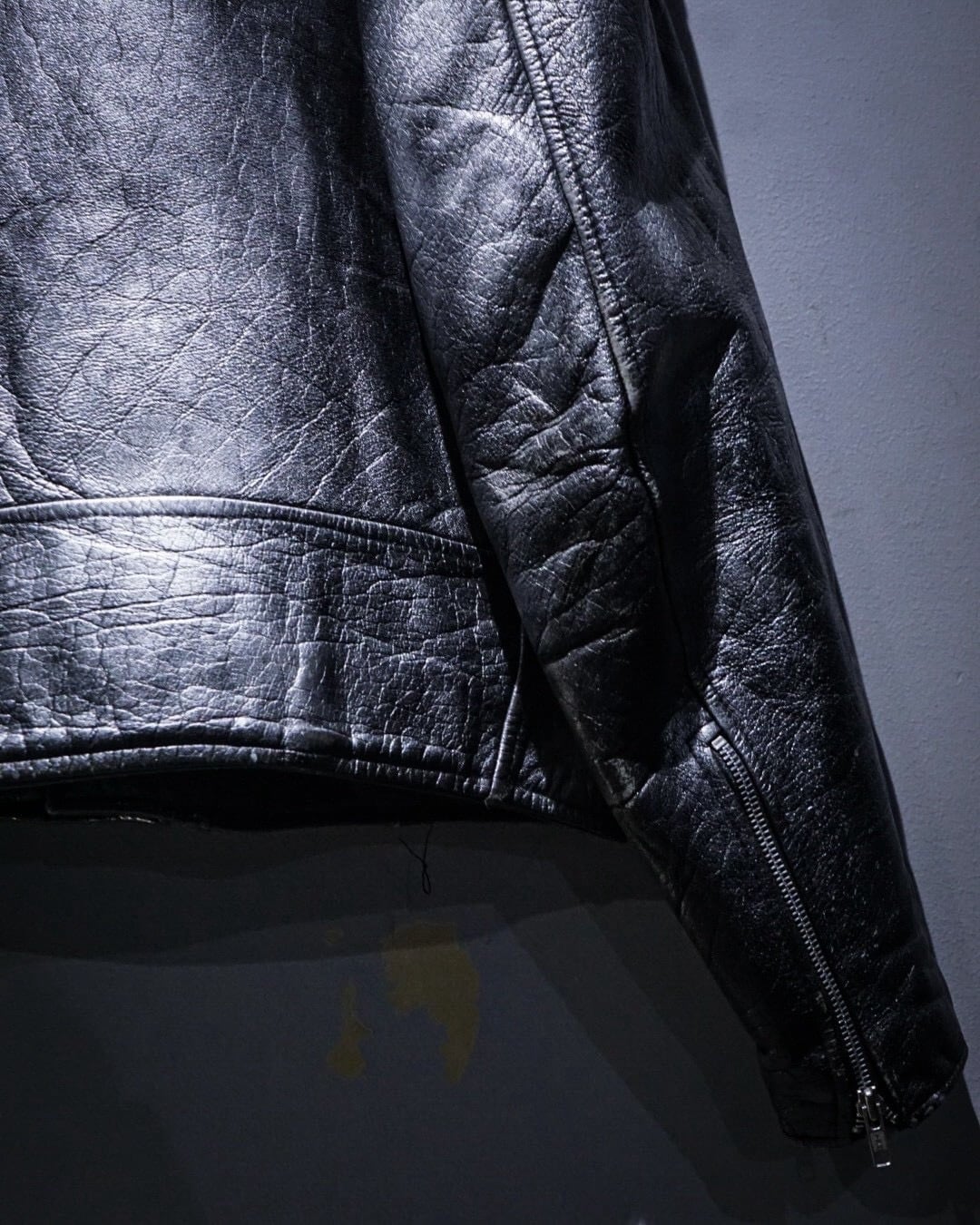 深く刻まれたシワと重みのあるブラックレザー。その上に散らすように入ったシルバーのスプレーが陰影を生み、レザーの立体感をより強調しています。