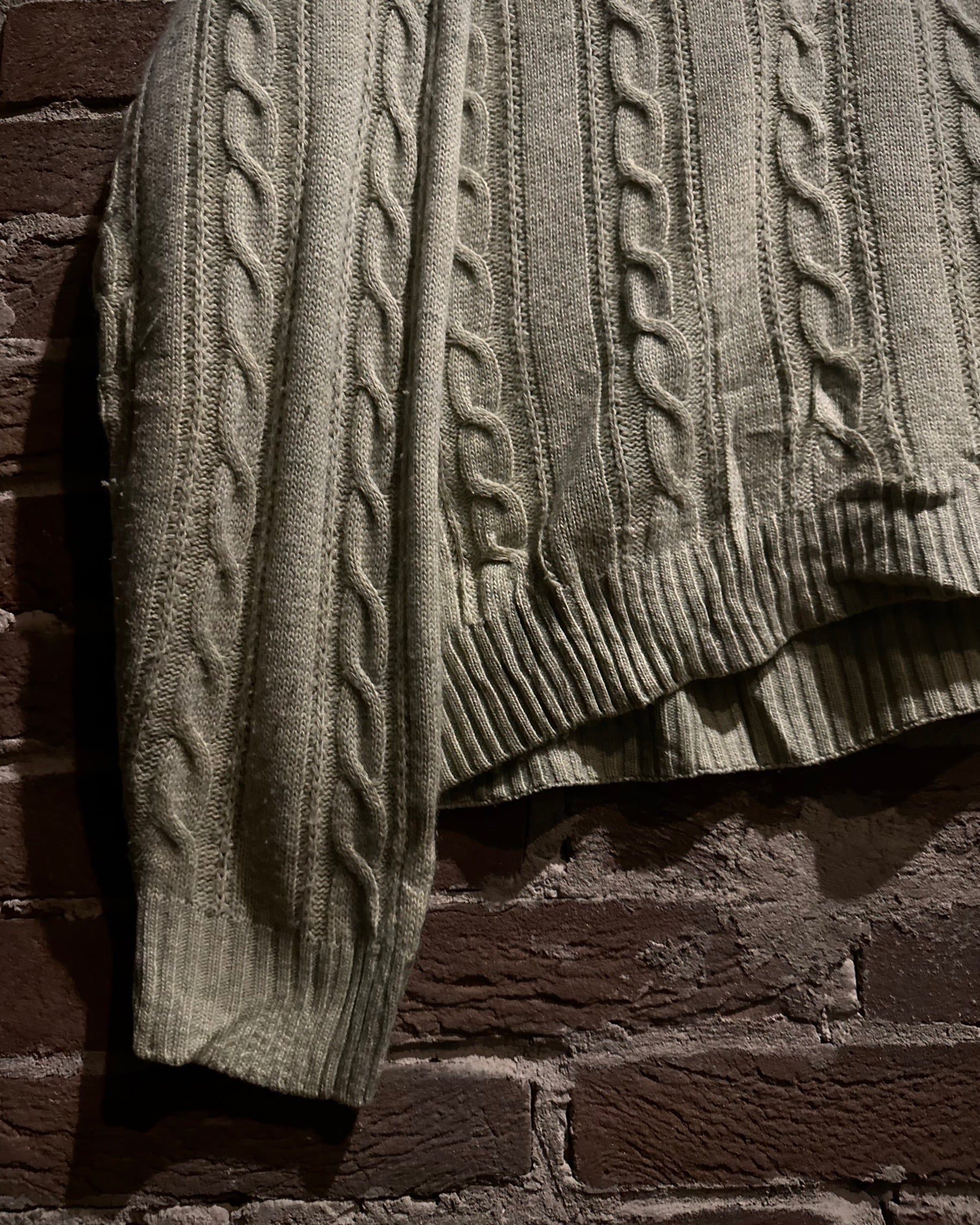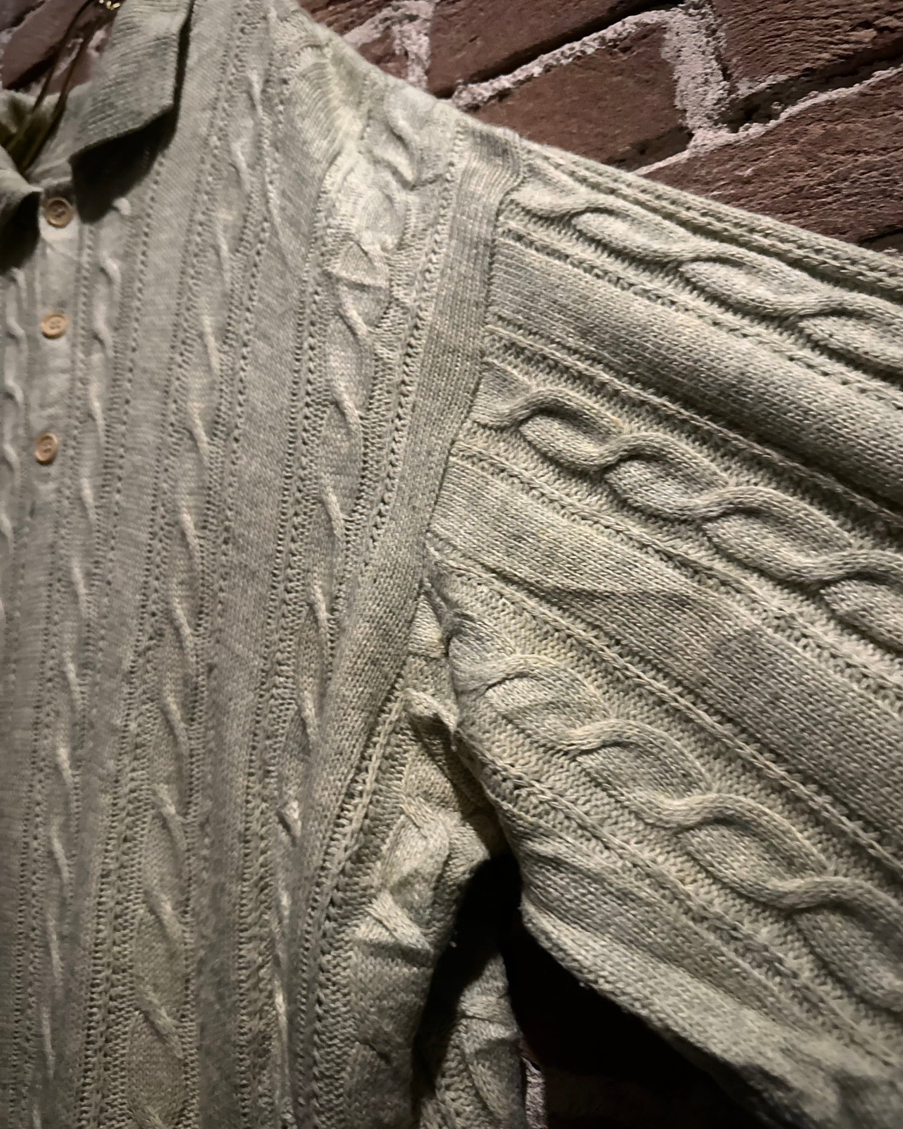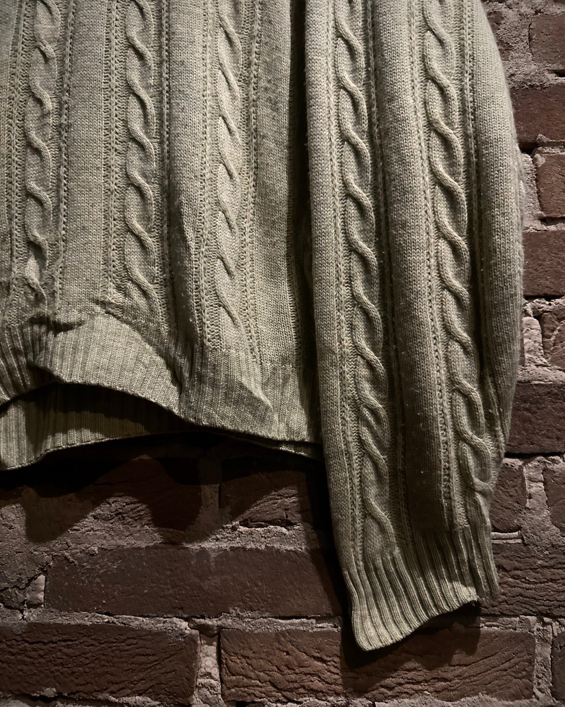 淡いセージ寄りのグリーンが上品で、光の当たり方で柔らかく表情を変える絶妙なトーン。ケーブル編みの立体的がシンプルながら存在感を漂わせています。