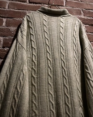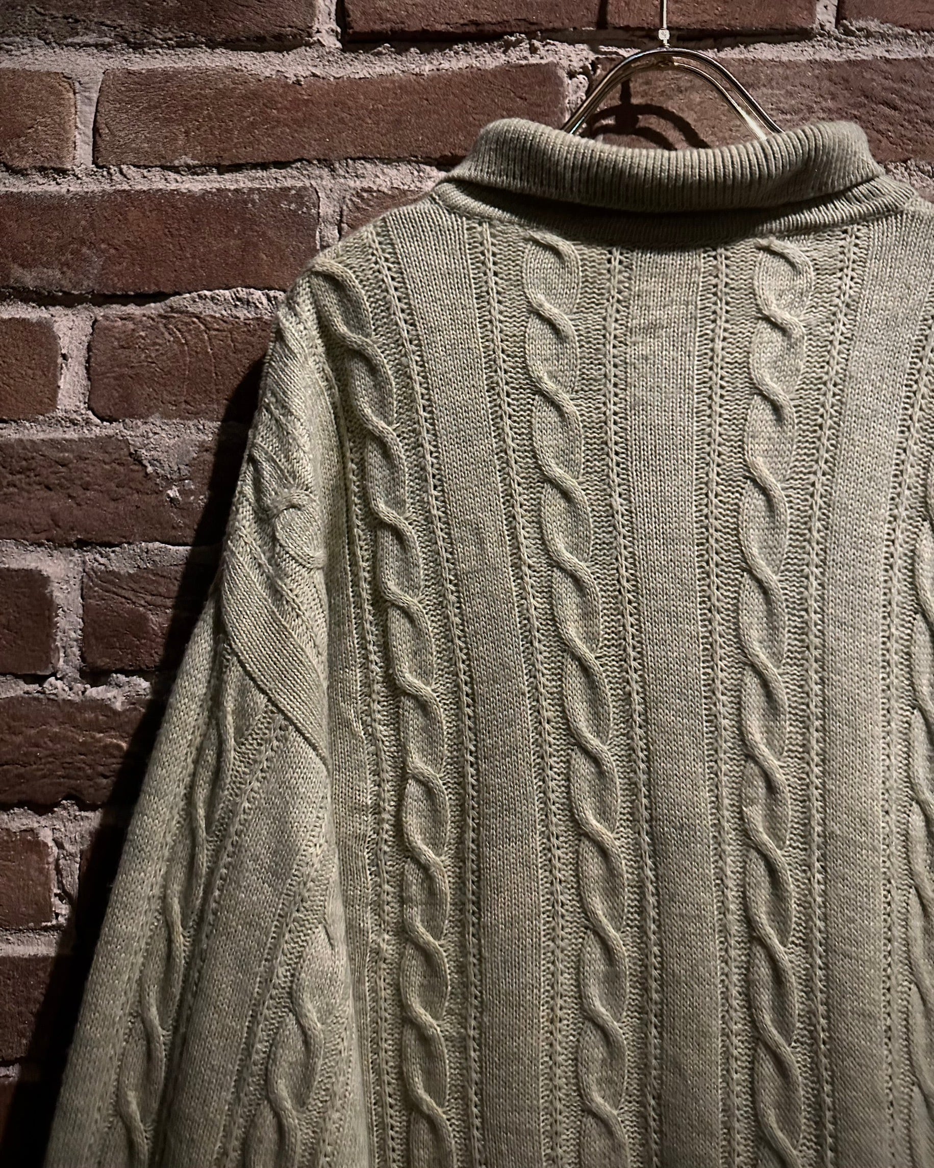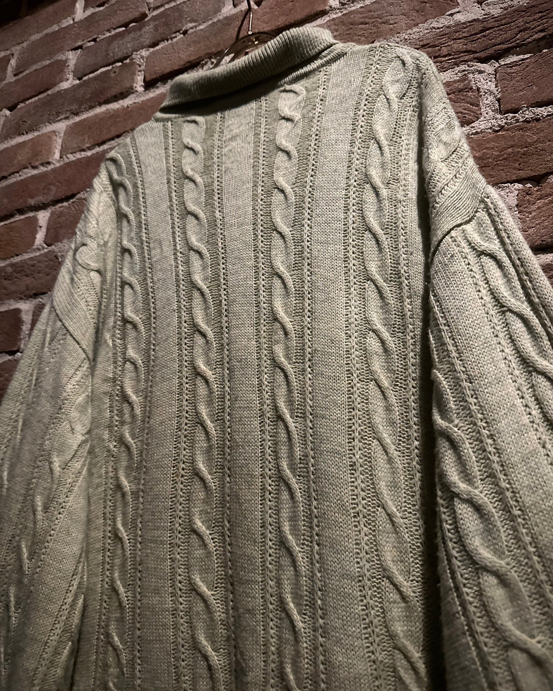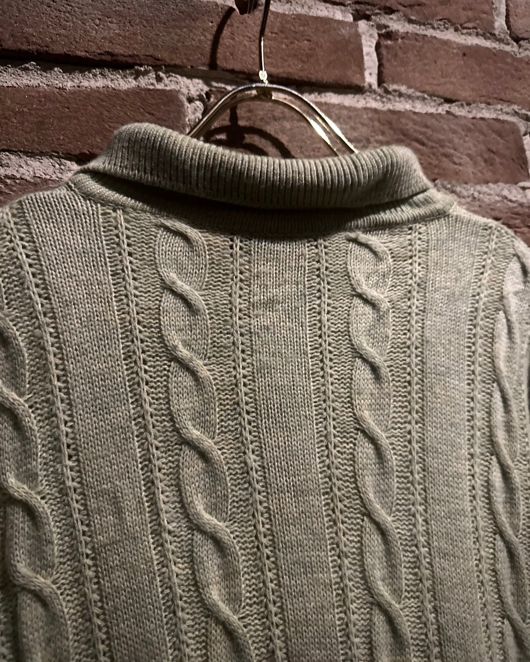 淡いセージ寄りのグリーンが上品で、光の当たり方で柔らかく表情を変える絶妙なトーン。ケーブル編みの立体的がシンプルながら存在感を漂わせています。