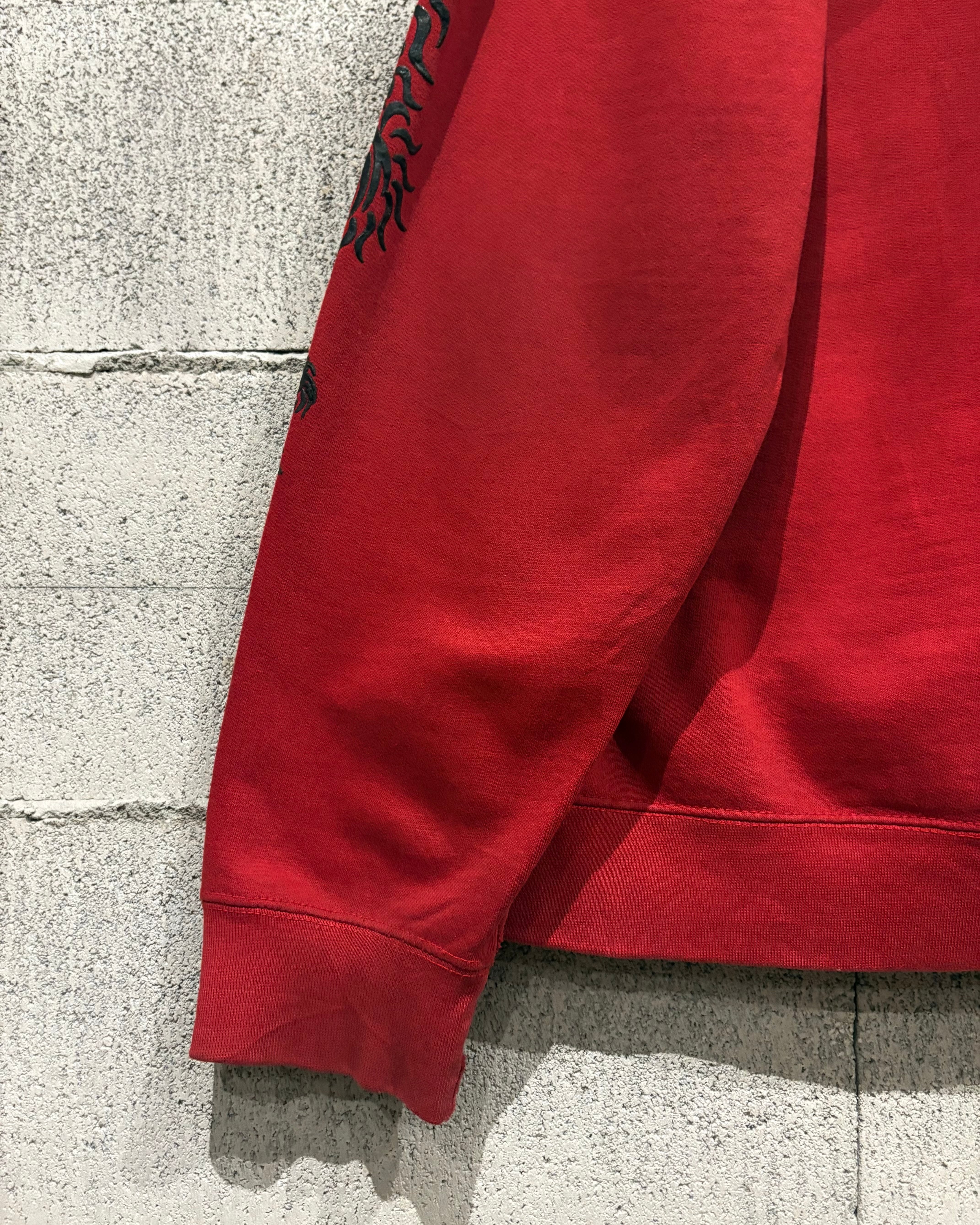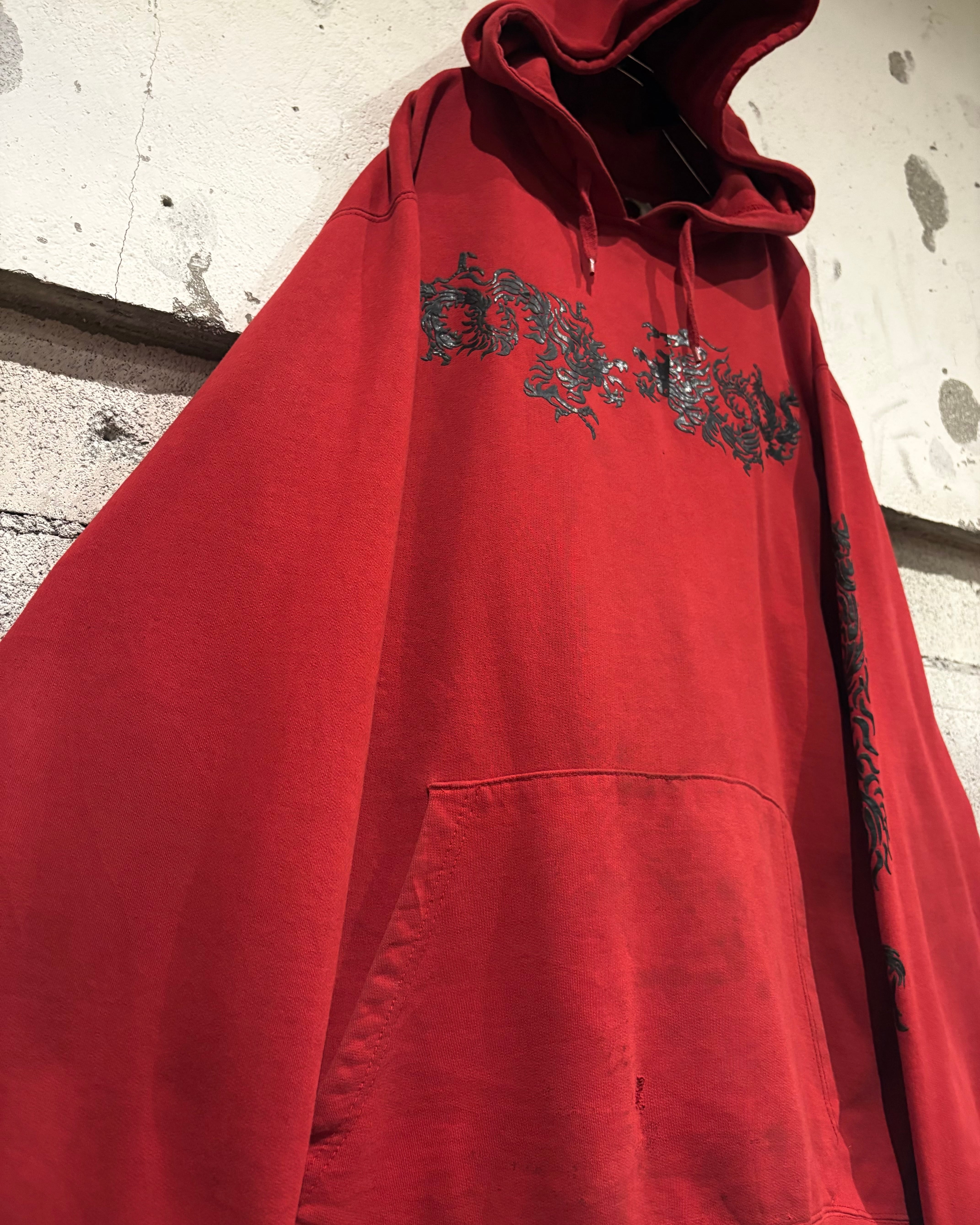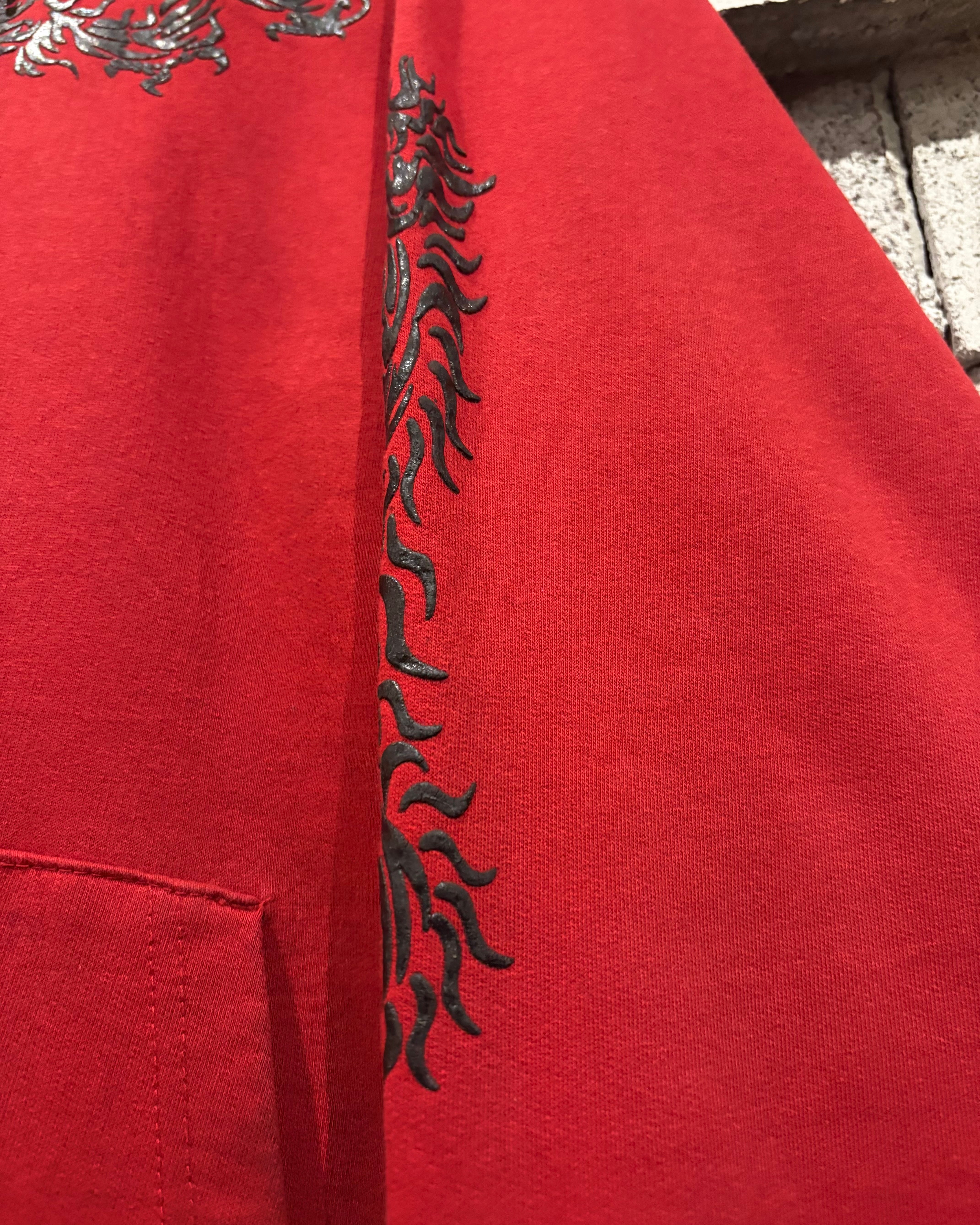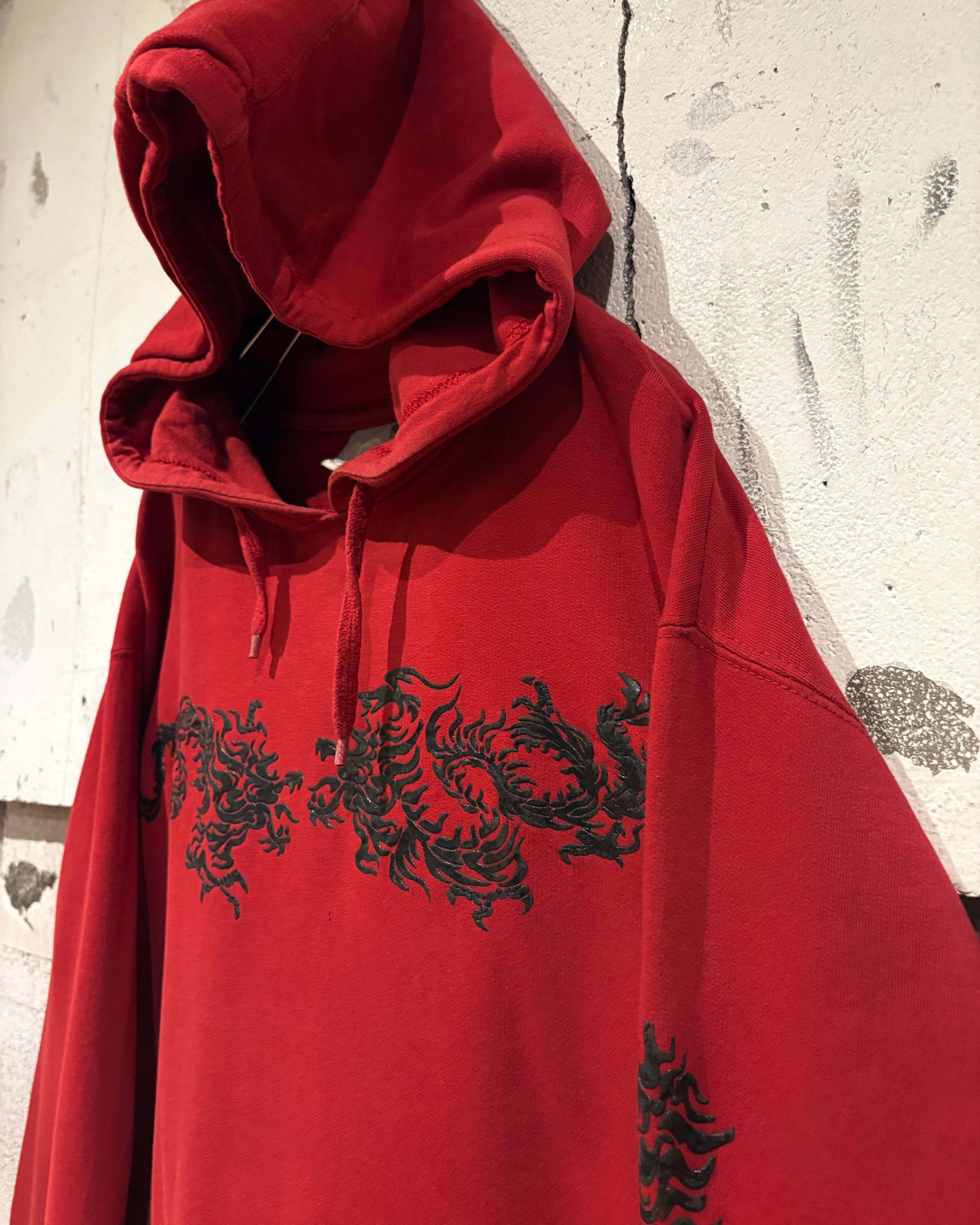 フロントと袖に“龍”モチーフの立体的なプリントを施した、真紅のプルオーバーフーディ。