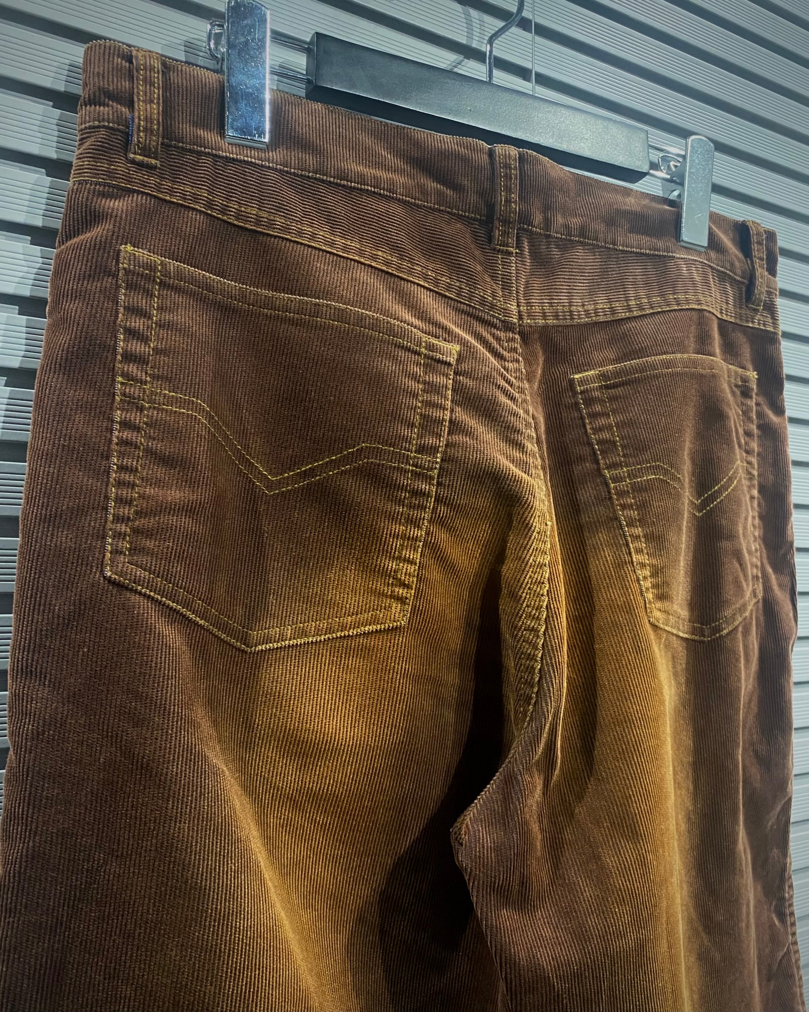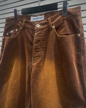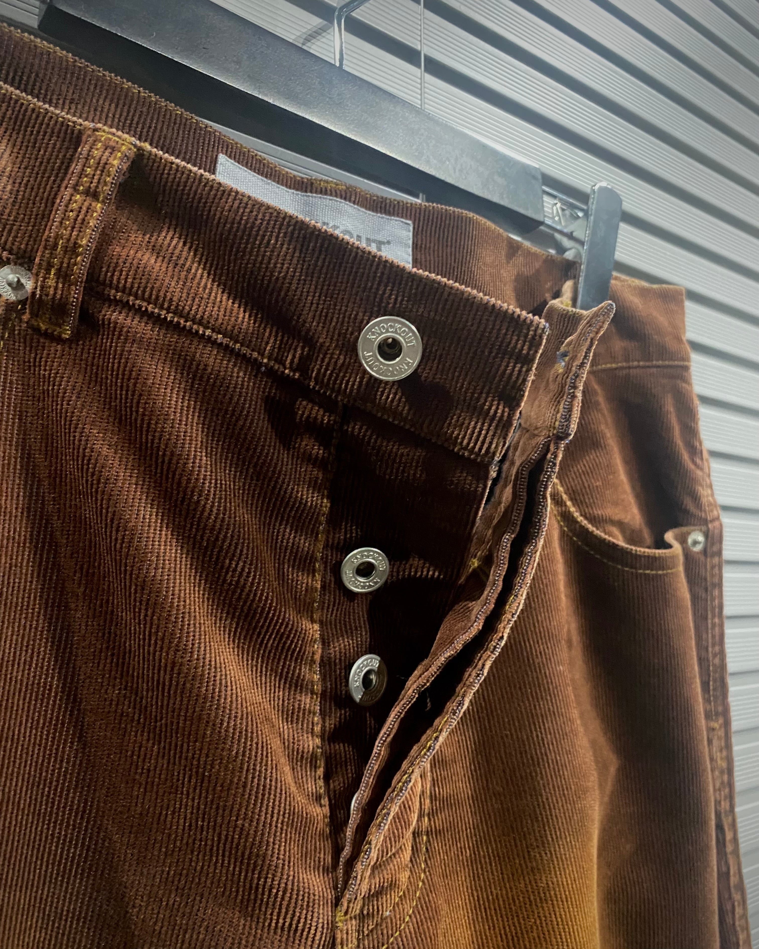 ブラウンの細畝コーデュロイに地のインディゴがほんのり覗き、程よいフェードが効いた表情深いワイドパンツ。