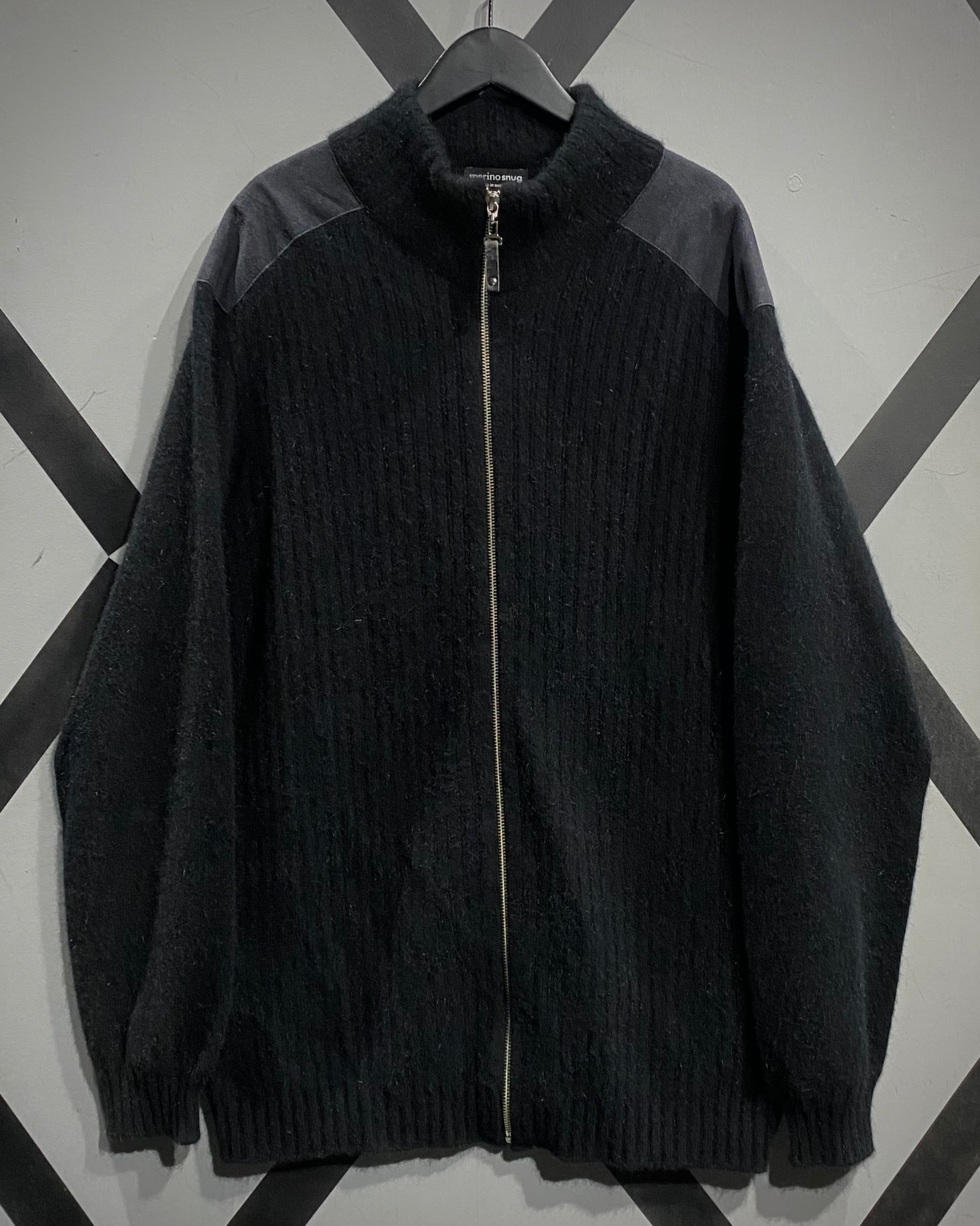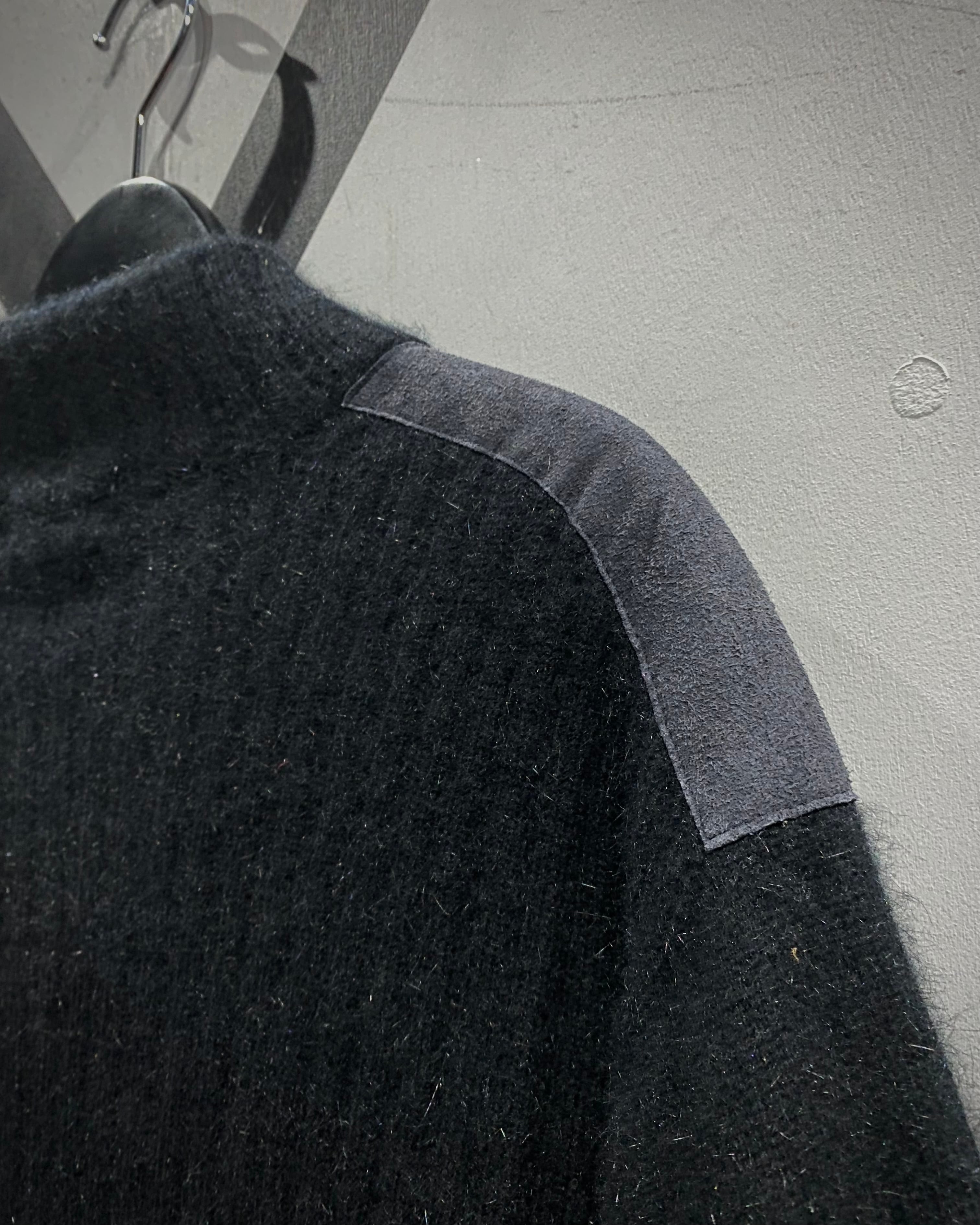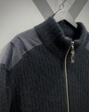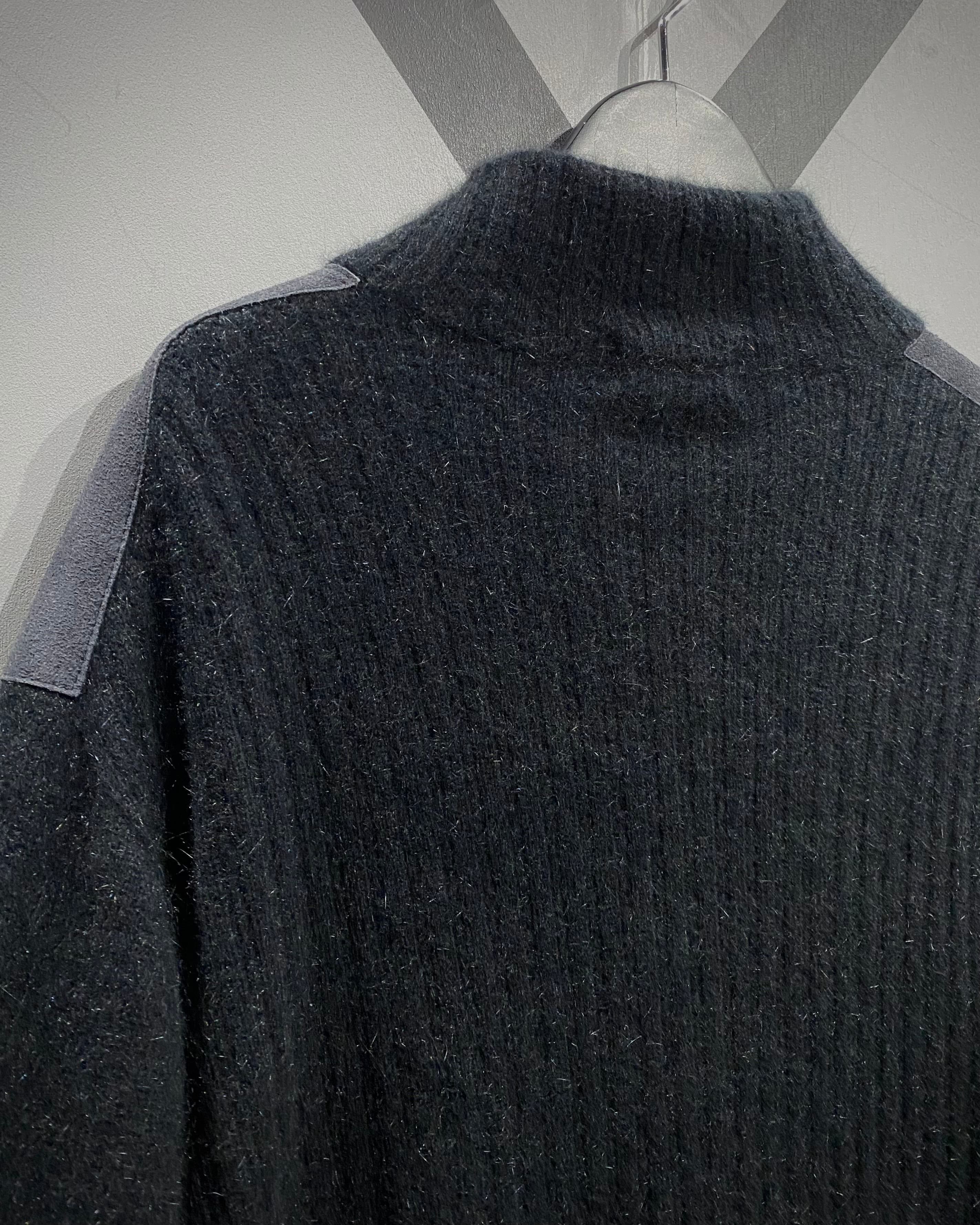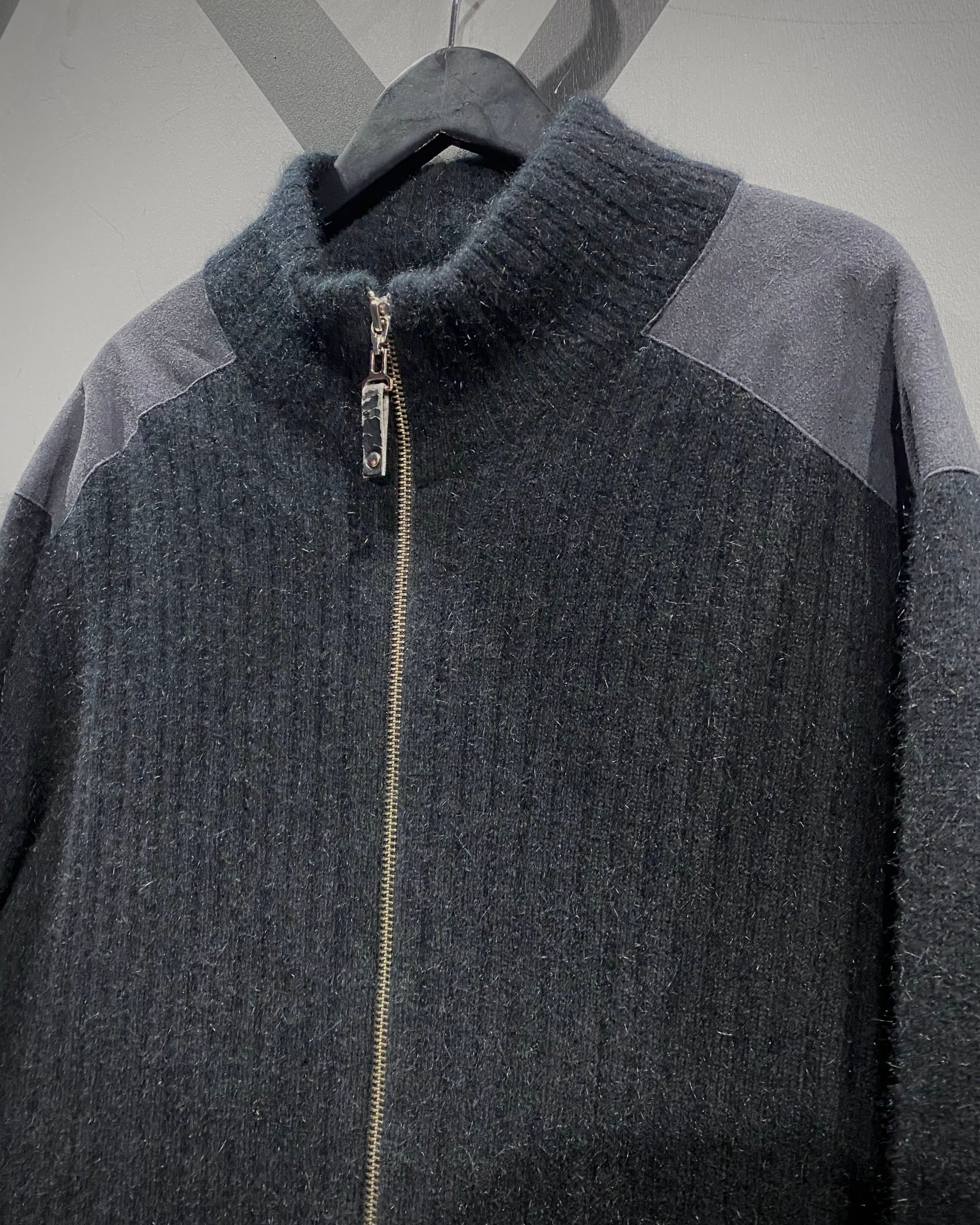 ショルダー部分にはフェイクスエードを切り替え。シンプルながら立体感を演出し、品の良いアクセントになっています。フルジップのドライバーズニットタイプで、スタンドネックにもなる仕様のため、冬場は首元までしっかりカバー。
