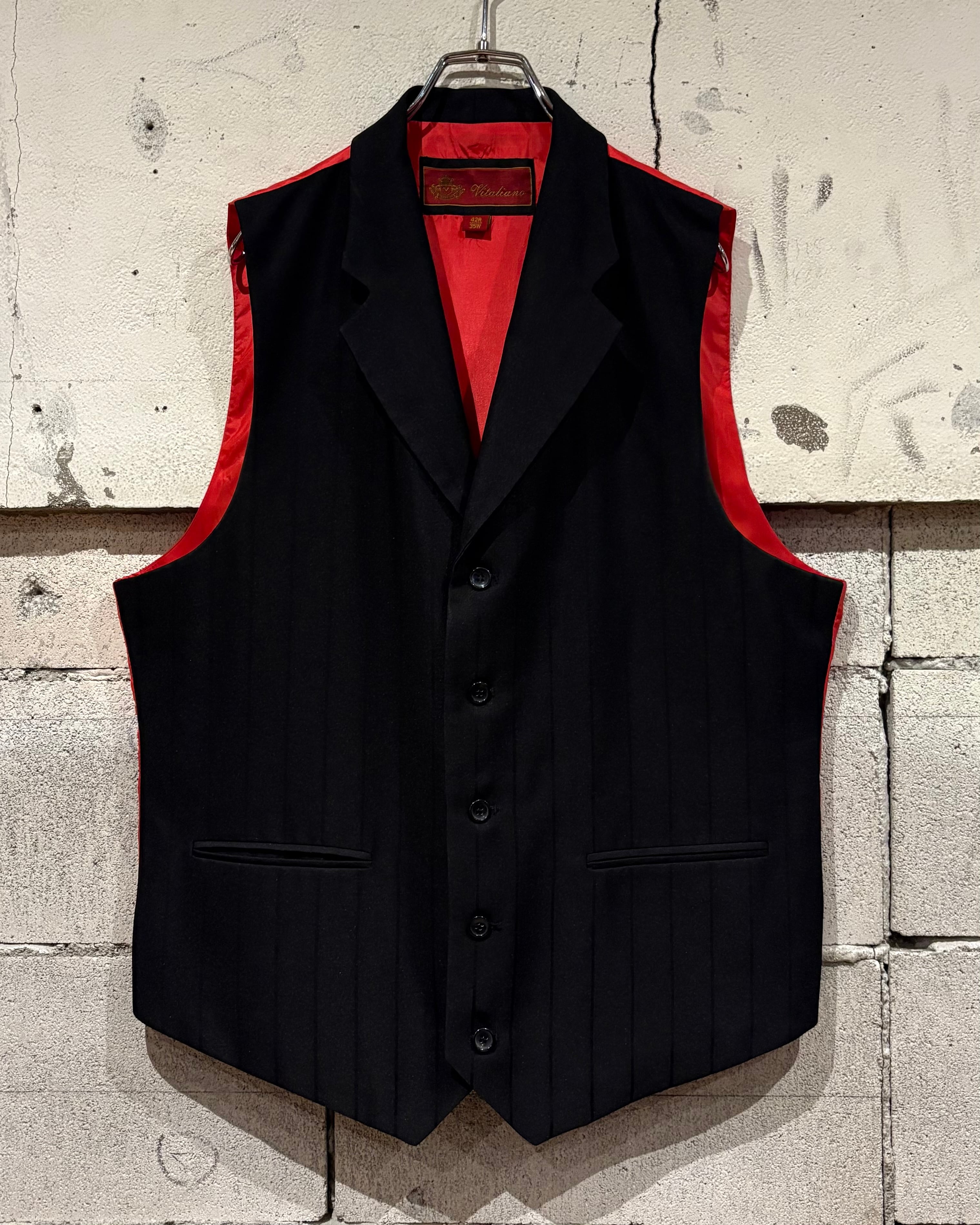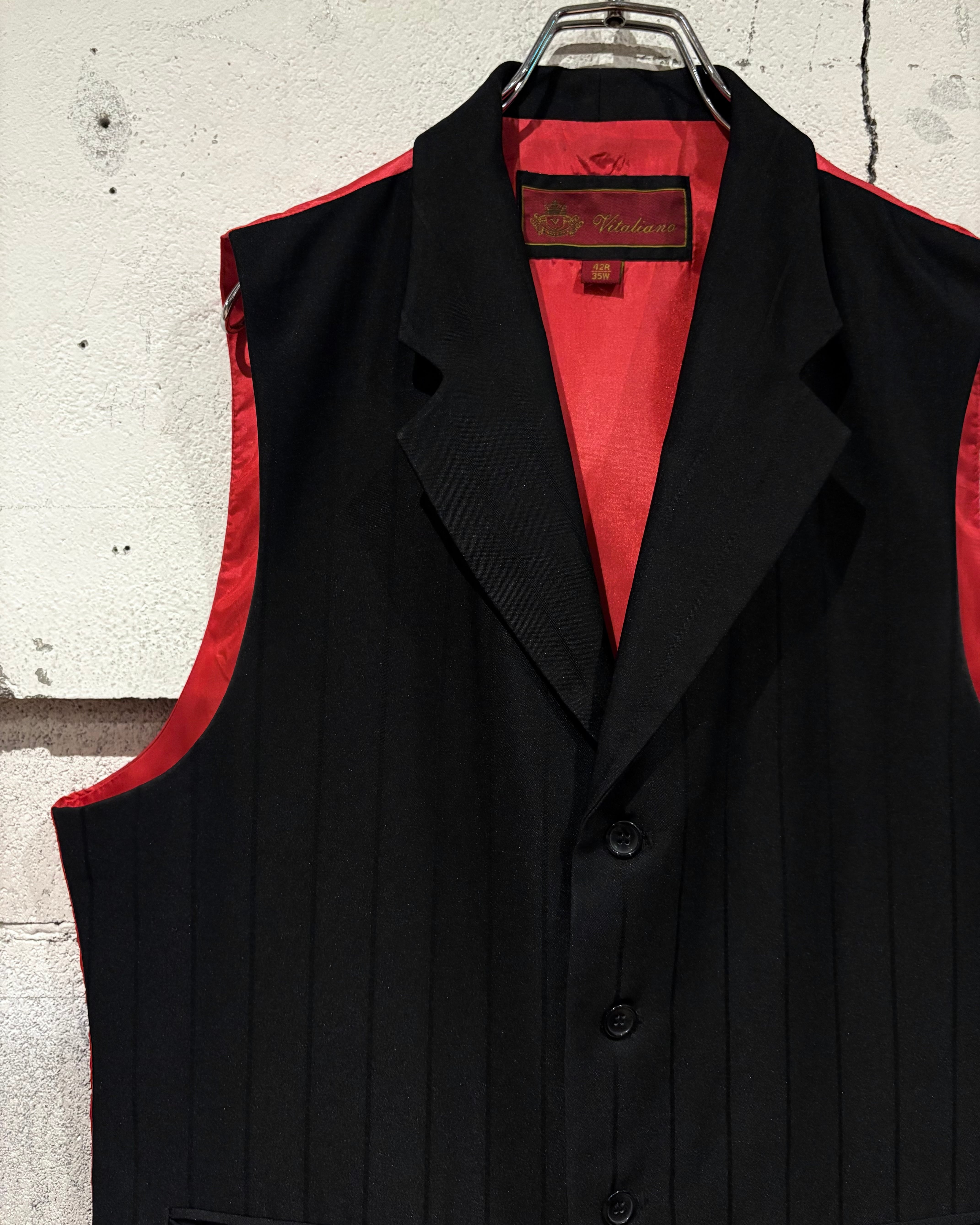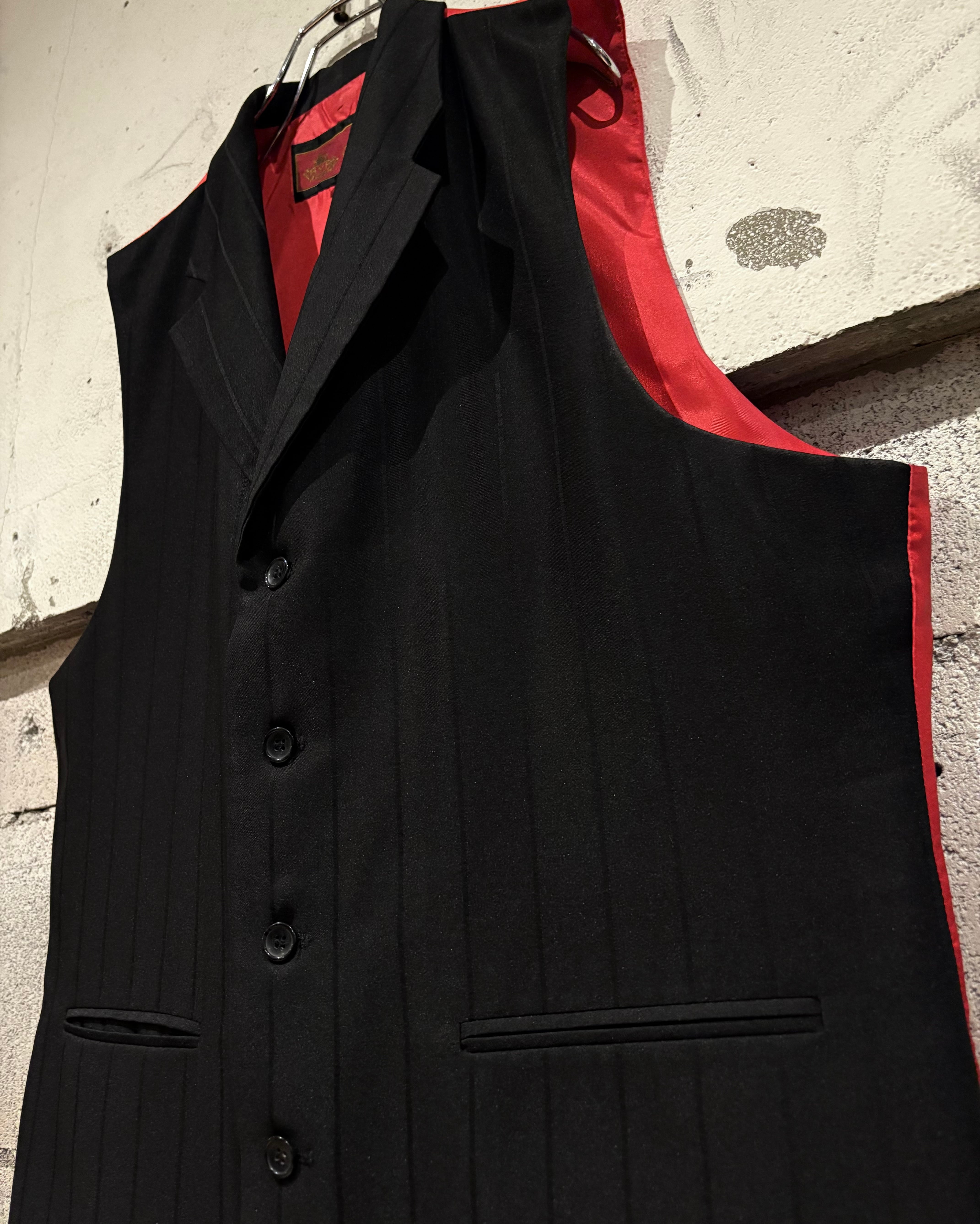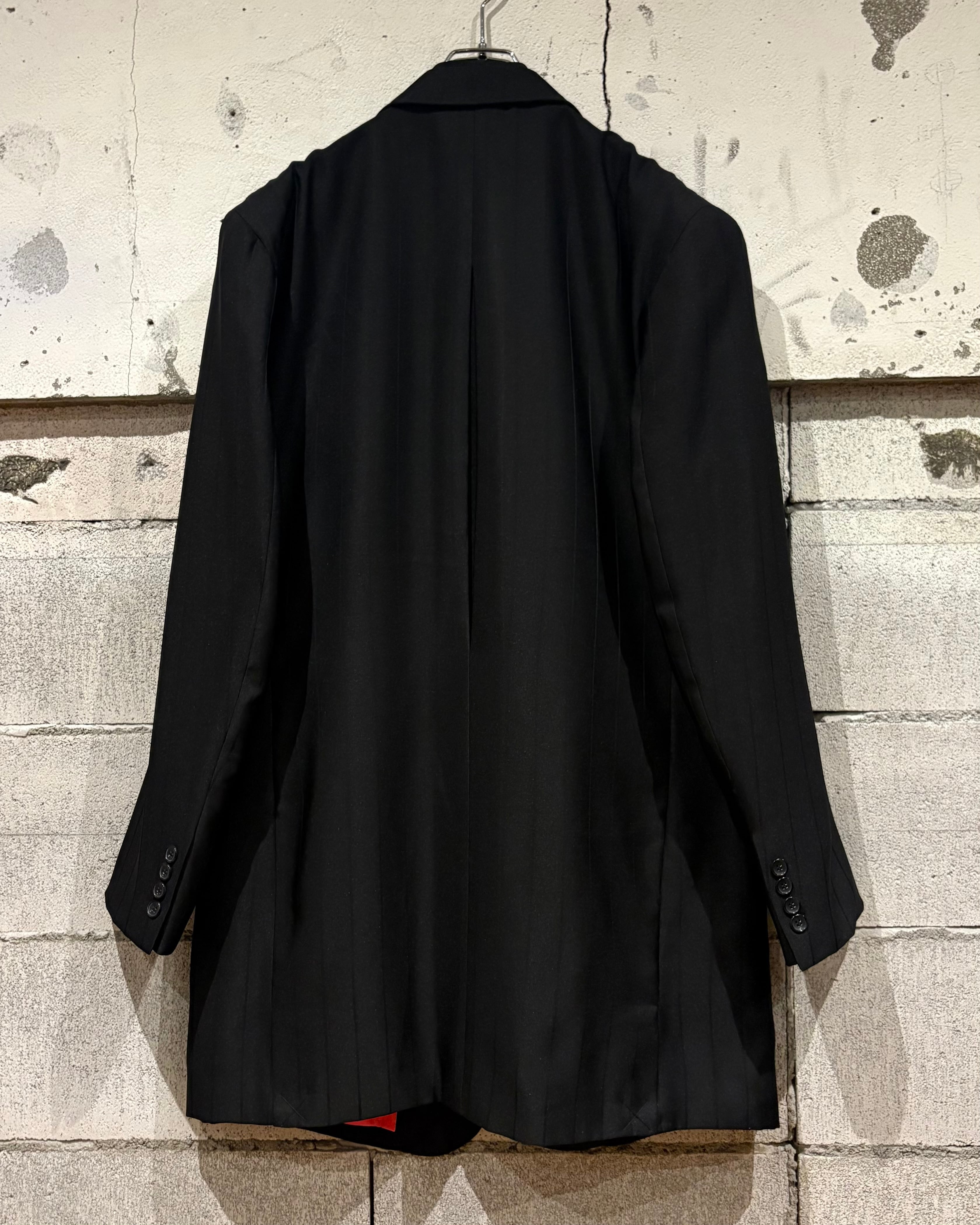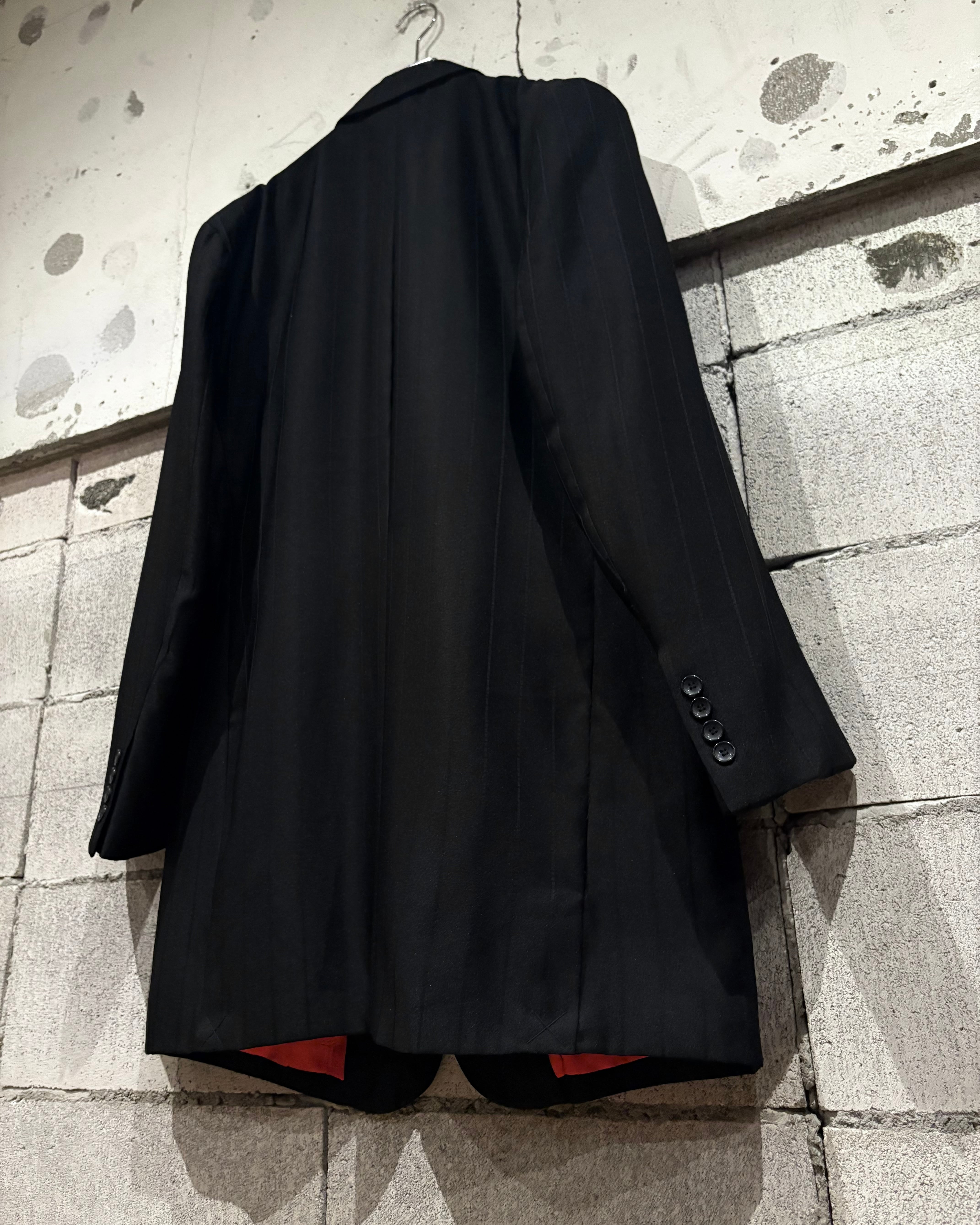 ブラックのボディをベース織りのストライプを載せた1着。ジャケットの身幅はかなりゆとりを持たせ、ガバッと羽織るだけインパクトある見映えに。真紅の裏地も洒落てます◎