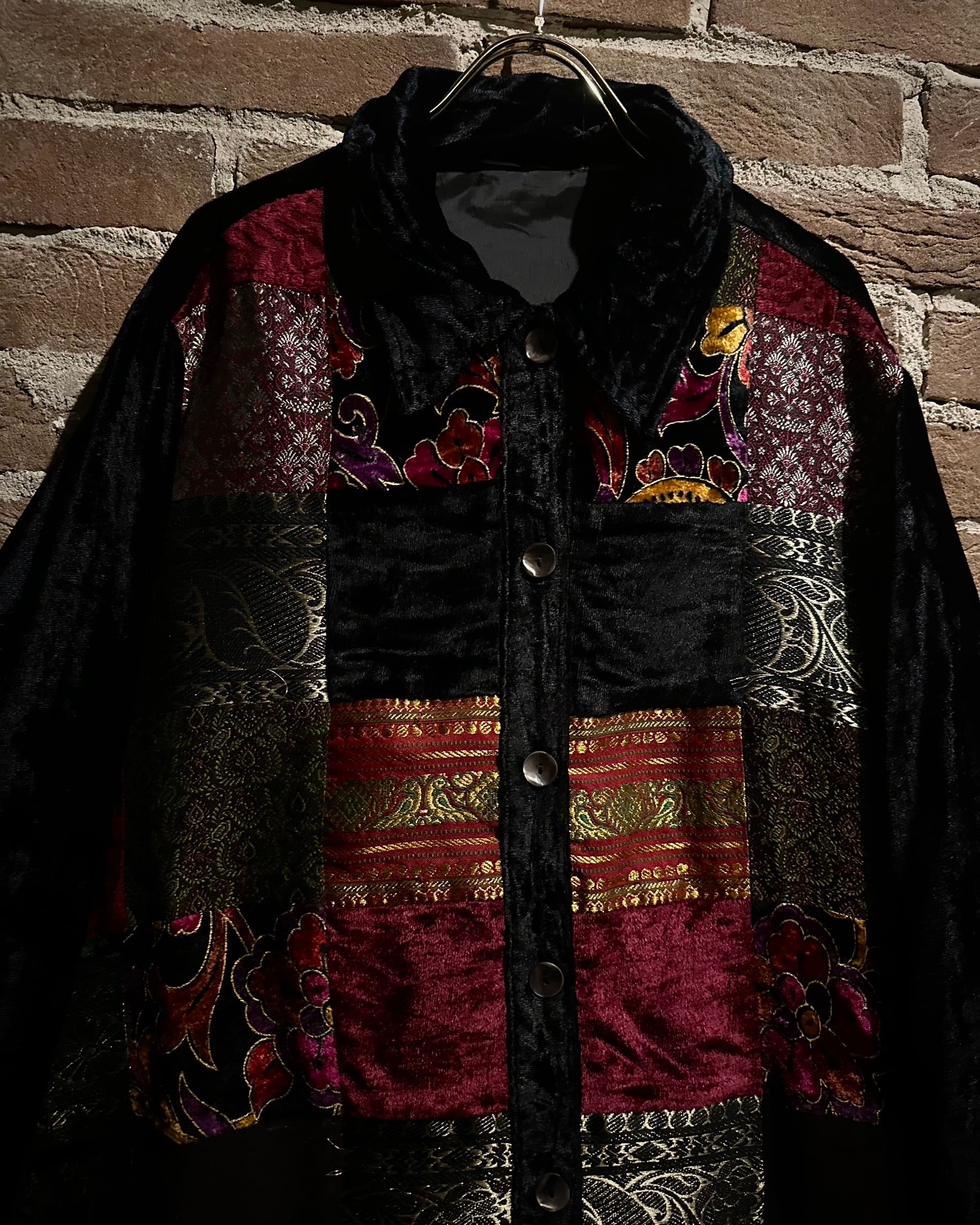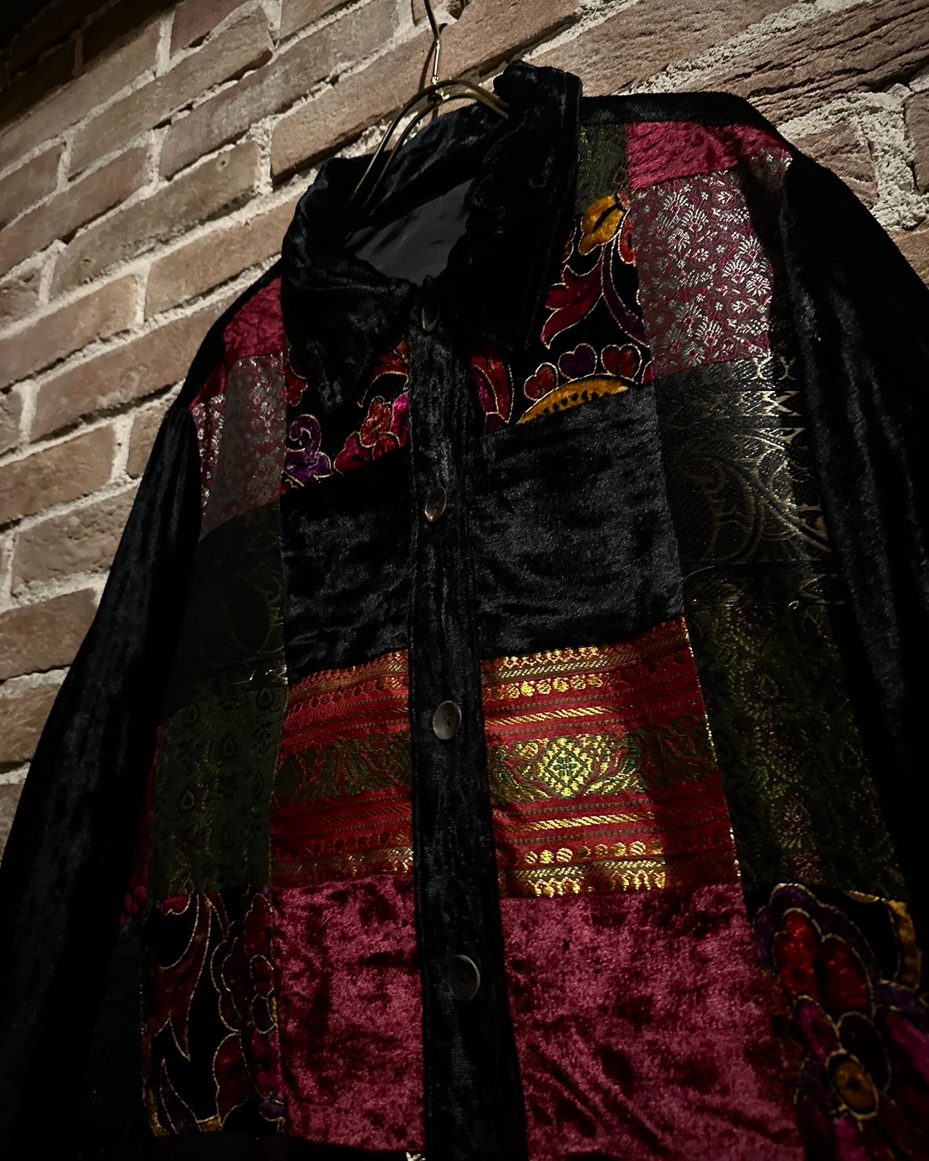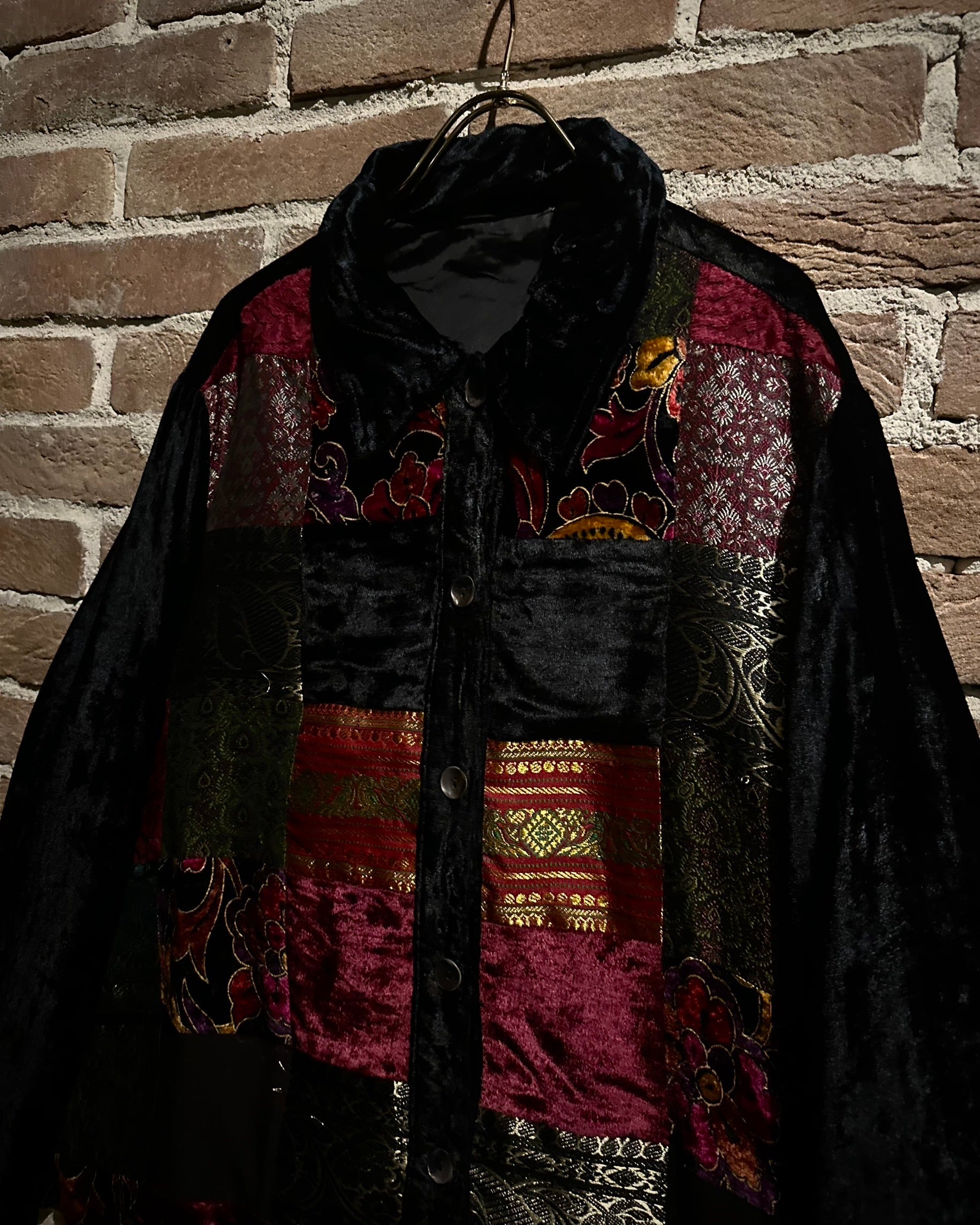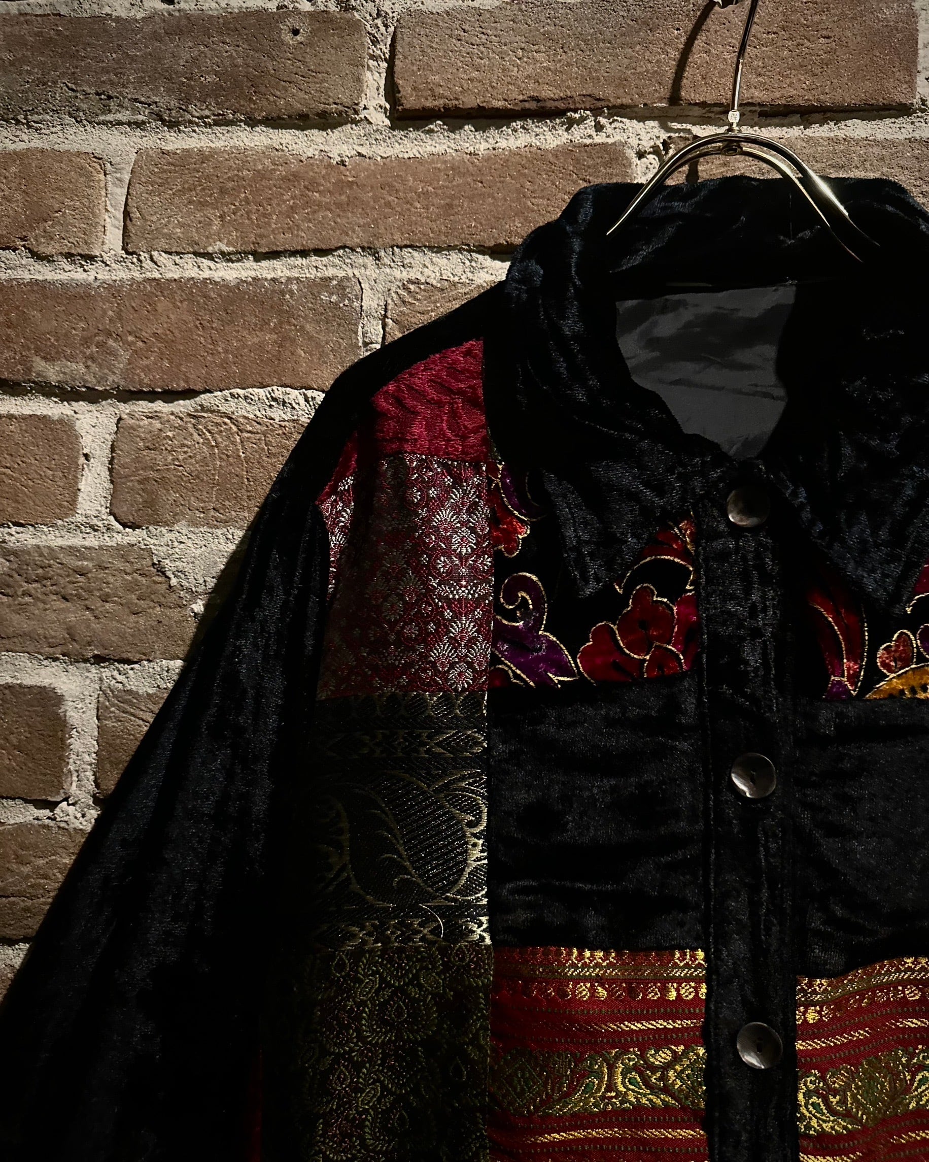 ベロア特有の深い光沢と滑らかな表情をベースに、フロントへ大胆にパッチワークを切り替えたジャケット。