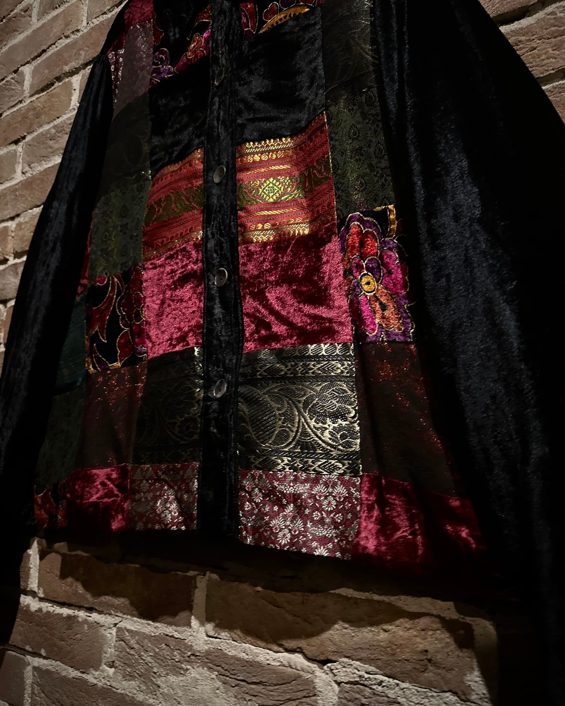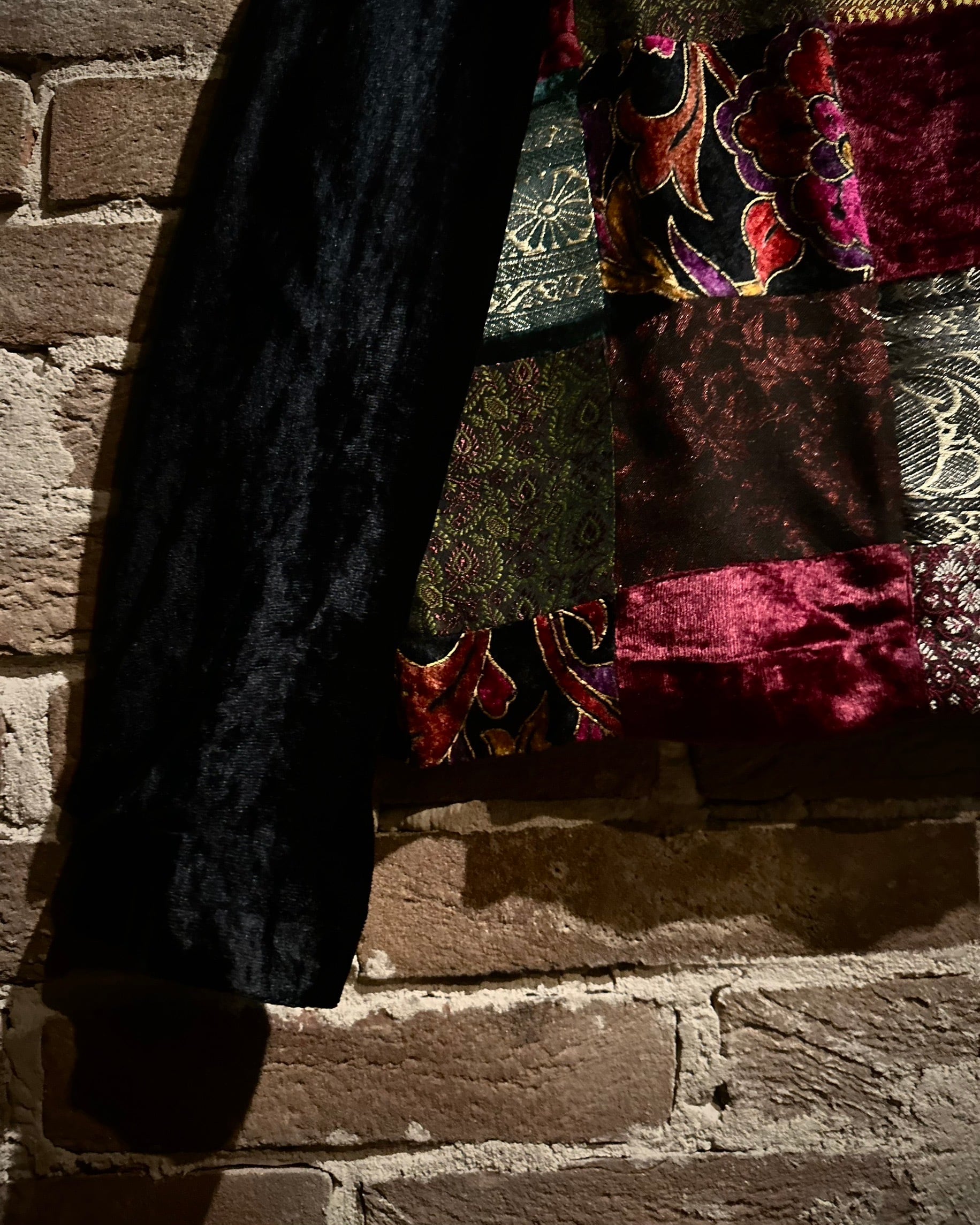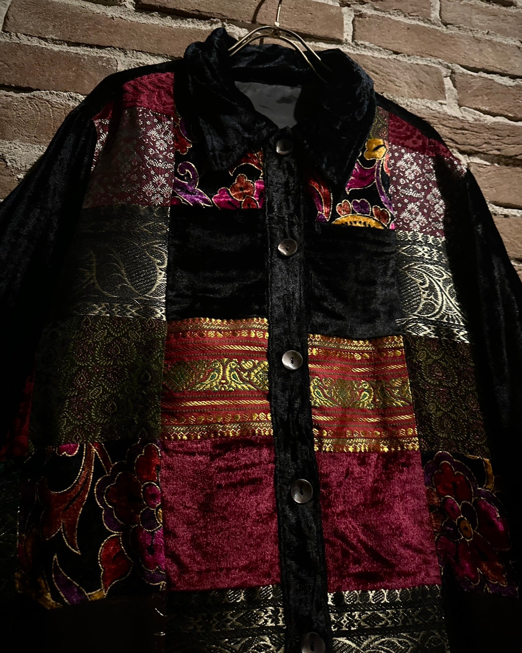 ベロア特有の深い光沢と滑らかな表情をベースに、フロントへ大胆にパッチワークを切り替えたジャケット。