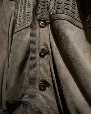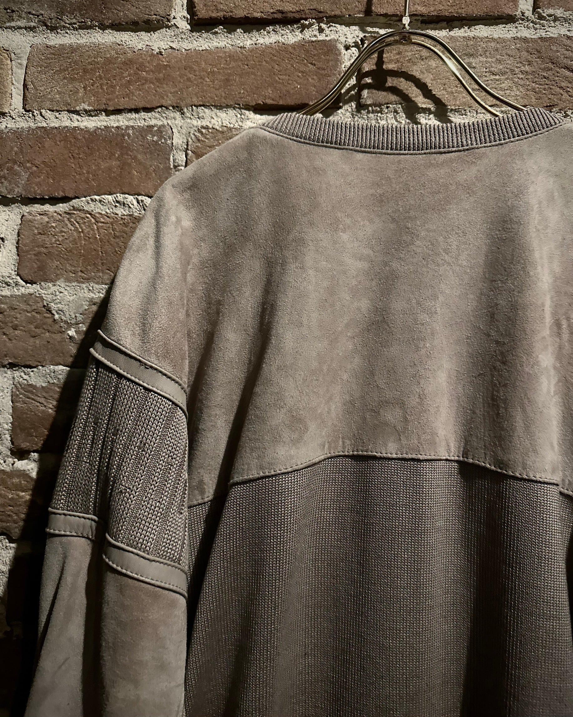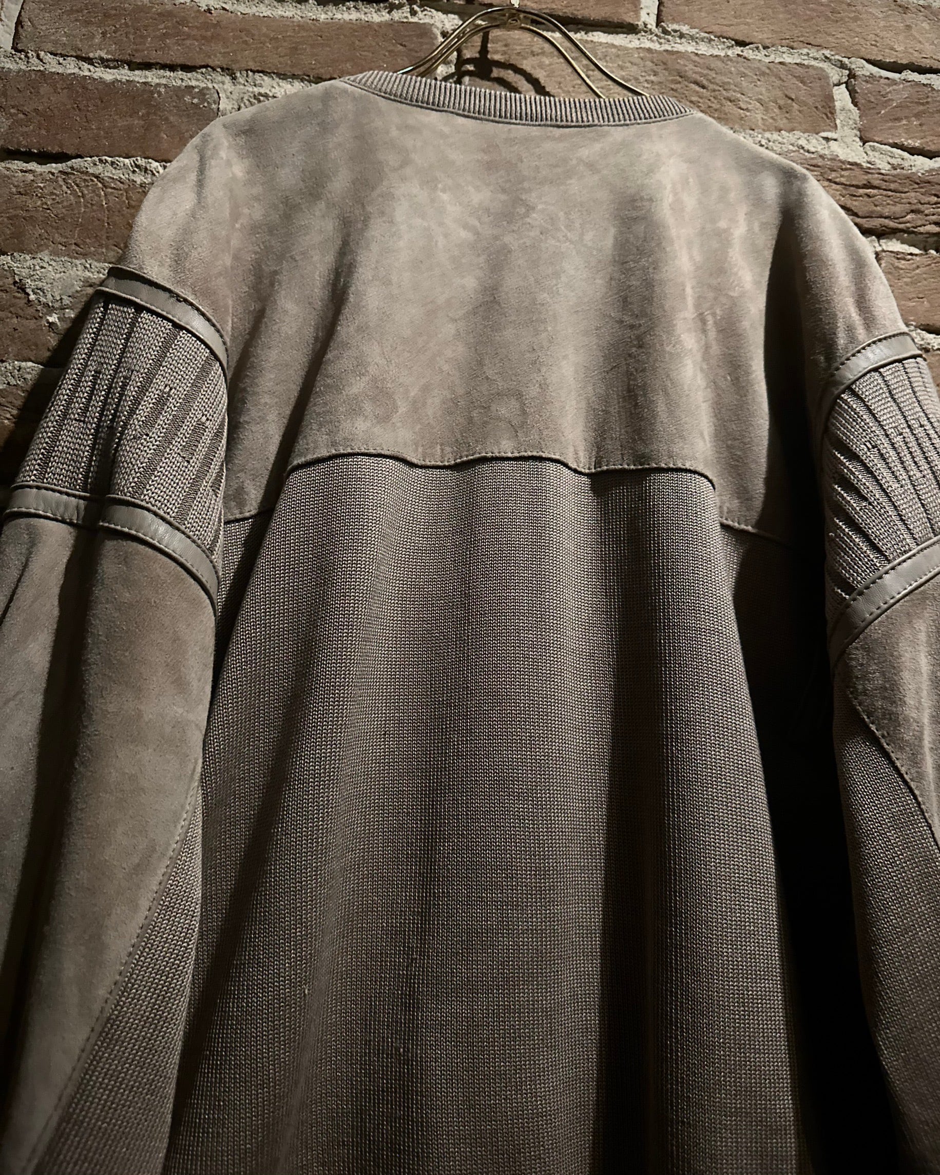 ボディは柔らかく肉厚なニット。その上にフロント全面でスエードレザーとスムースレザーを掛け合わせたデザインを切り替え、しっとりとした質感のスエードと滑らかなスムースのコントラストが圧倒的な存在感を放ちます。