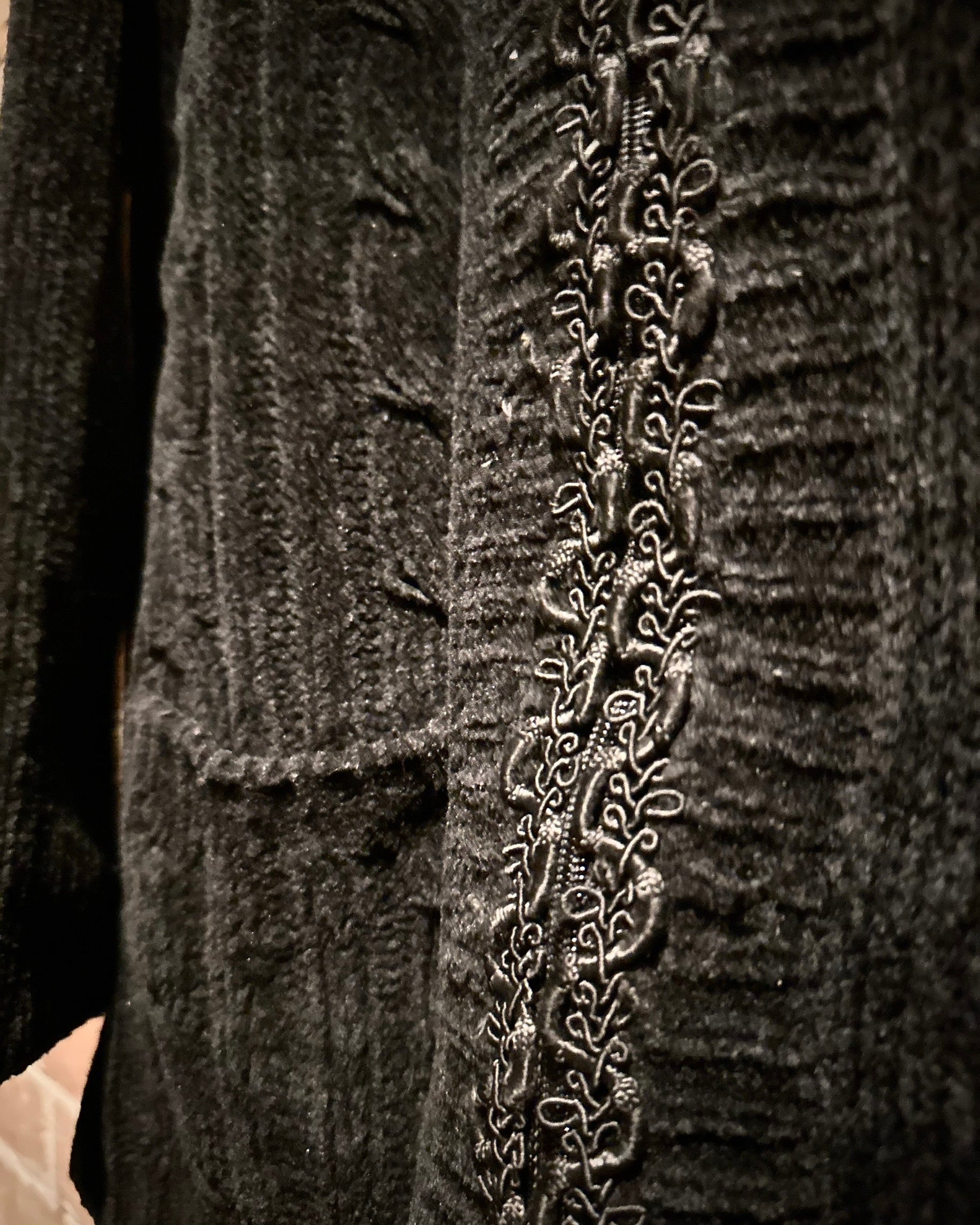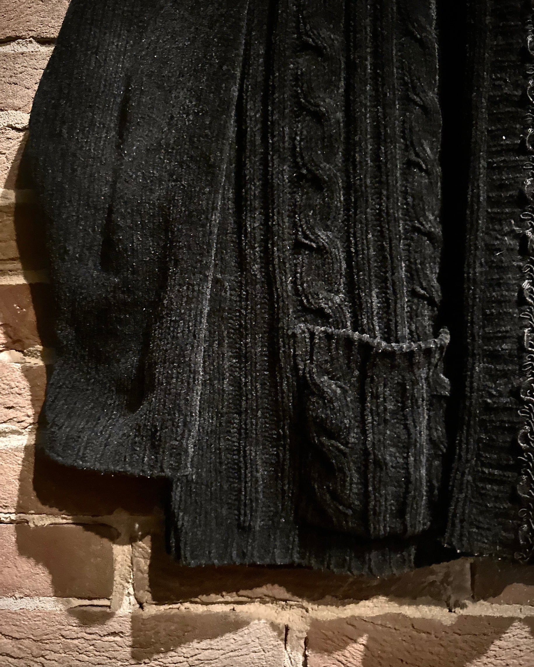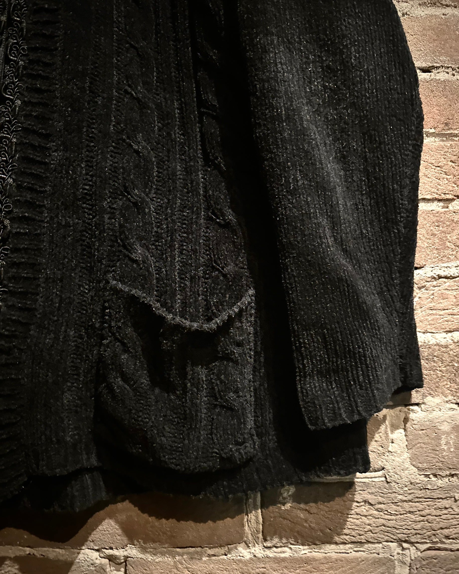 しっとりとした手触りもほんのり起毛した表情が生む包まれるような暖かさ、オールブラックながら立体感のある表情に心惹かれます。