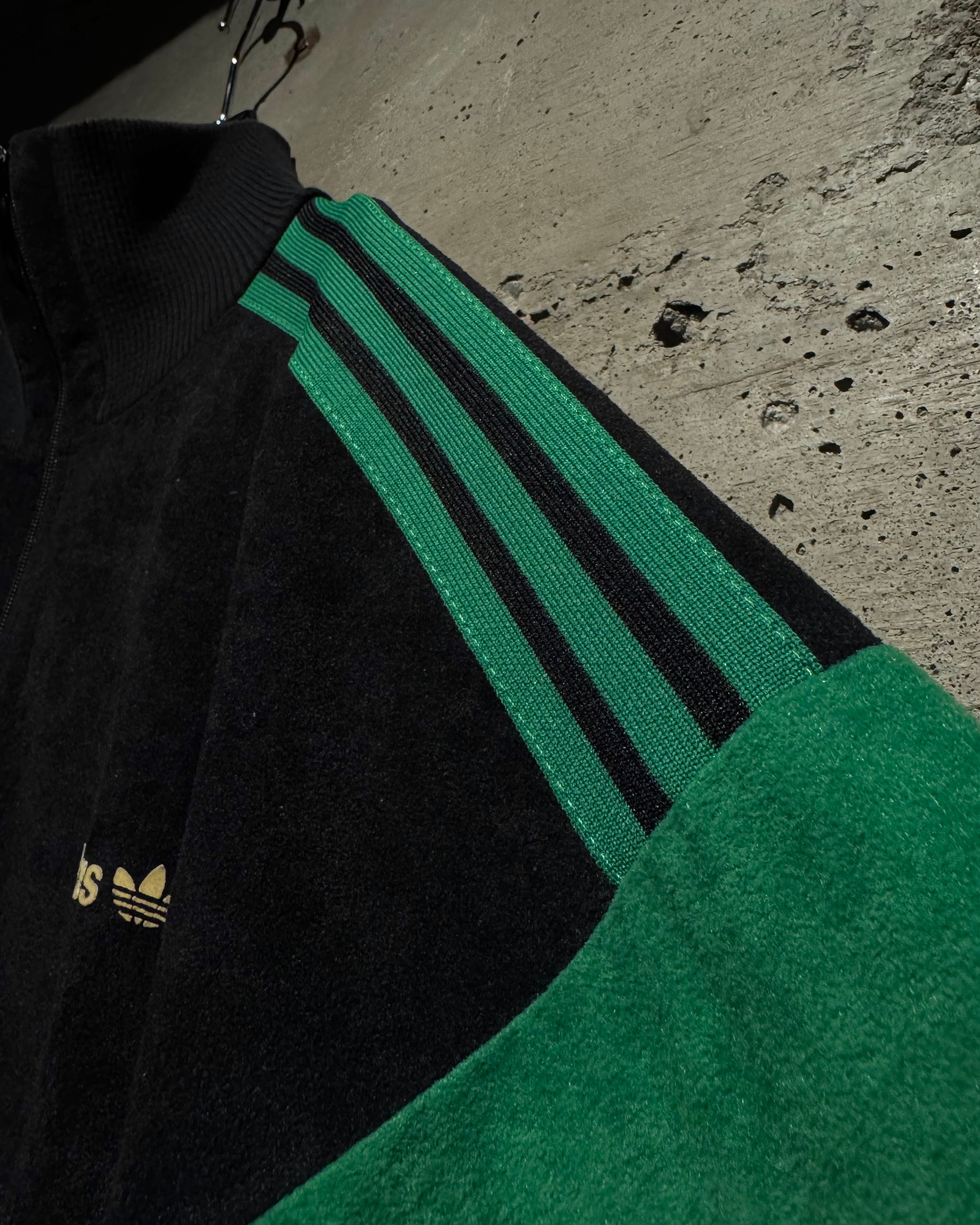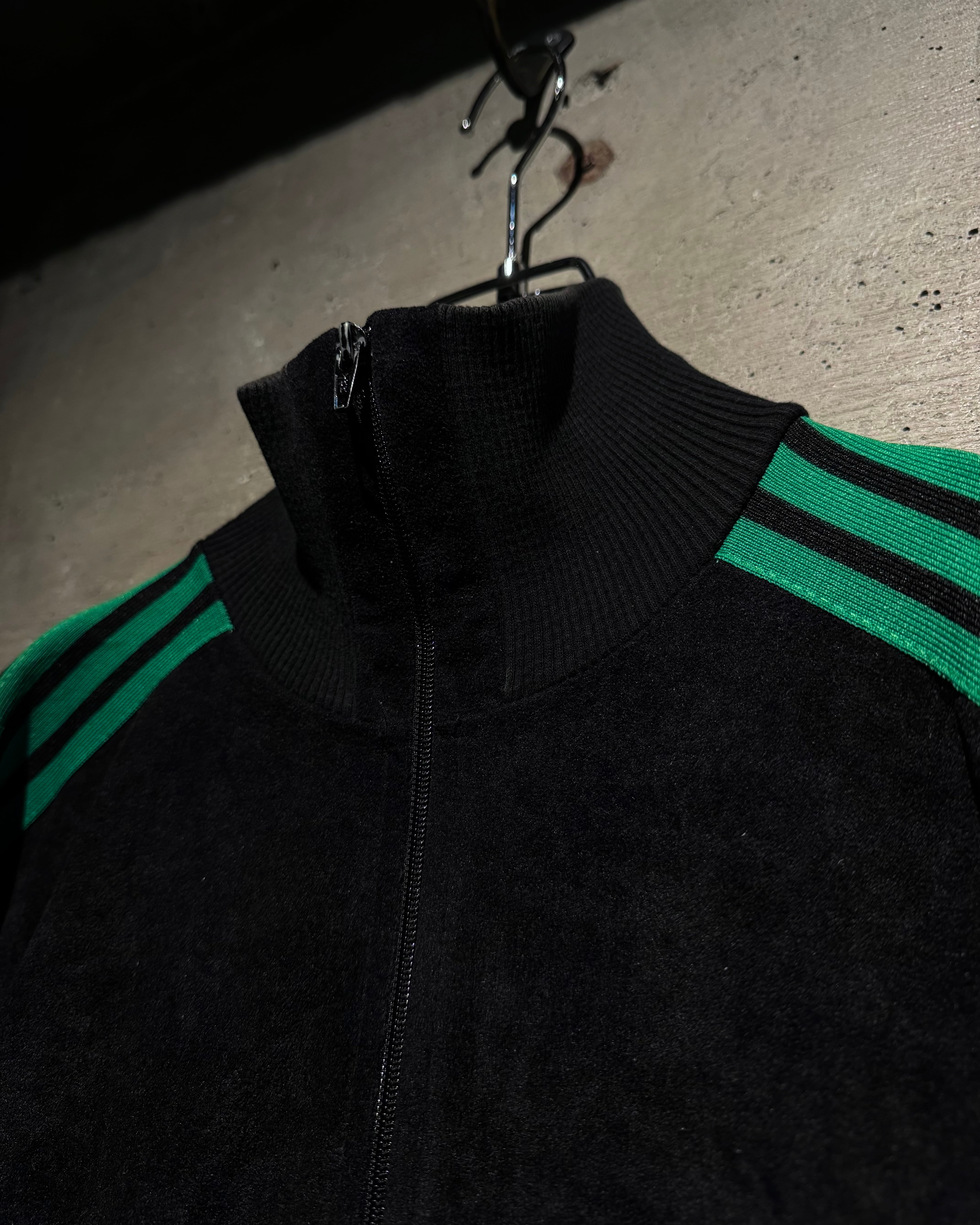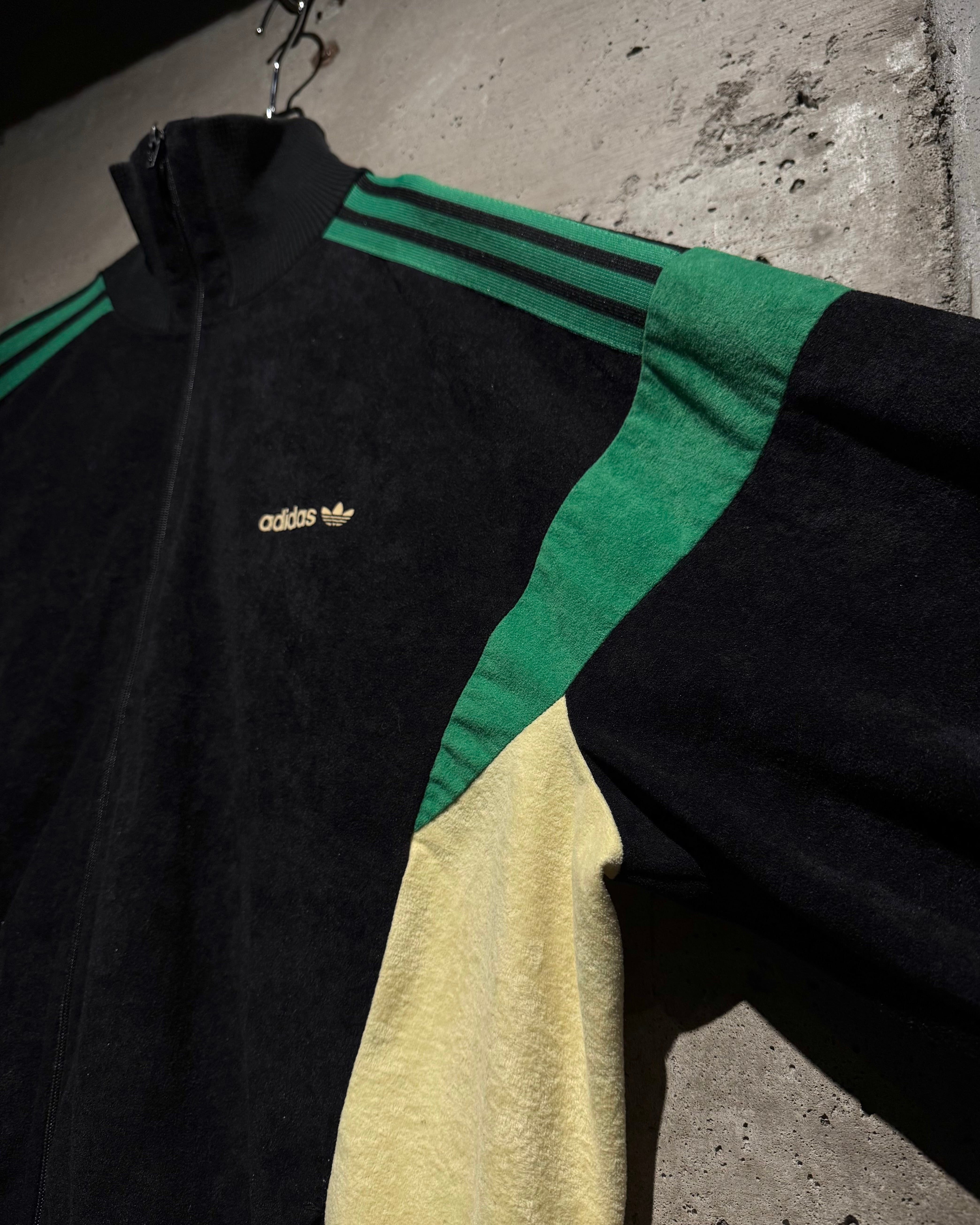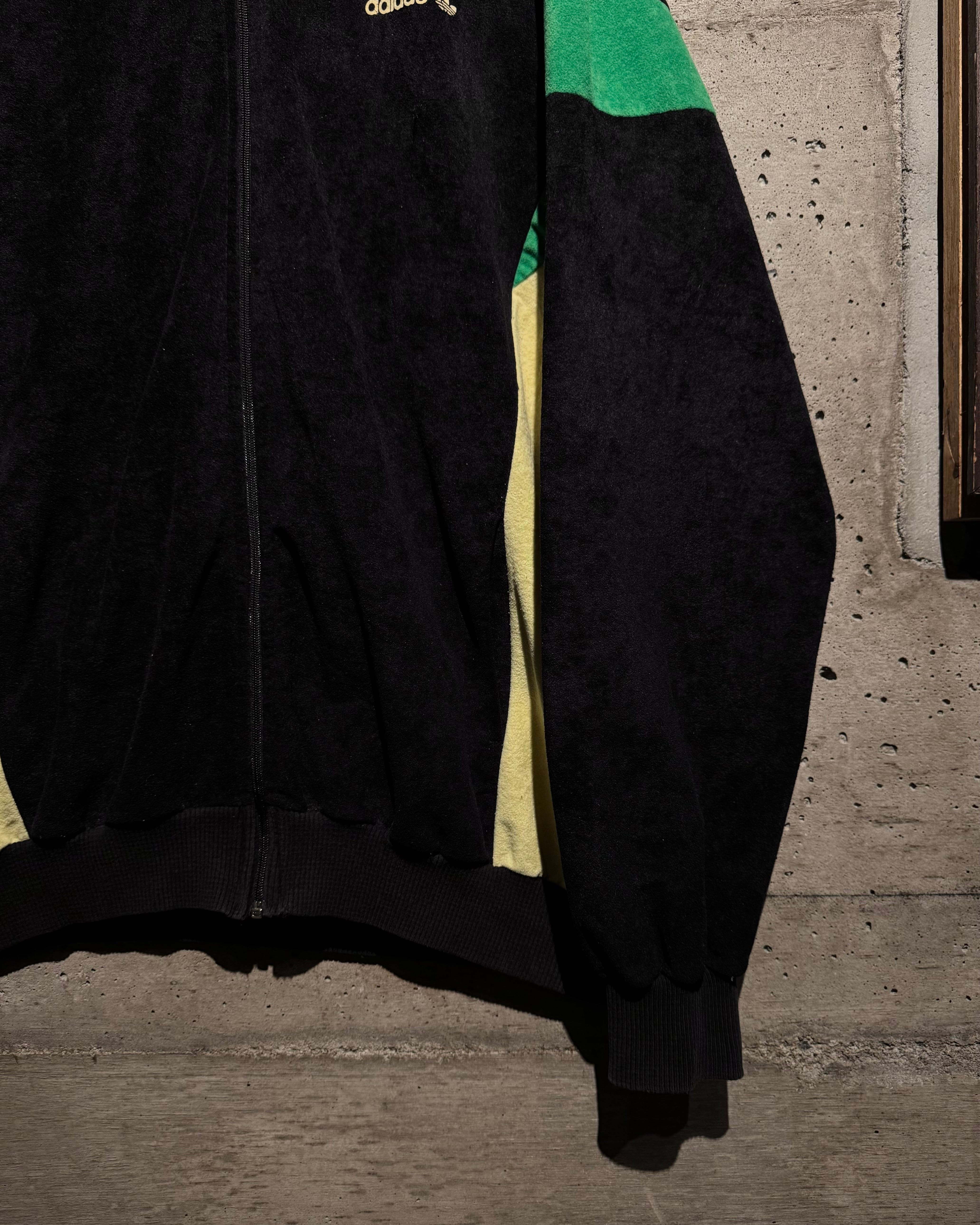 ブラック、鮮やかなグリーン、黄色の配色に、切替でエッジを効かせたデザインバランスが素晴らしい逸品。いわゆるジャージ素材では無く、"ベロア調"の素材を用いた稀少モデルです。