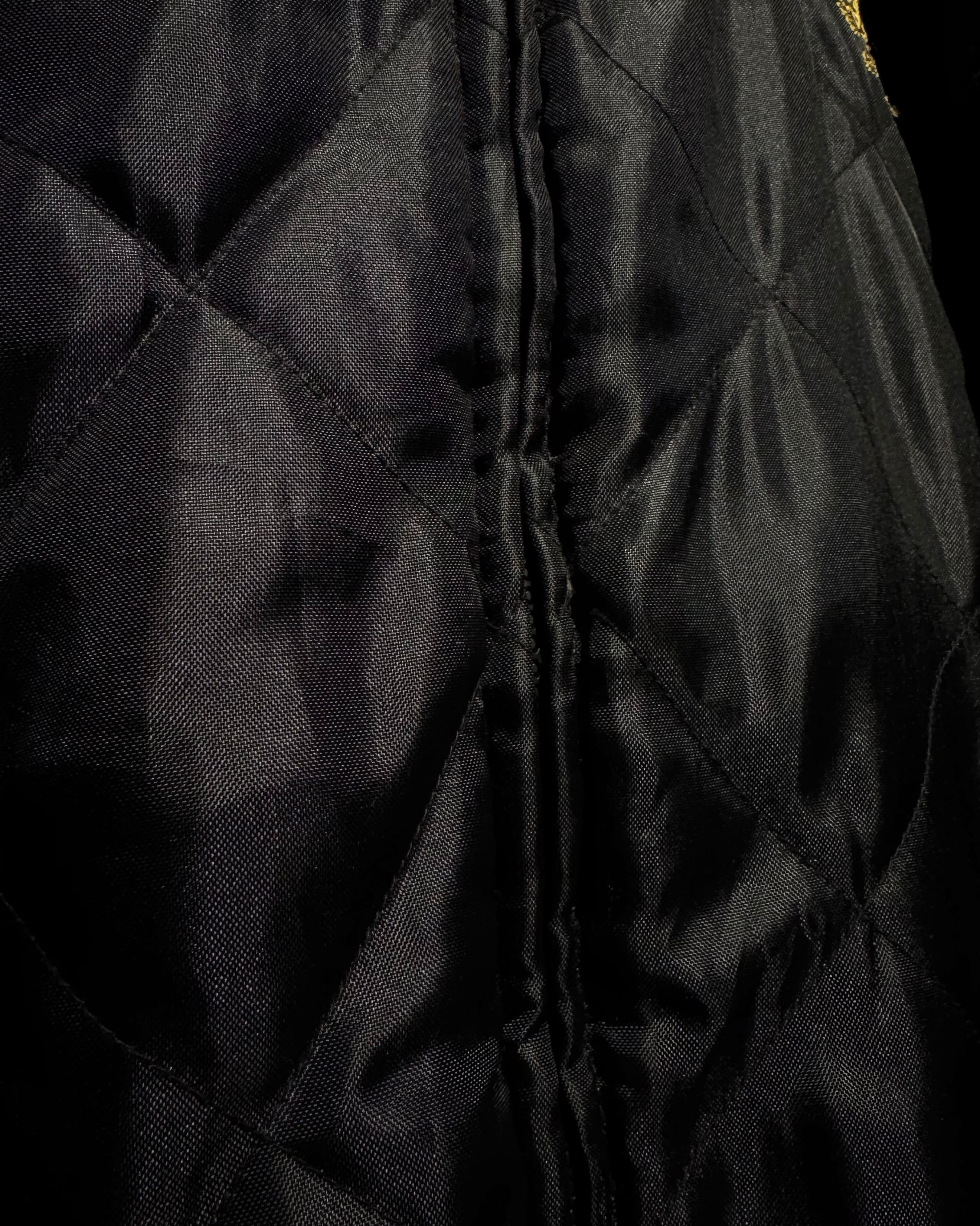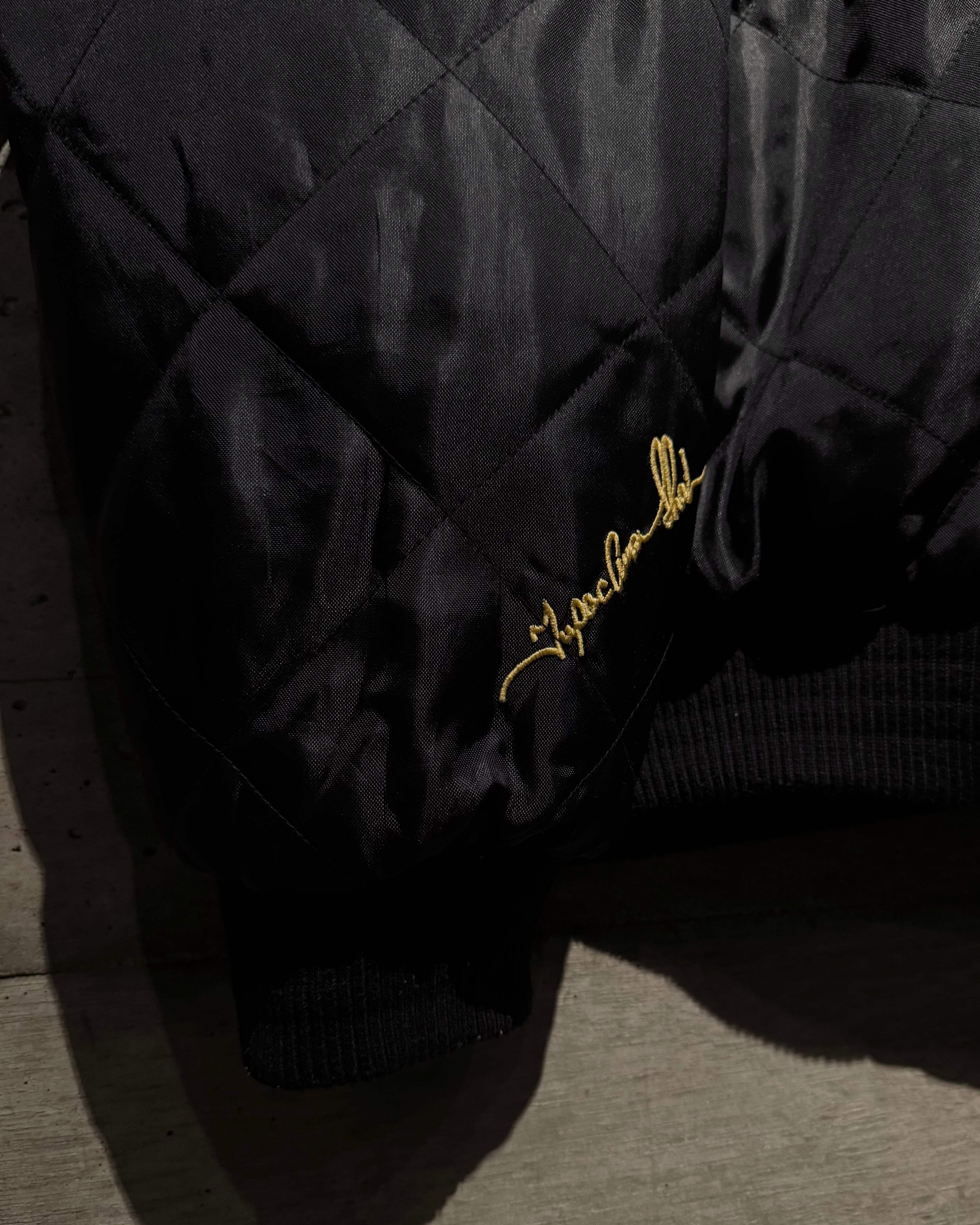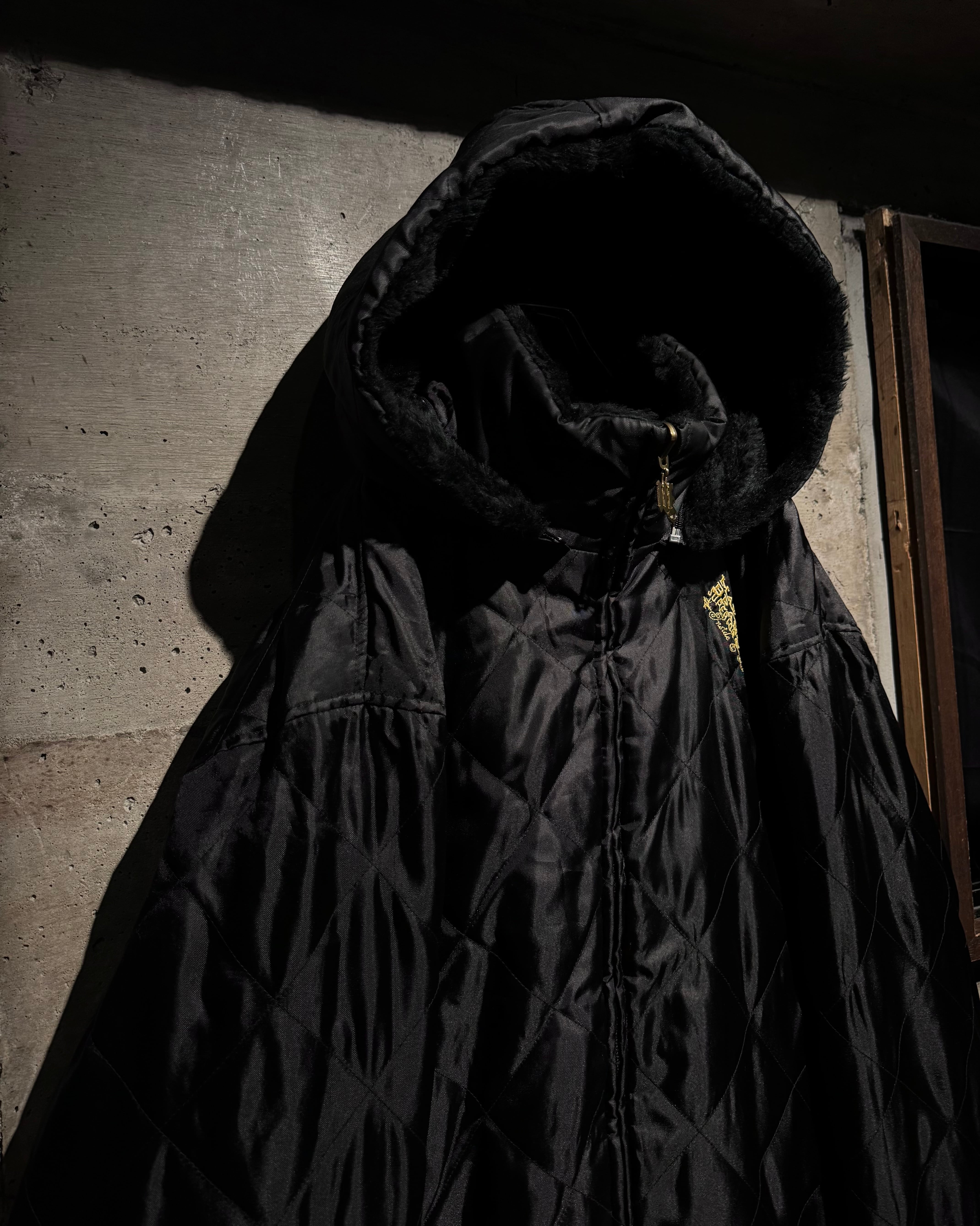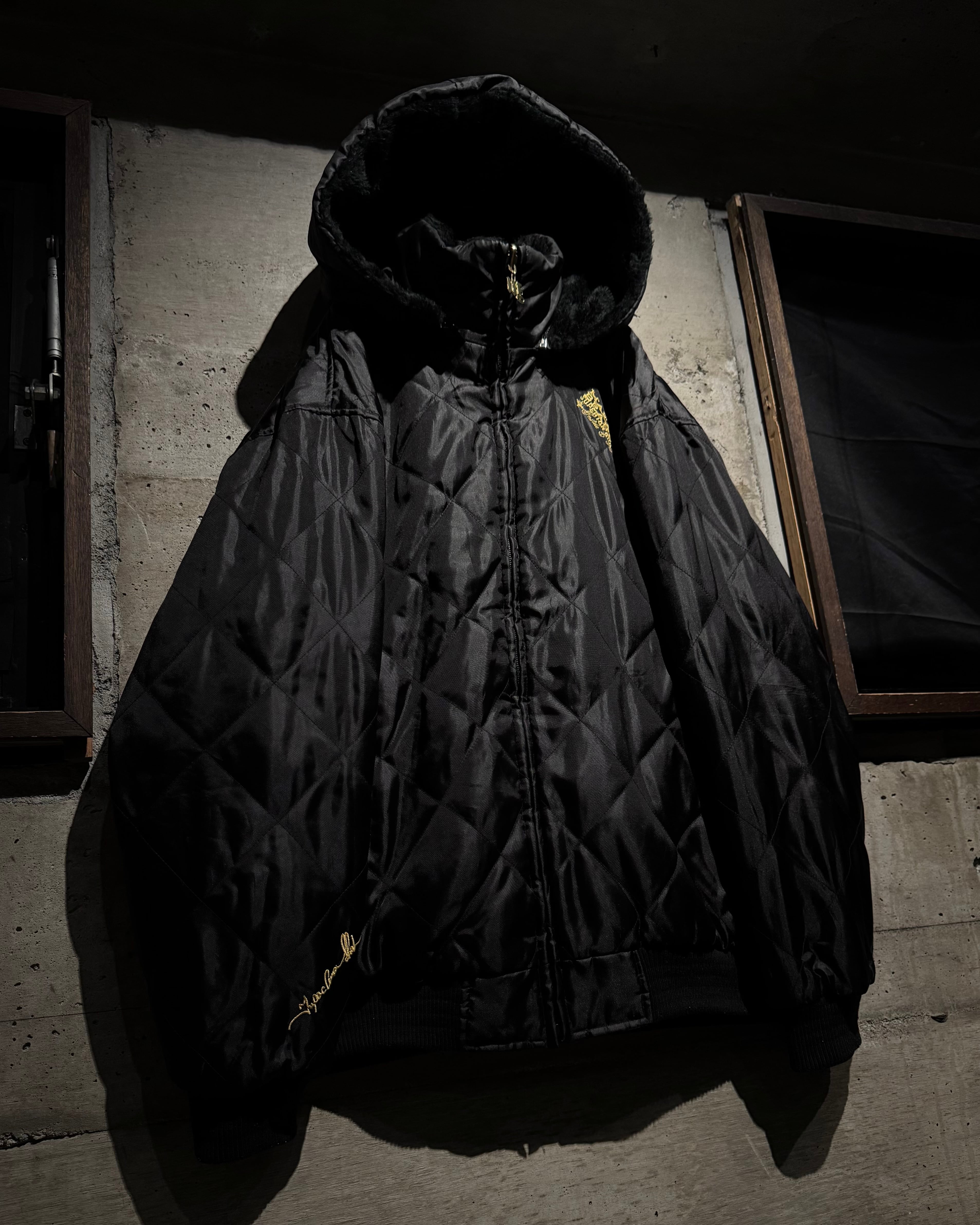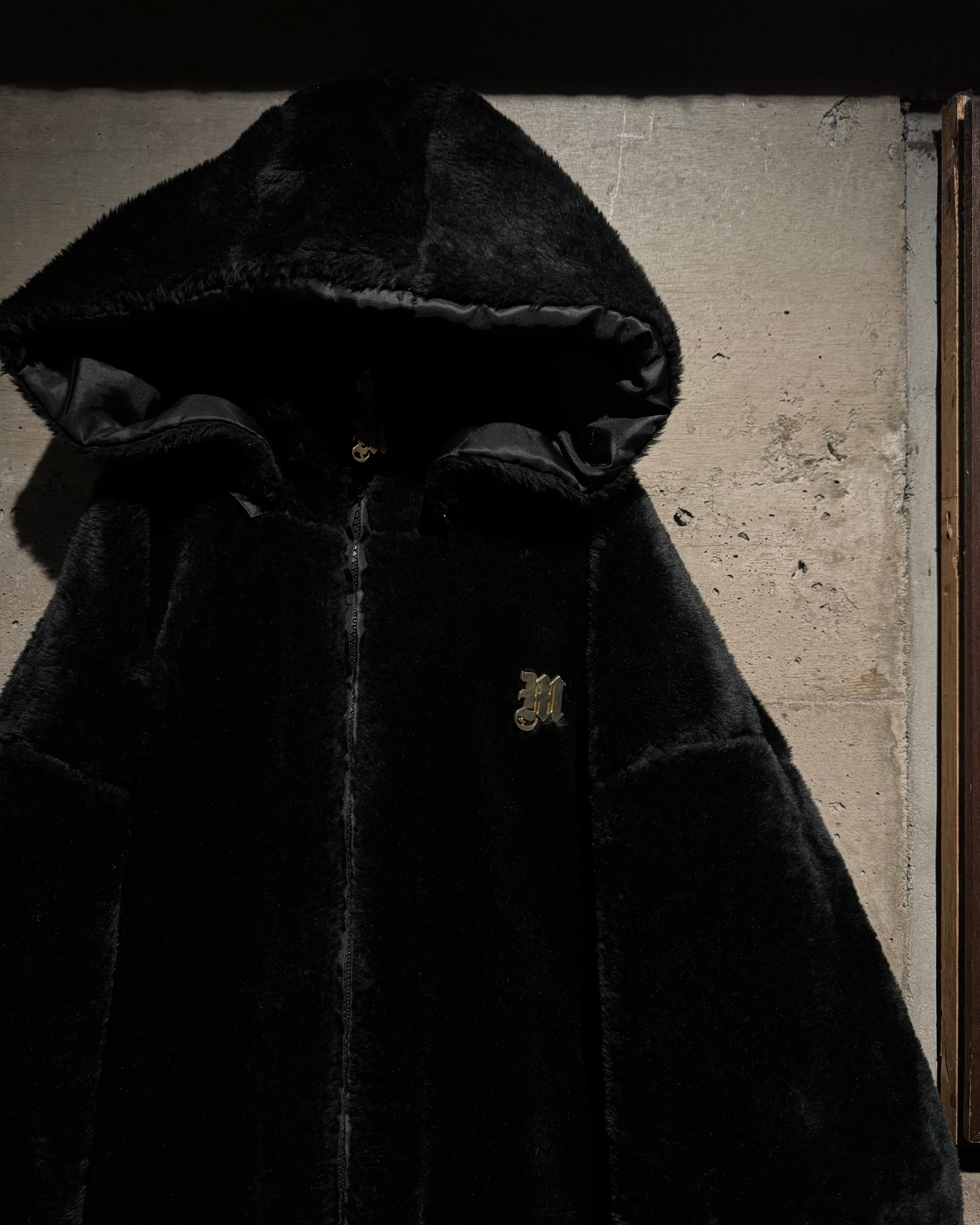 表面は毛足の長いフェイクファー。胸元へ配されたゴールドの“M”がアクセントに。裏返せば表情は一転、ブラックキルティングにゴールドのブランドロゴ刺繍が映える面構えとなり、両面A面の仕上がり。さらにフードは着脱可能 で、スタイリングに合わせてシルエットを自在に変化できる点も魅力。