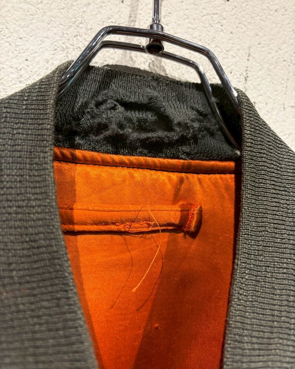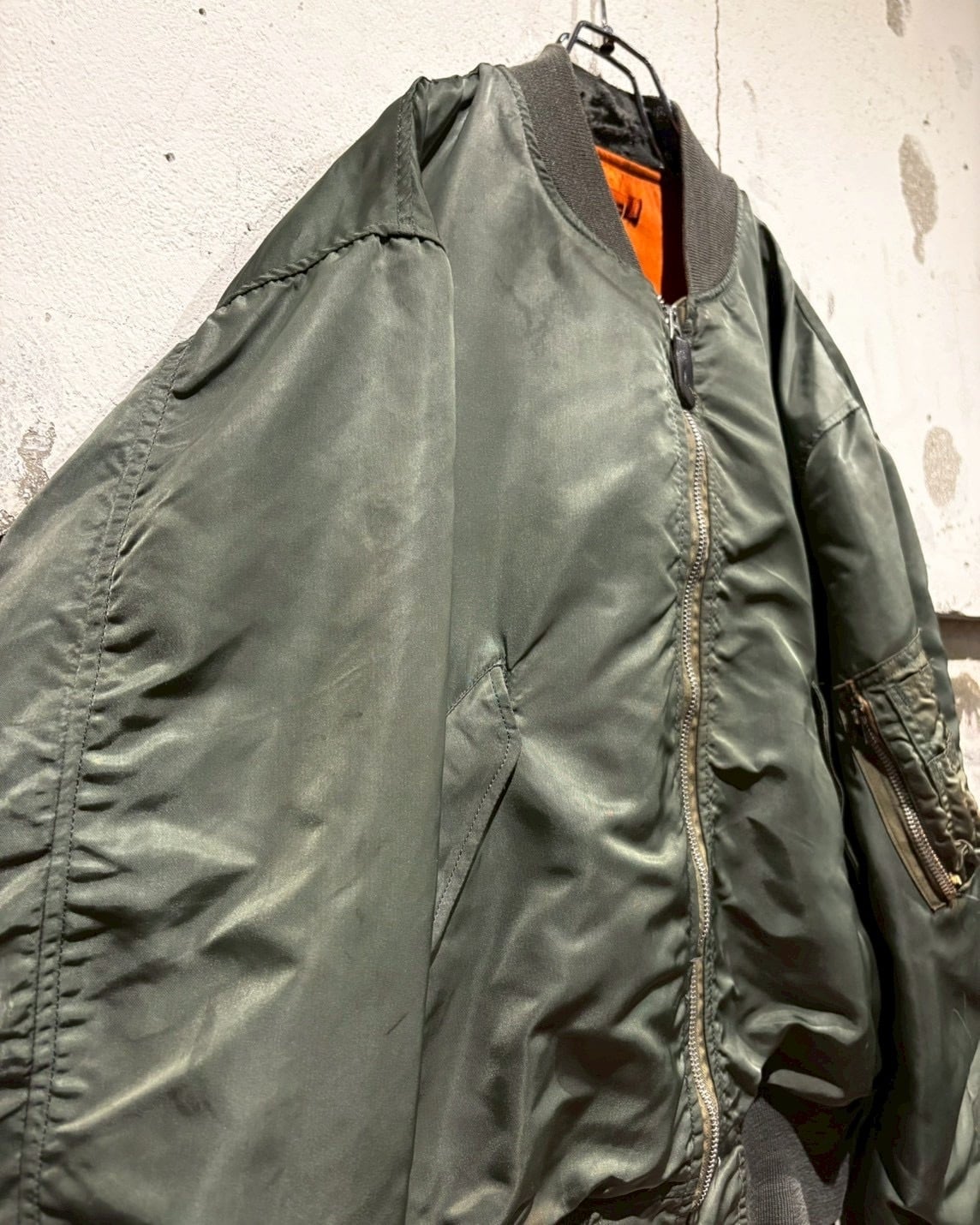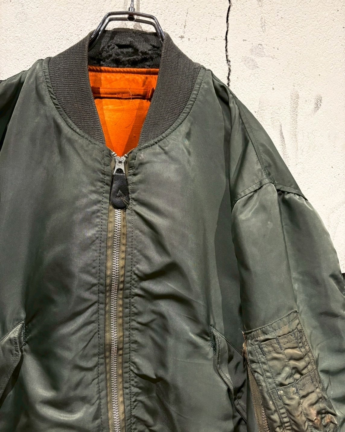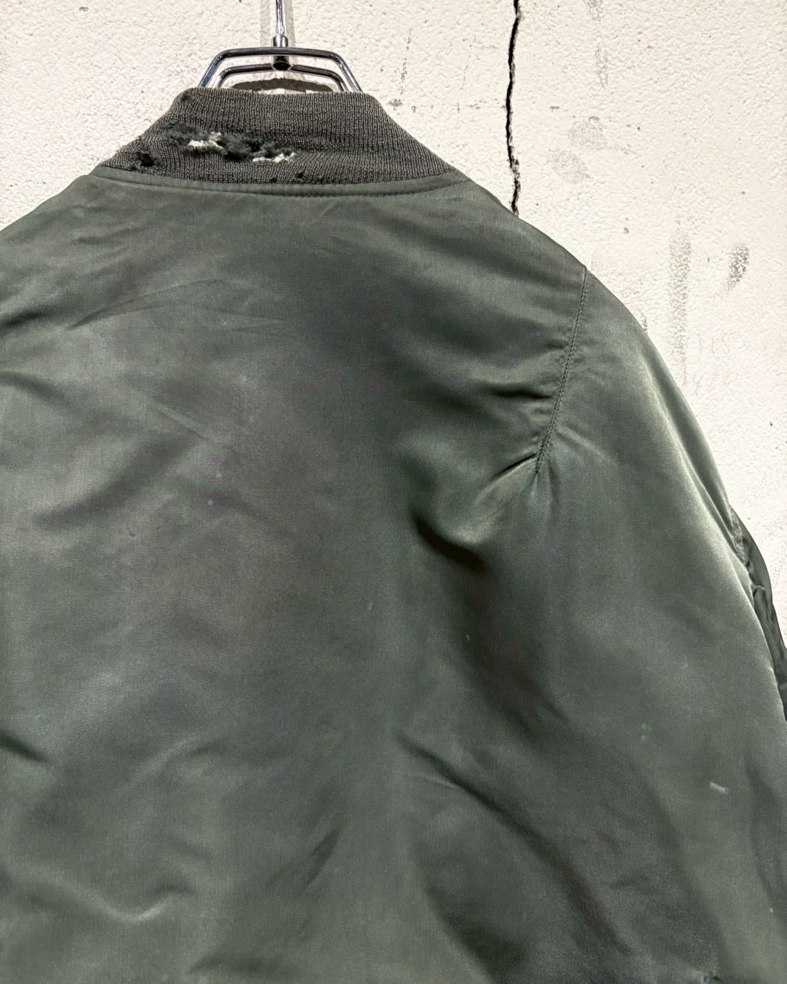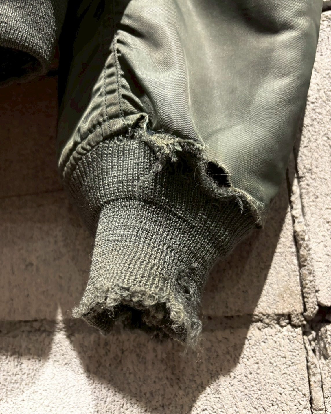 王道のセージグリーンに、鮮烈なオレンジライニング。フライトジャケットの象徴である L-2Bですが、この個体は“ダメージの入り方”がとにかく別格。