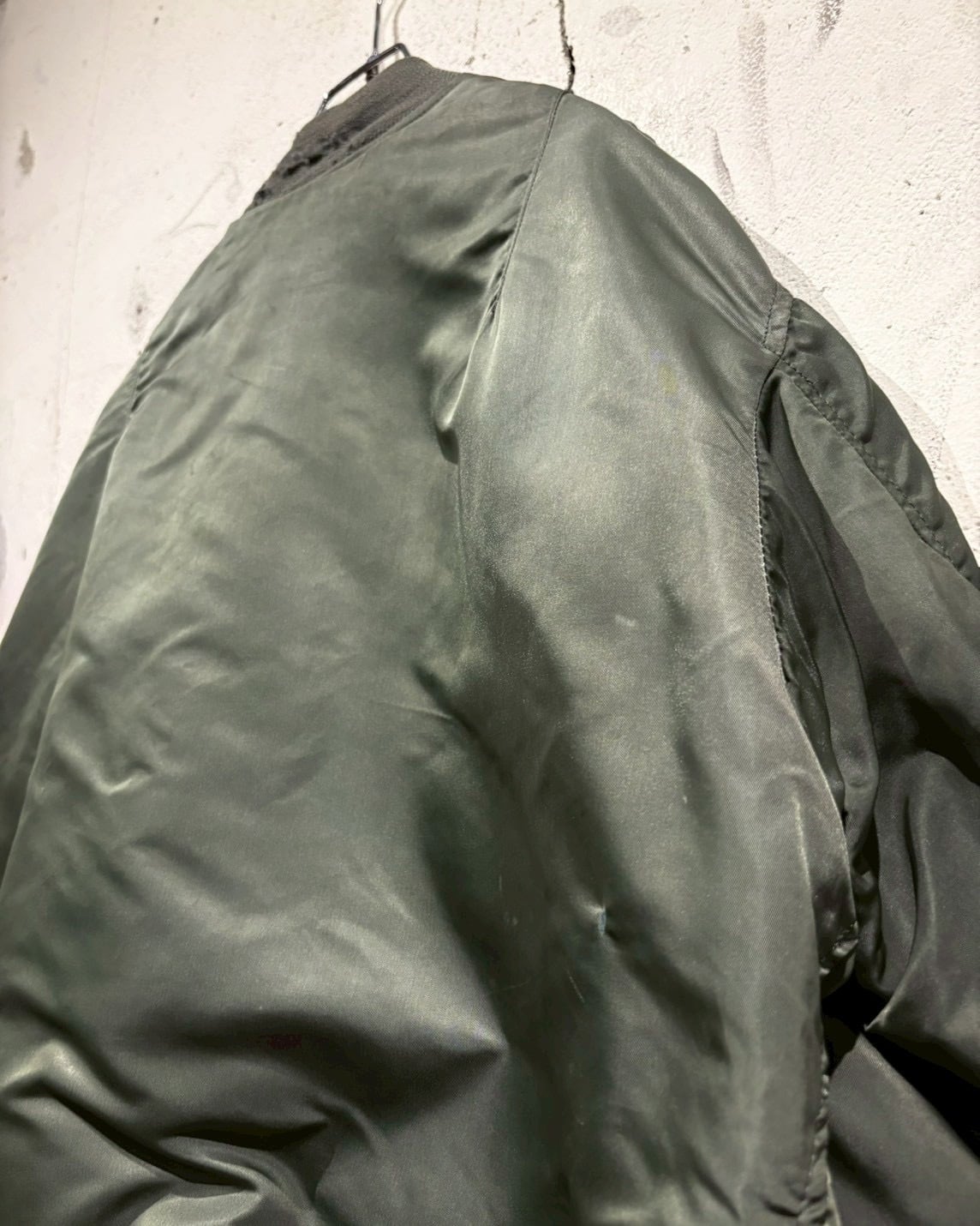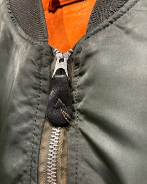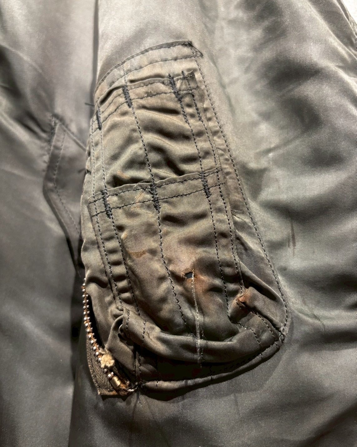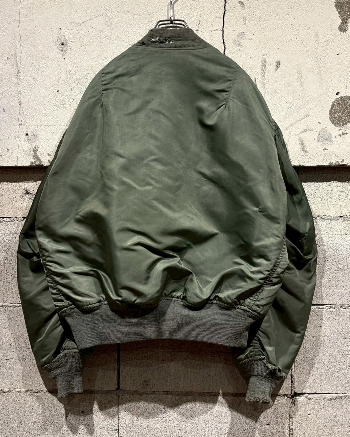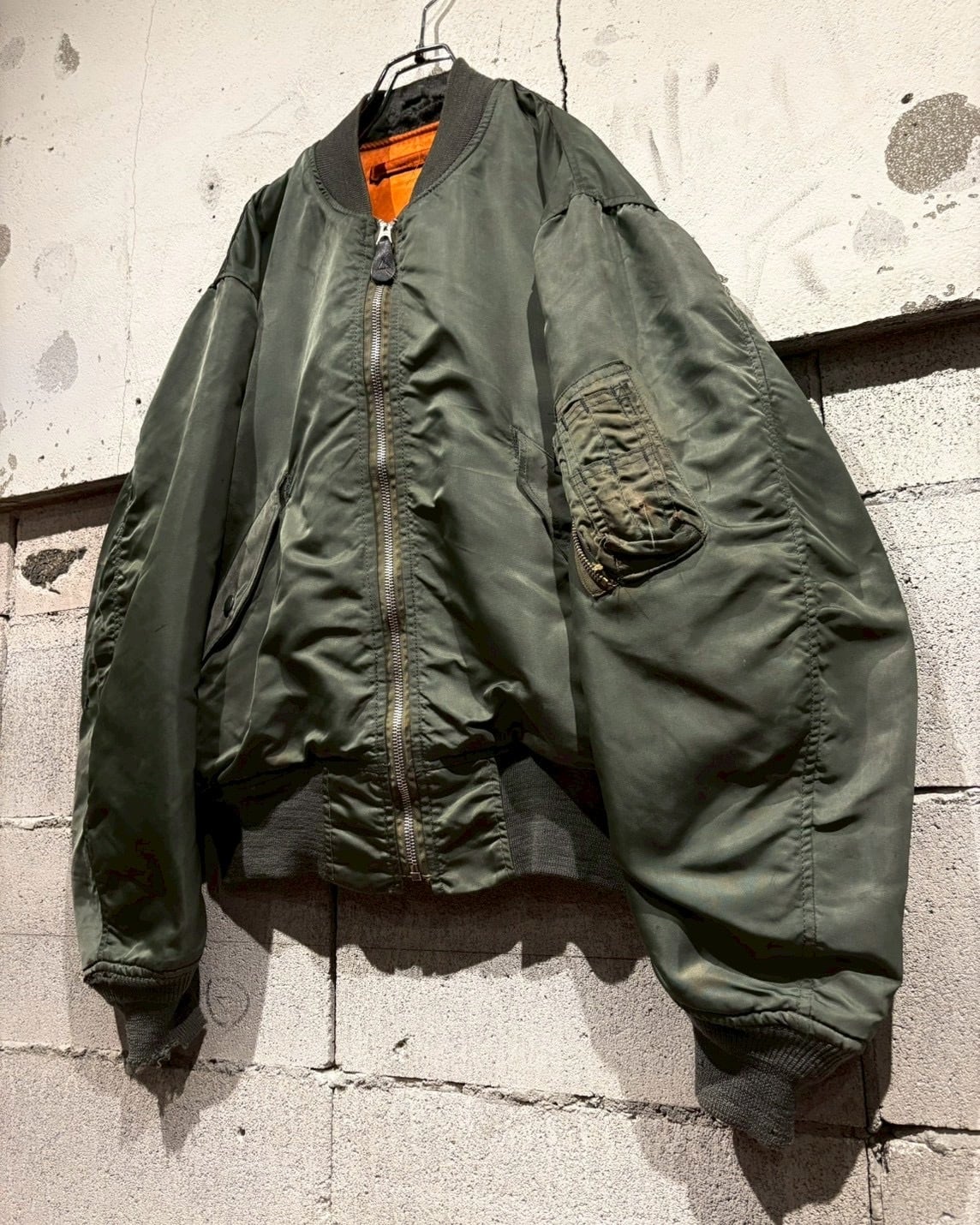 王道のセージグリーンに、鮮烈なオレンジライニング。フライトジャケットの象徴である L-2Bですが、この個体は“ダメージの入り方”がとにかく別格。