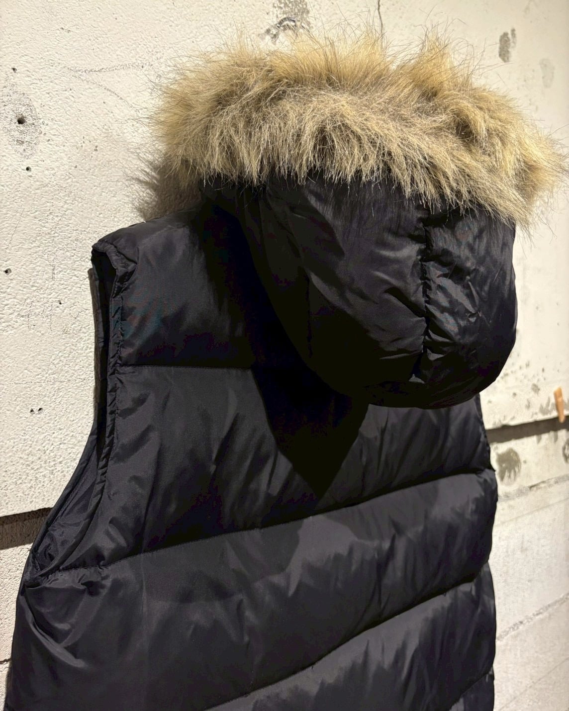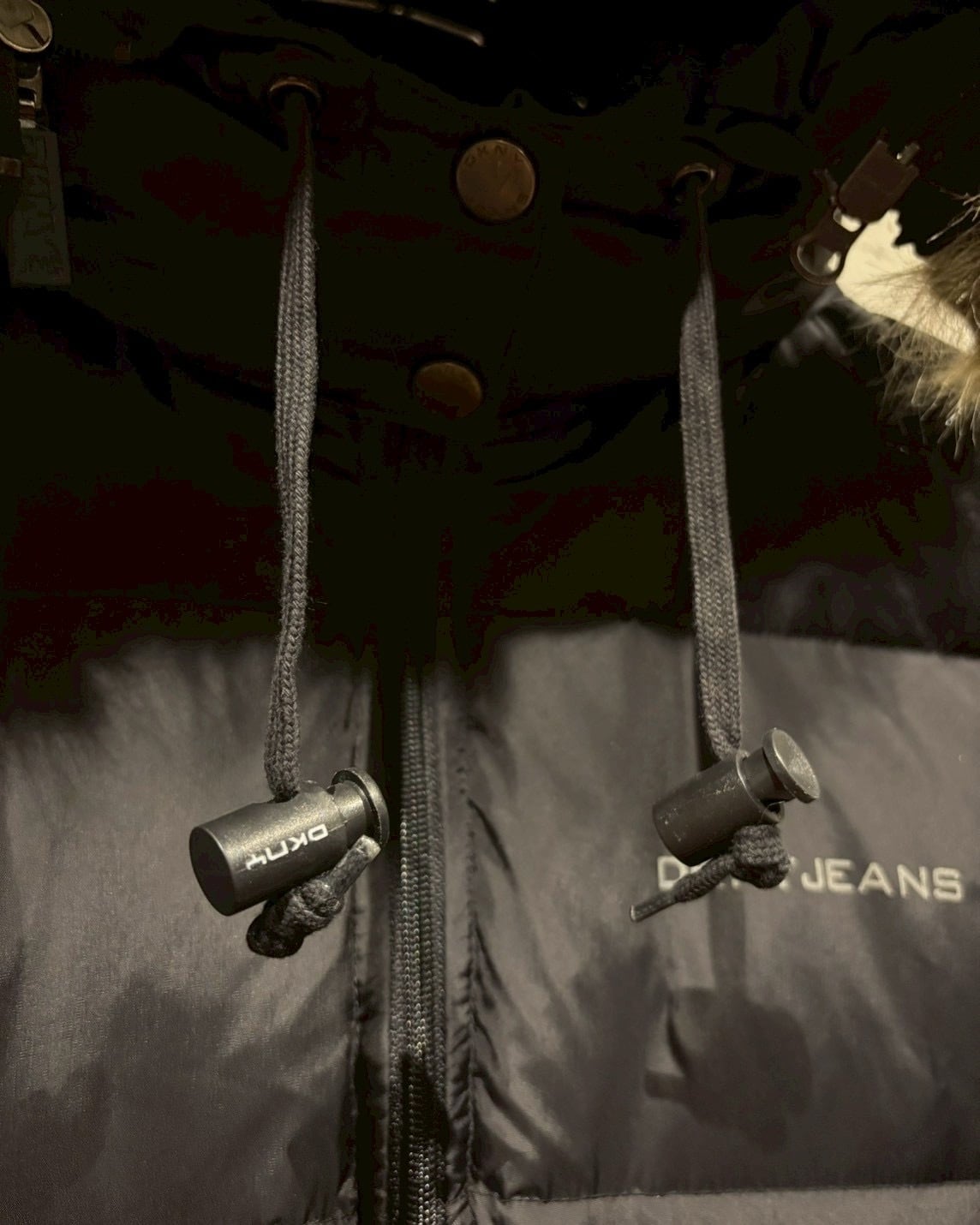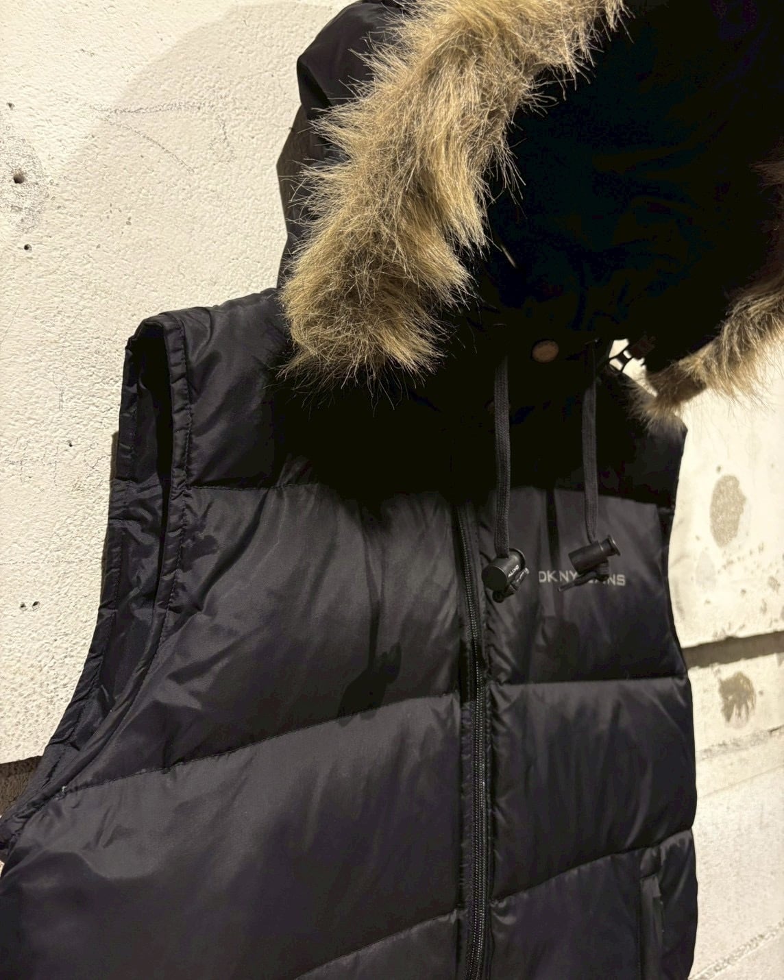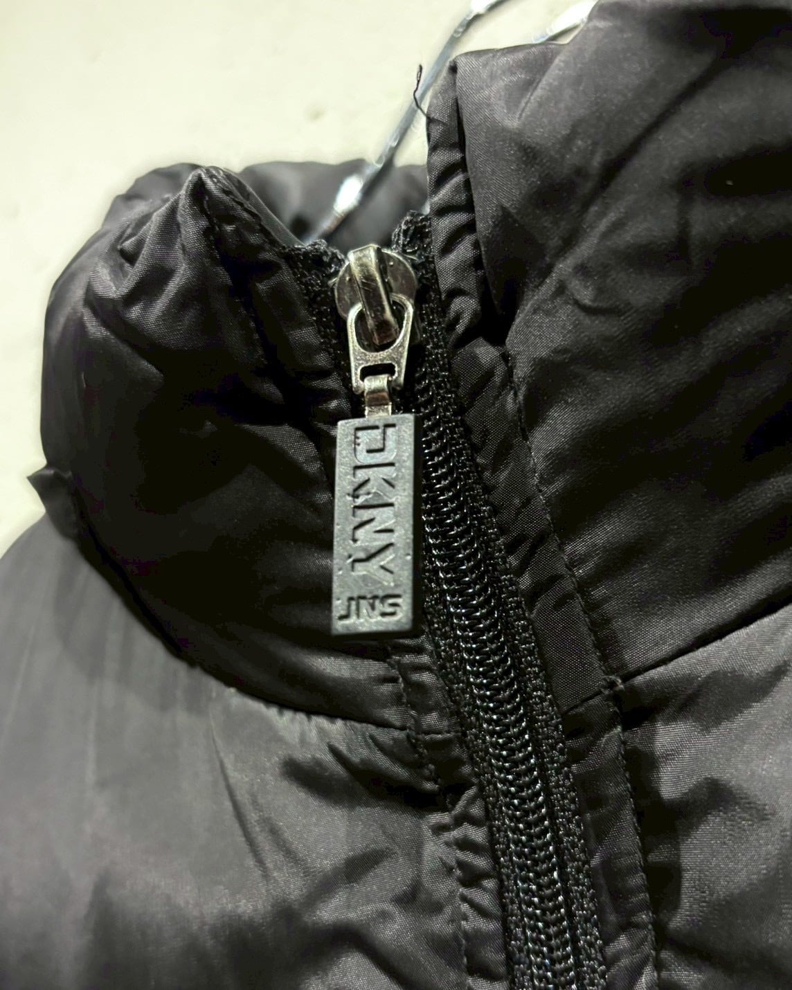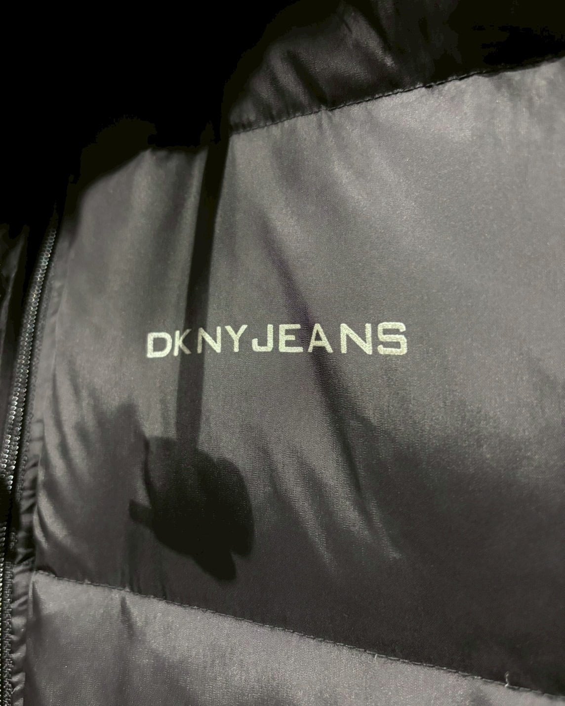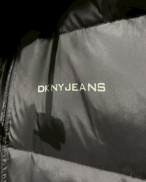 ブラックナイロンのマットな質感に、胸元の“DKNY JEANS”ロゴがさりげなく映えるミニマルなデザイン。中綿はダックダウン × フェザーで、見た目以上に軽く暖かく仕上がっています。