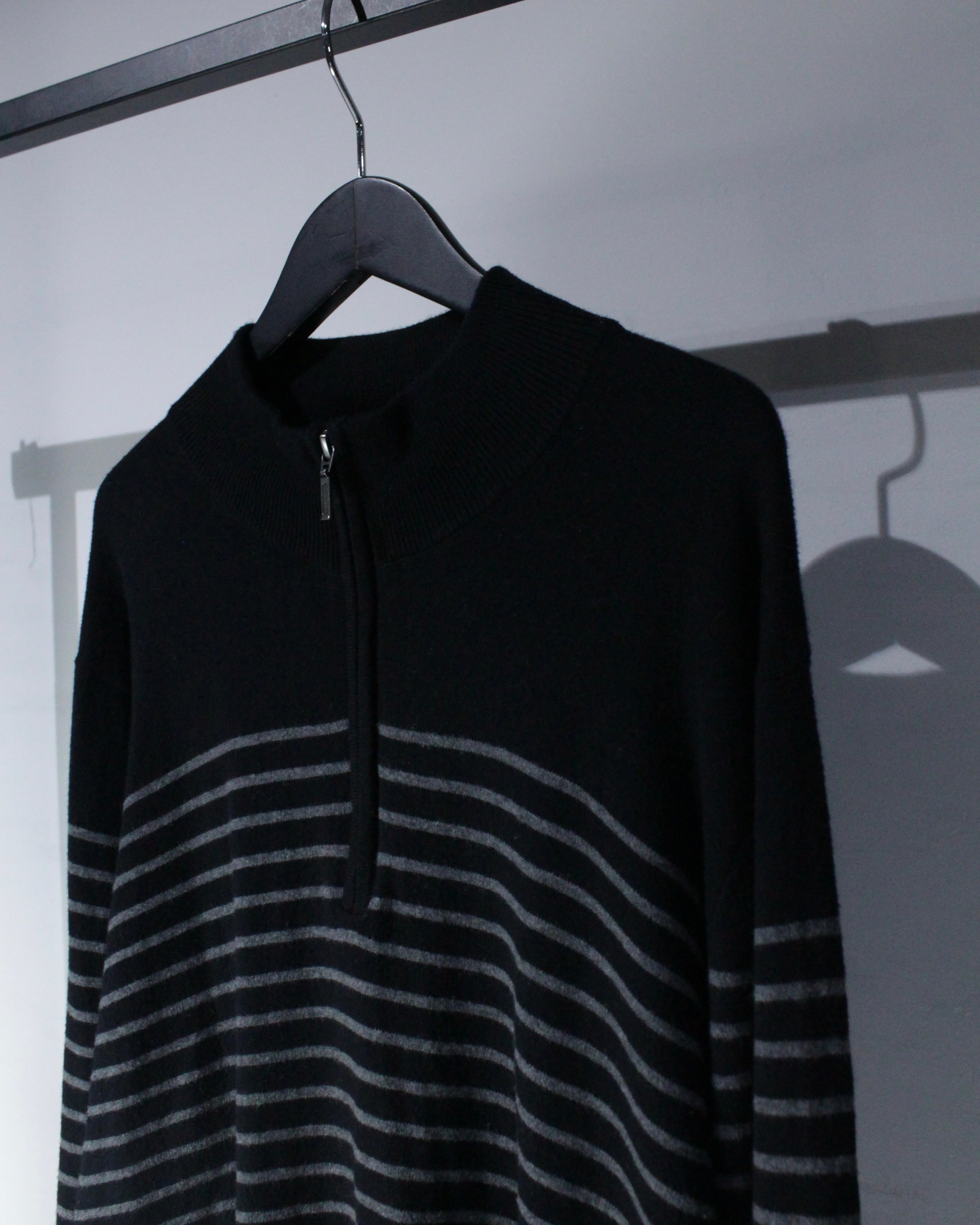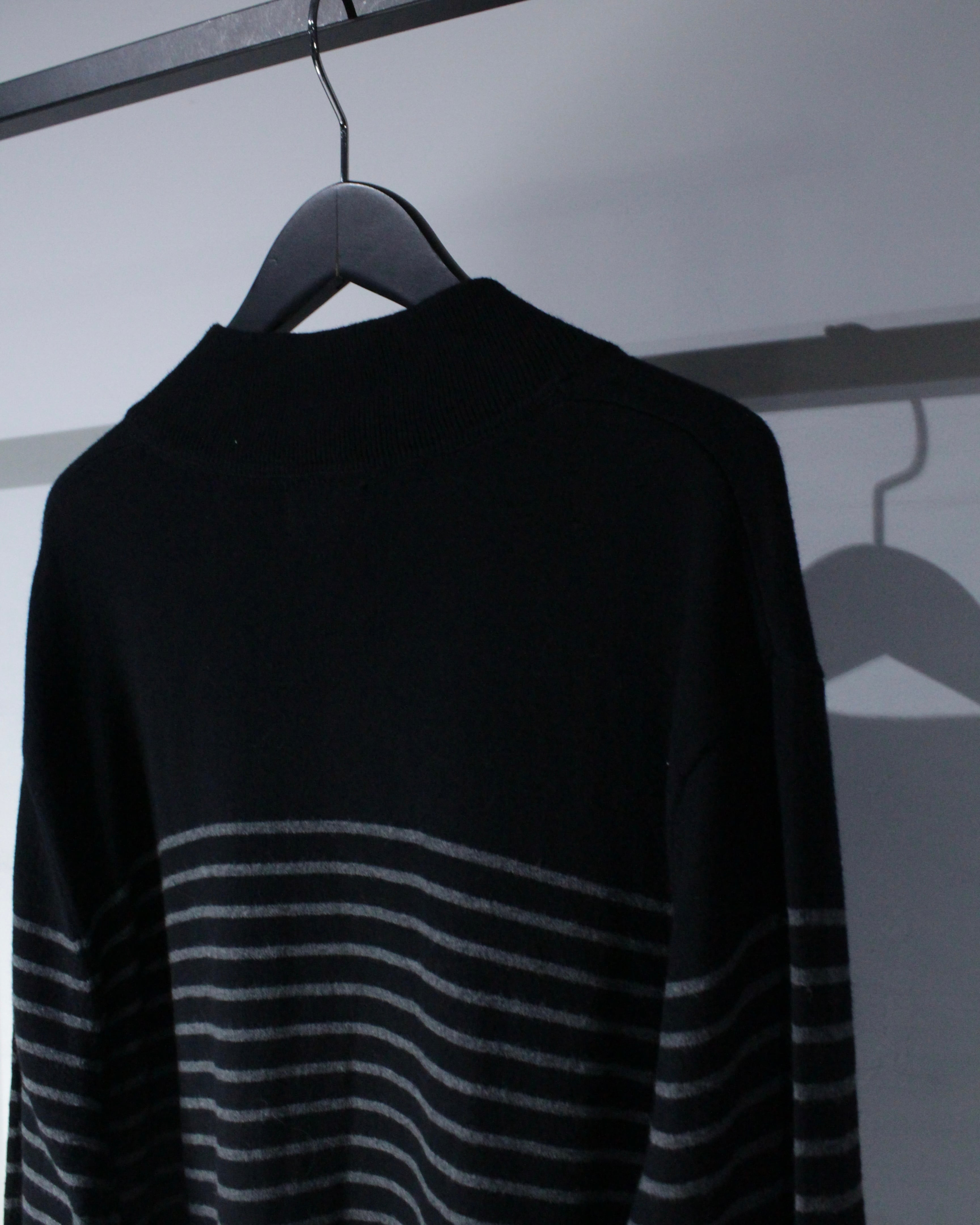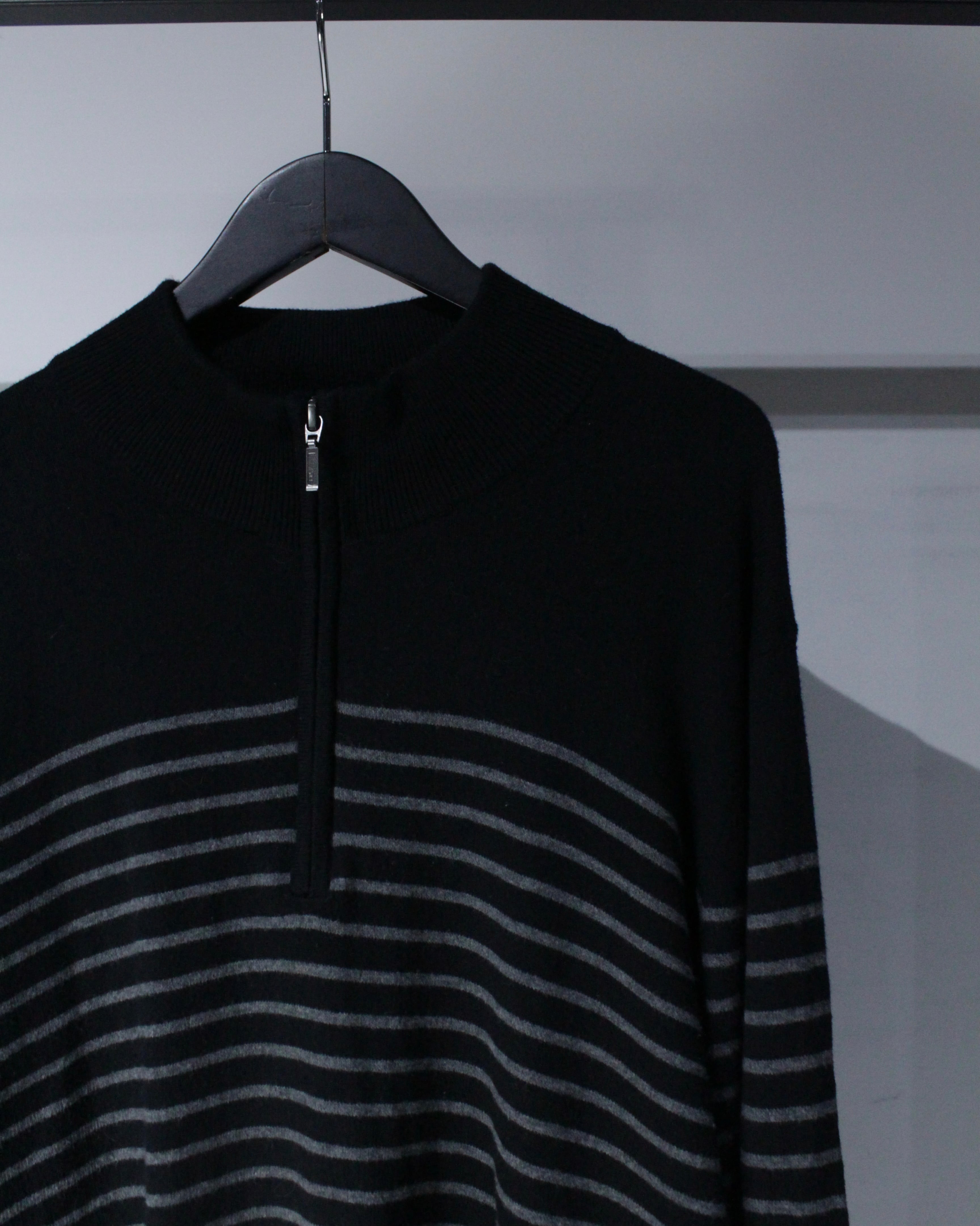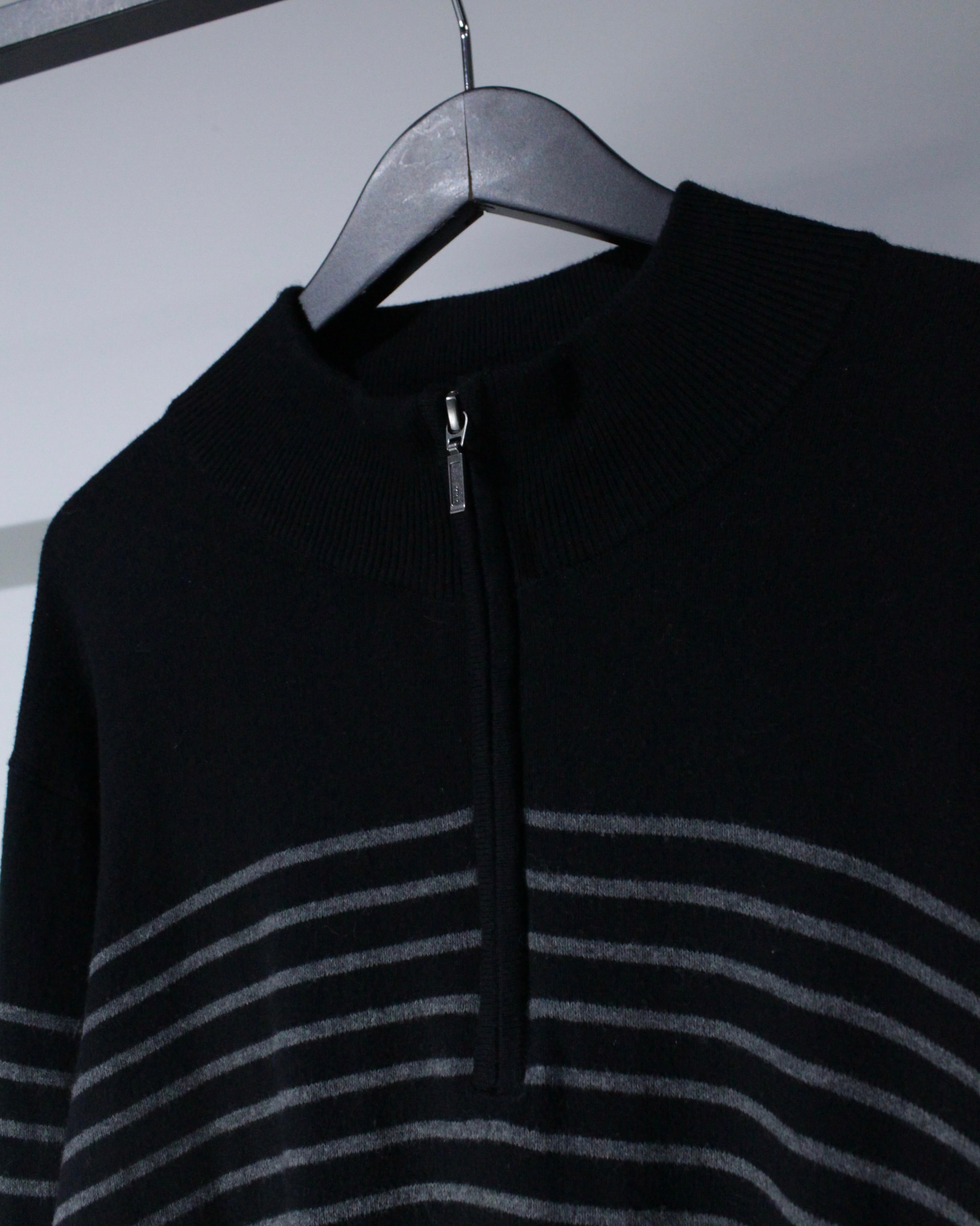 ブラックをベースにチャコールグレーのボーダーを走らせたミニマルなパターン。首元はハーフジップ仕様で、閉めれば上品に、開ければラフにと、スタイリングで表情を変えられます。