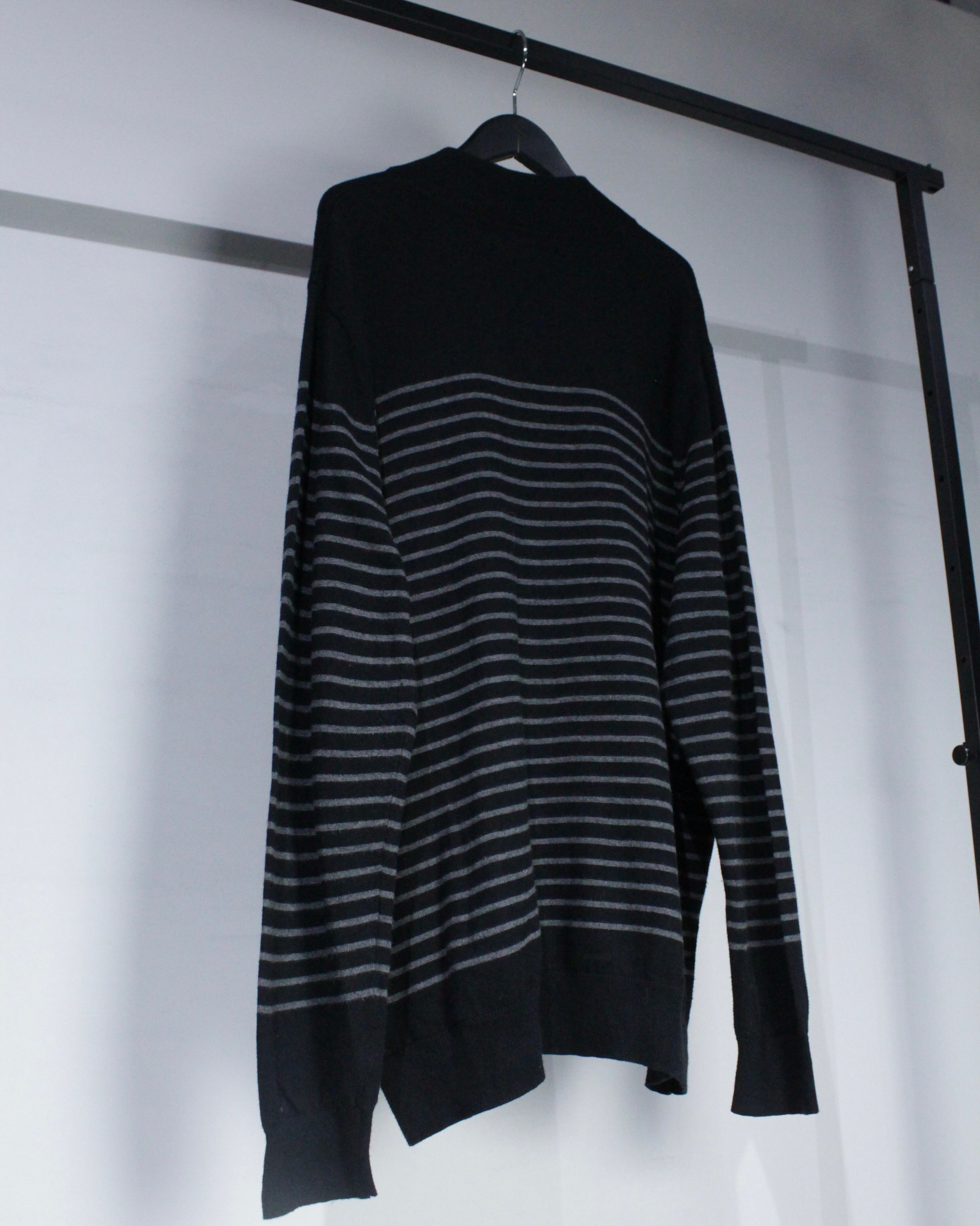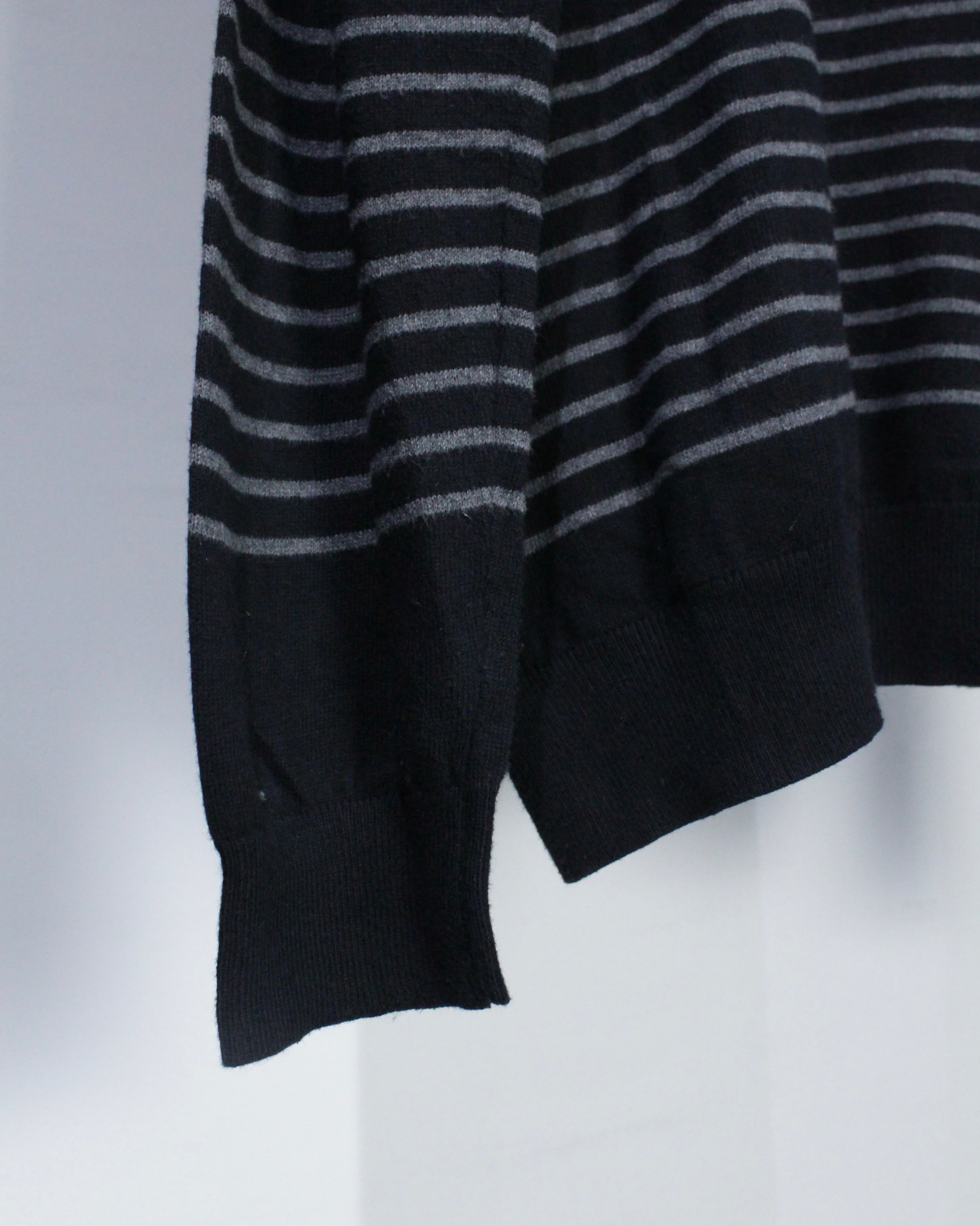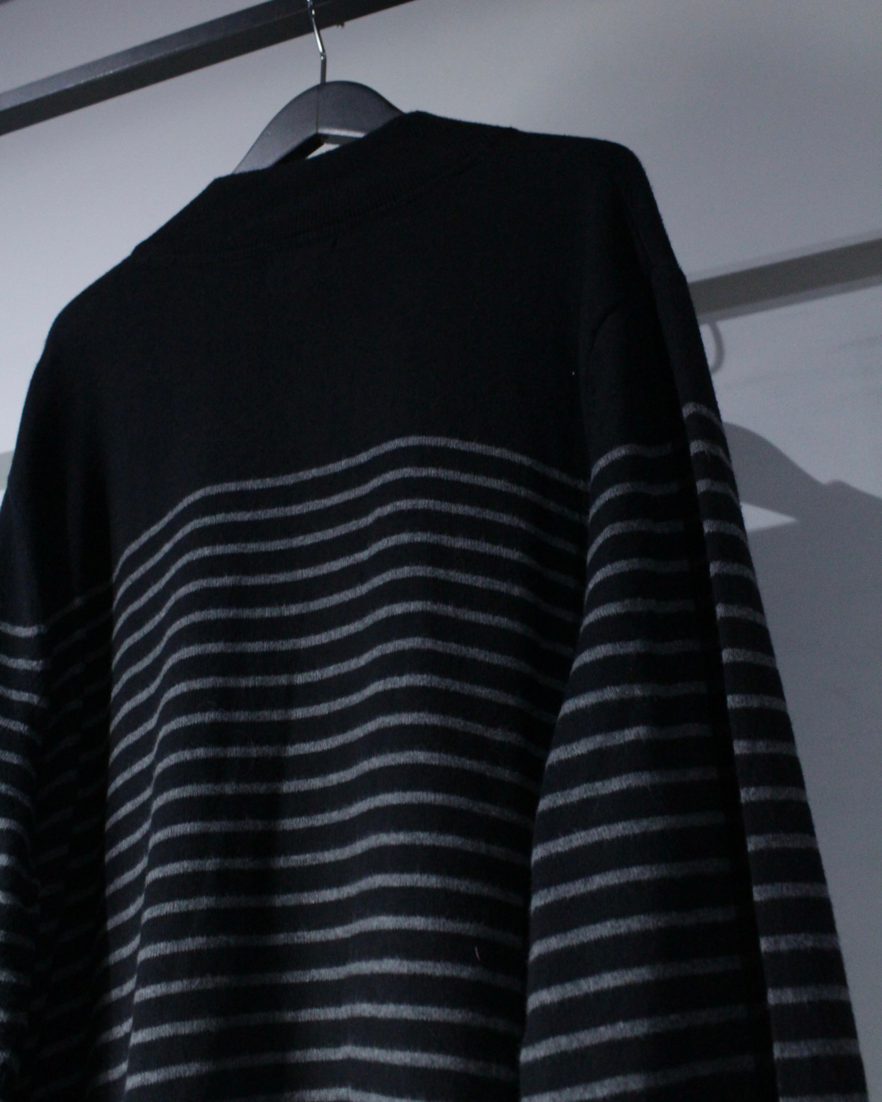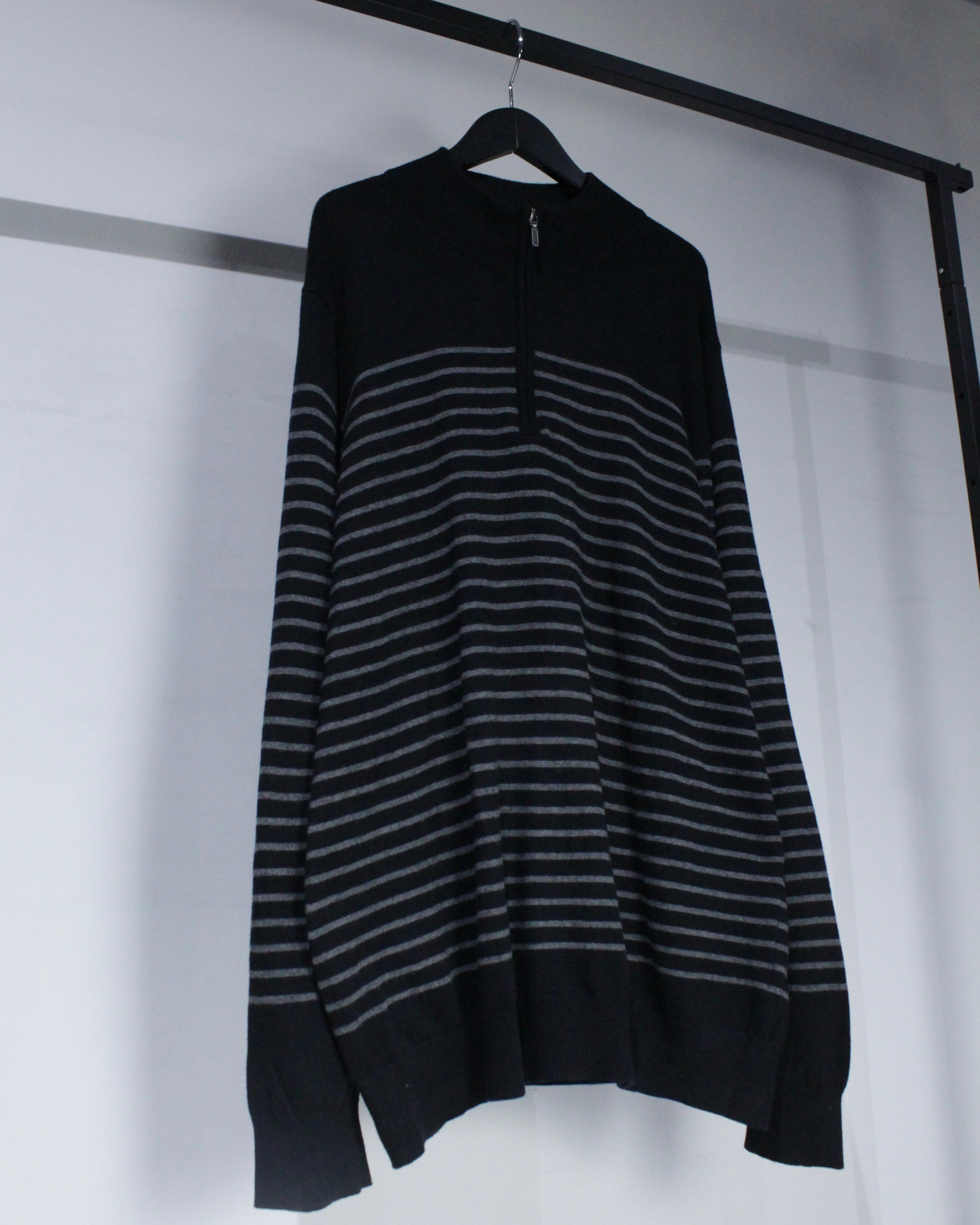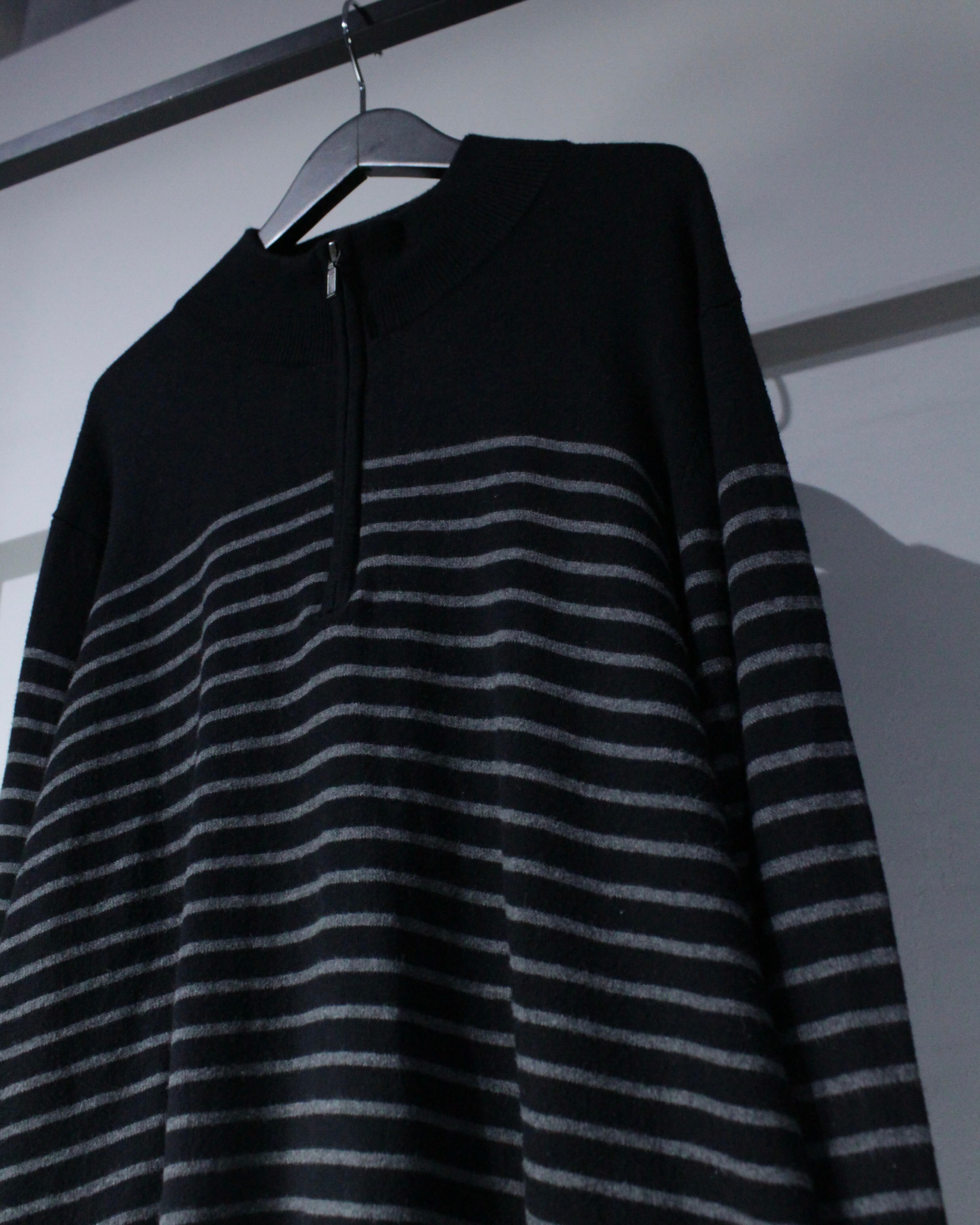 ブラックをベースにチャコールグレーのボーダーを走らせたミニマルなパターン。首元はハーフジップ仕様で、閉めれば上品に、開ければラフにと、スタイリングで表情を変えられます。