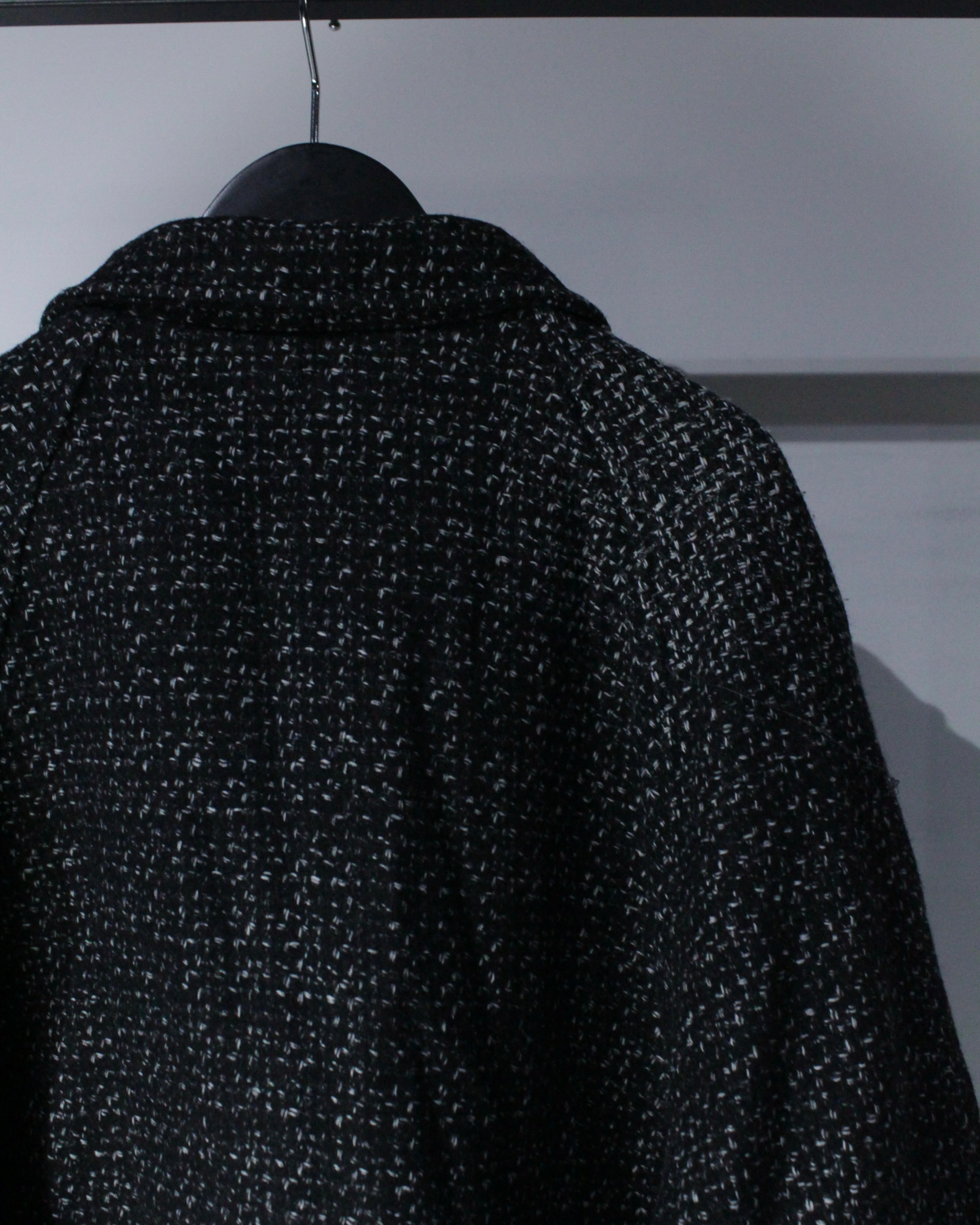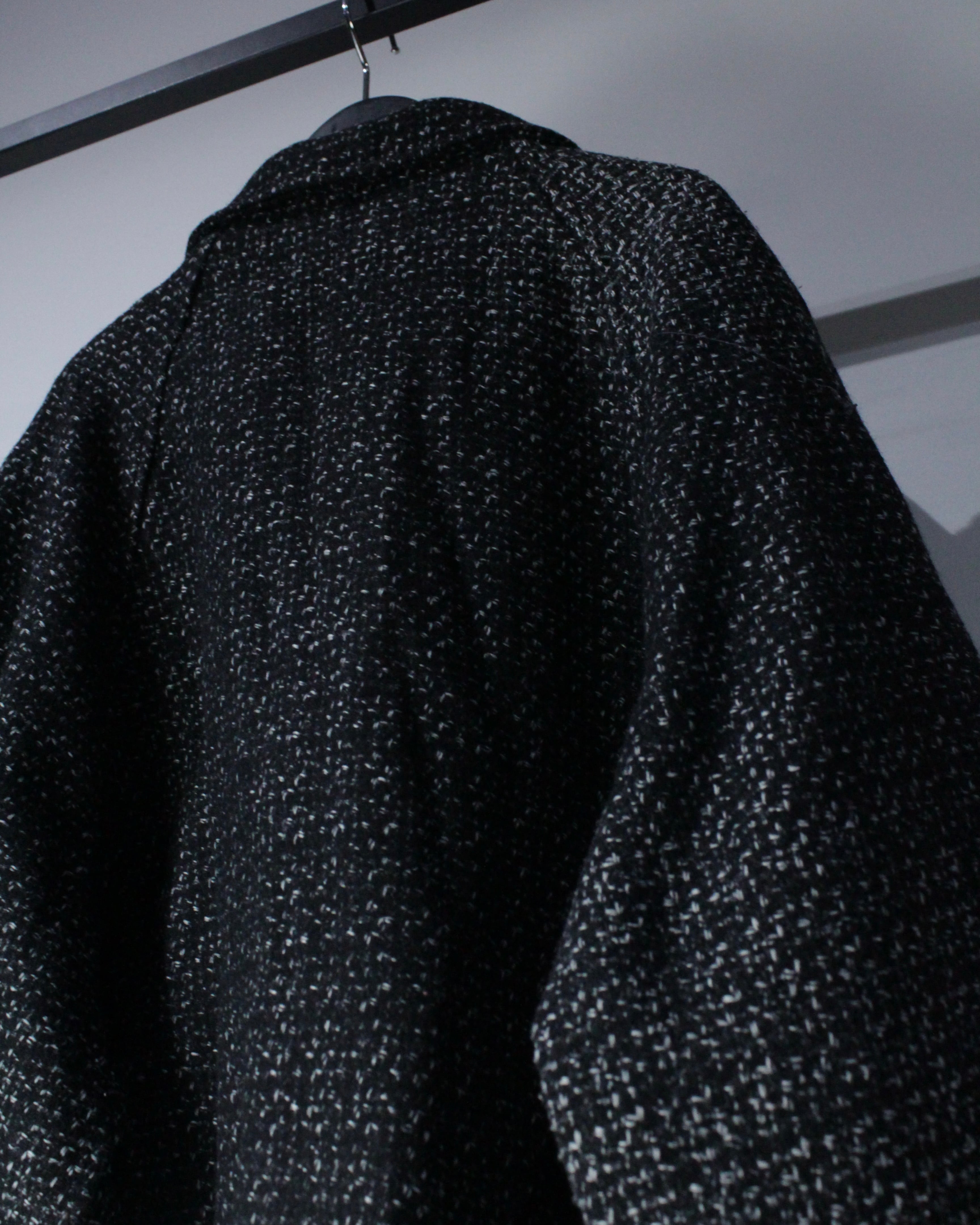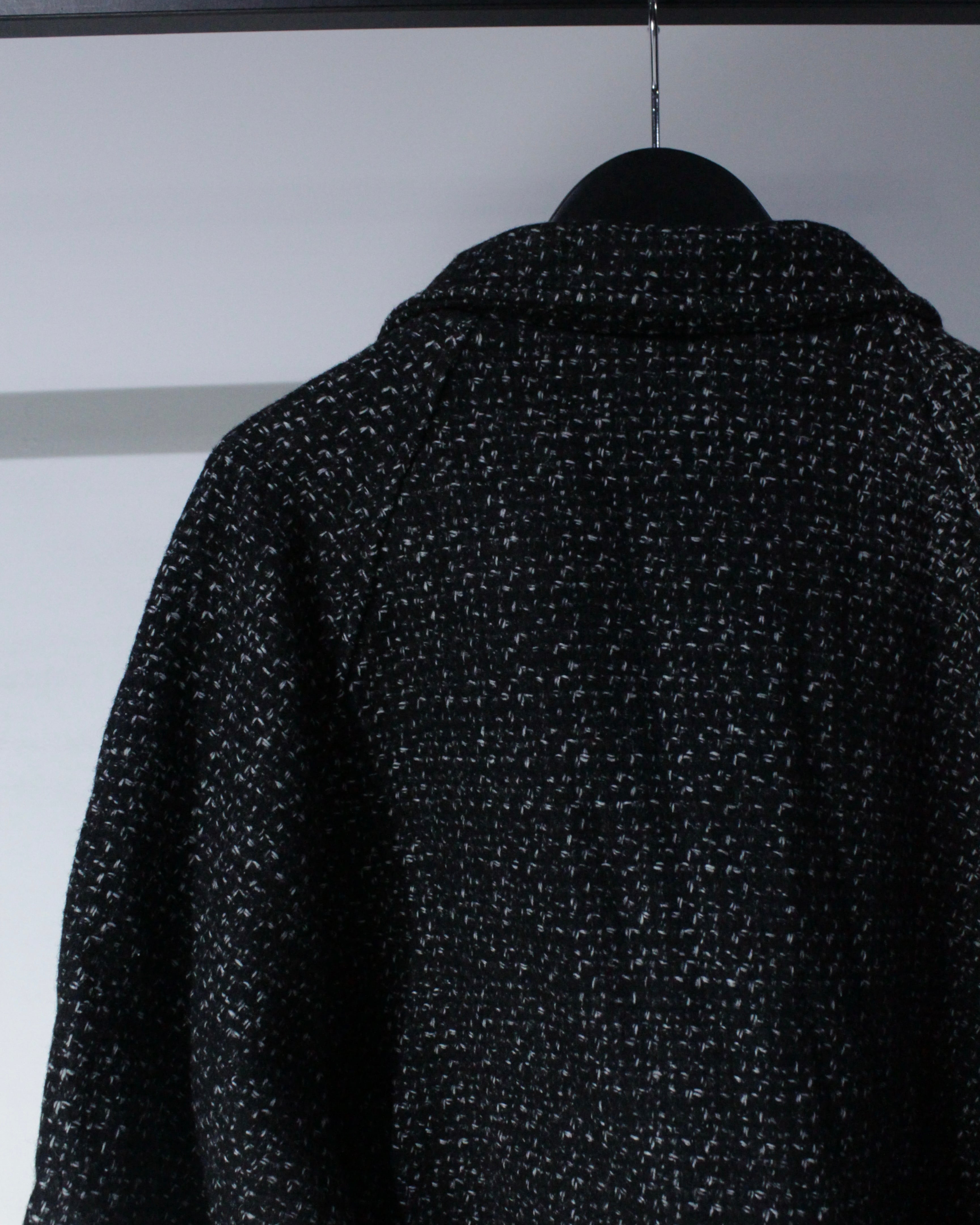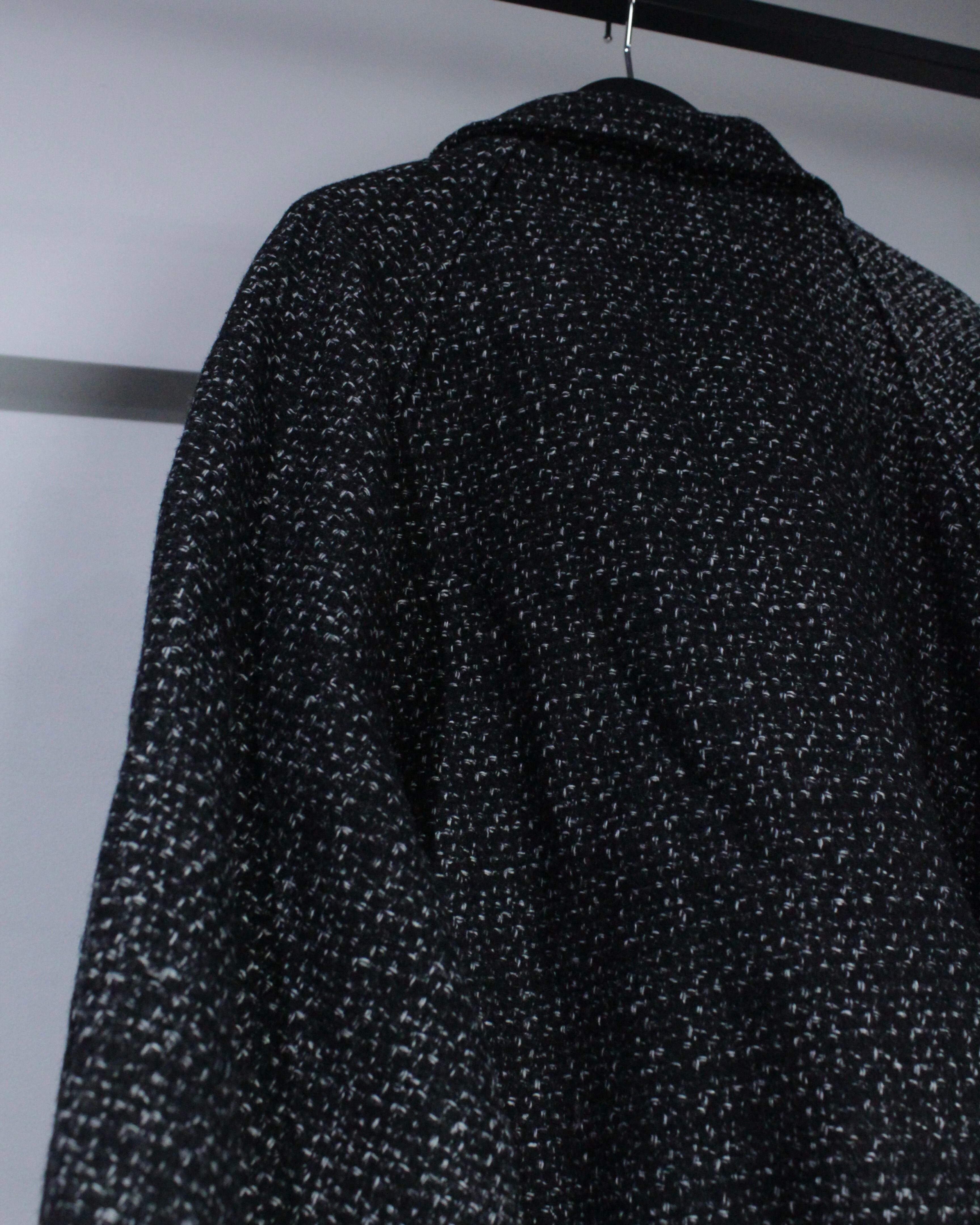 ダークトーンのツイードは細かな白糸が混ざることで独特の表情を生み、ざらっとした質感と深みのある陰影が魅力。重さを感じさせない柔らかな風合いで、冬の重衣類として抜群の存在感を放ちます。