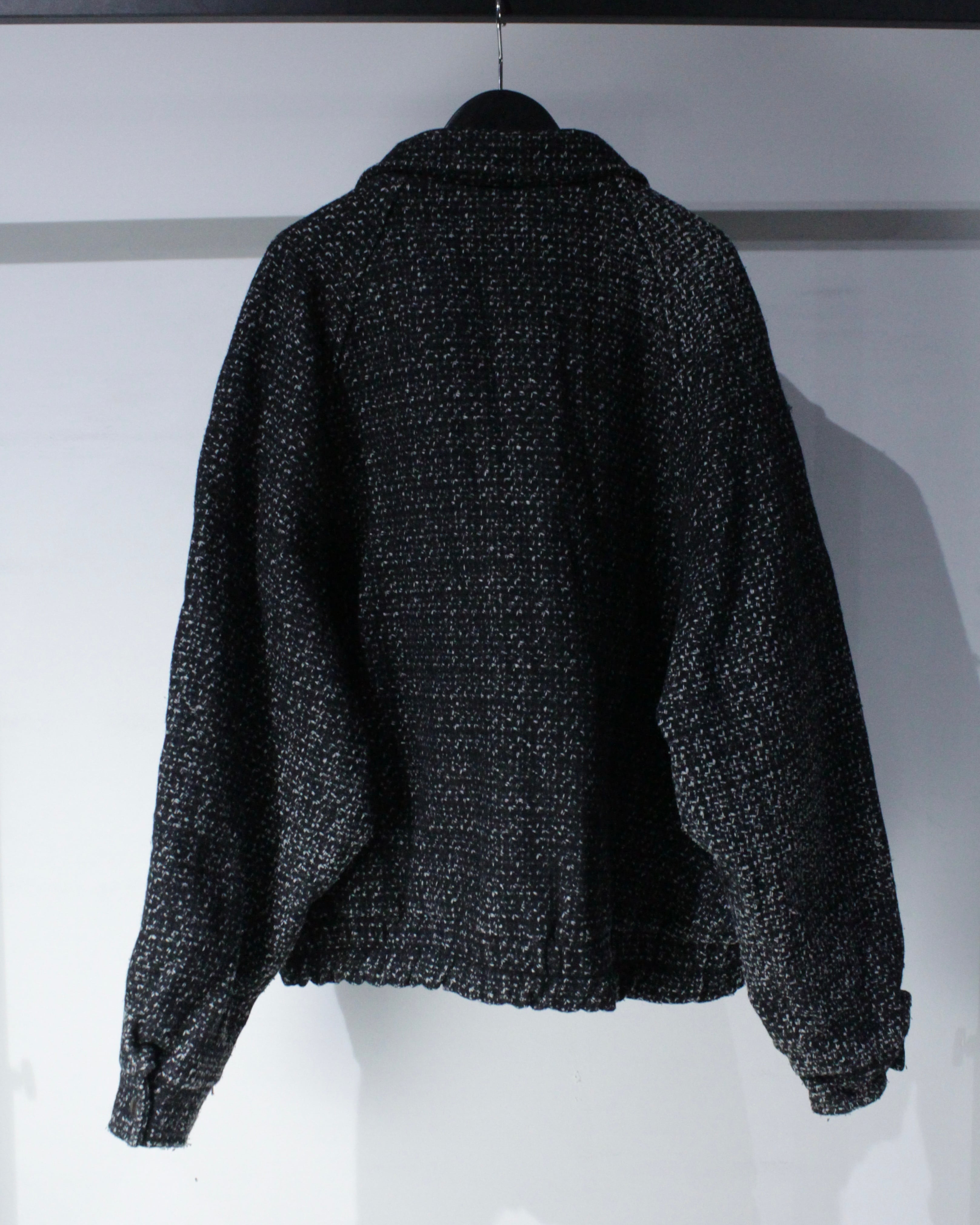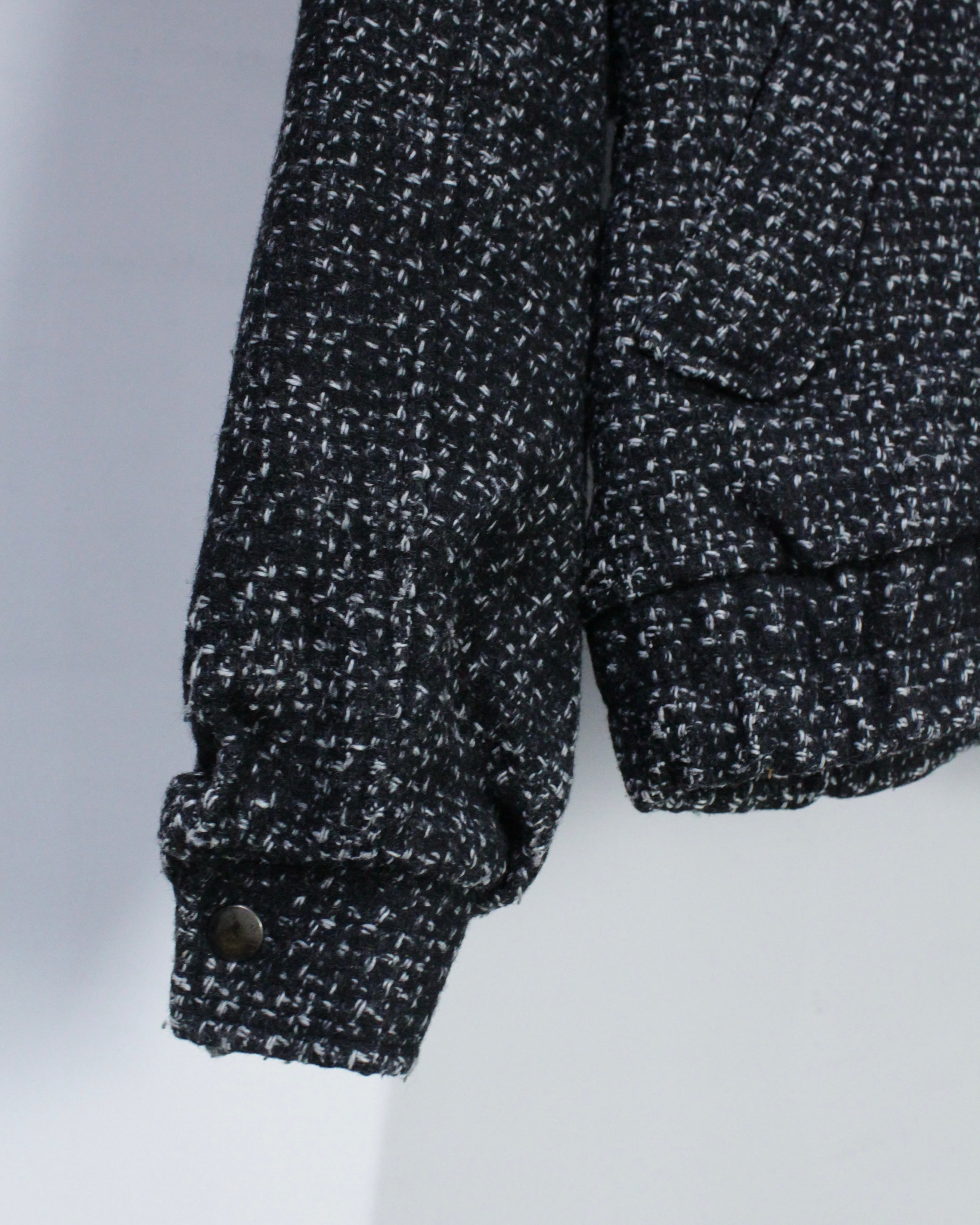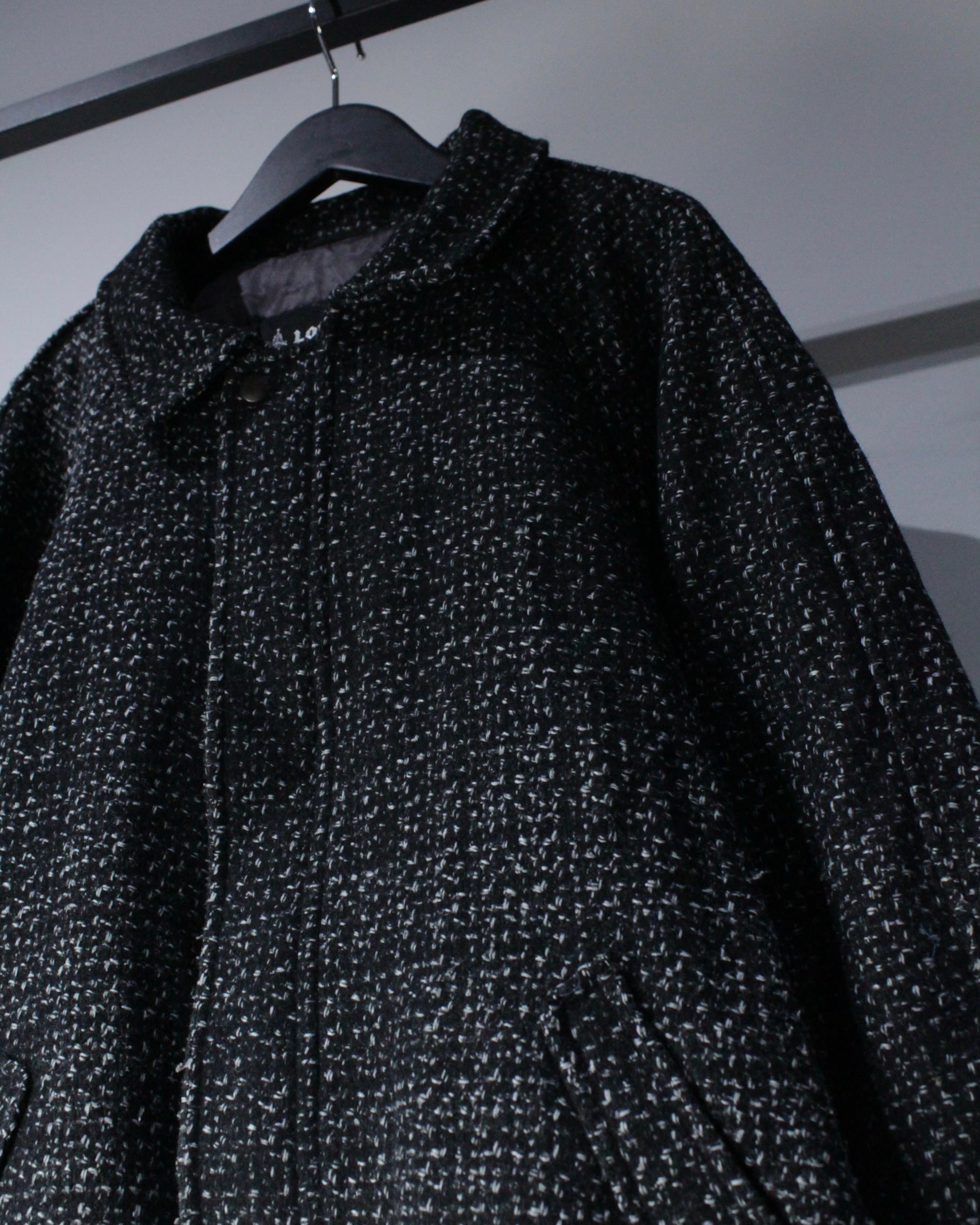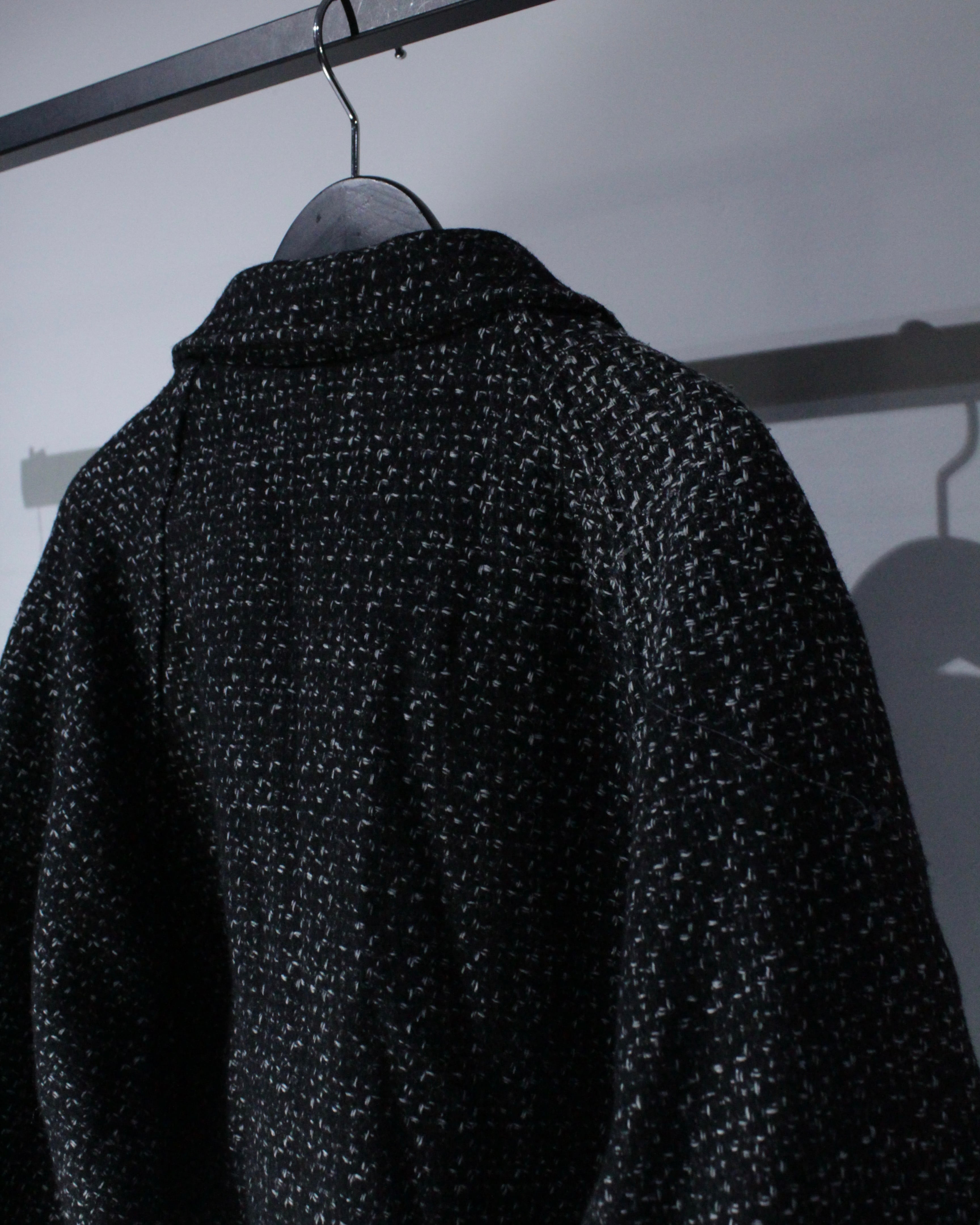 ダークトーンのツイードは細かな白糸が混ざることで独特の表情を生み、ざらっとした質感と深みのある陰影が魅力。重さを感じさせない柔らかな風合いで、冬の重衣類として抜群の存在感を放ちます。